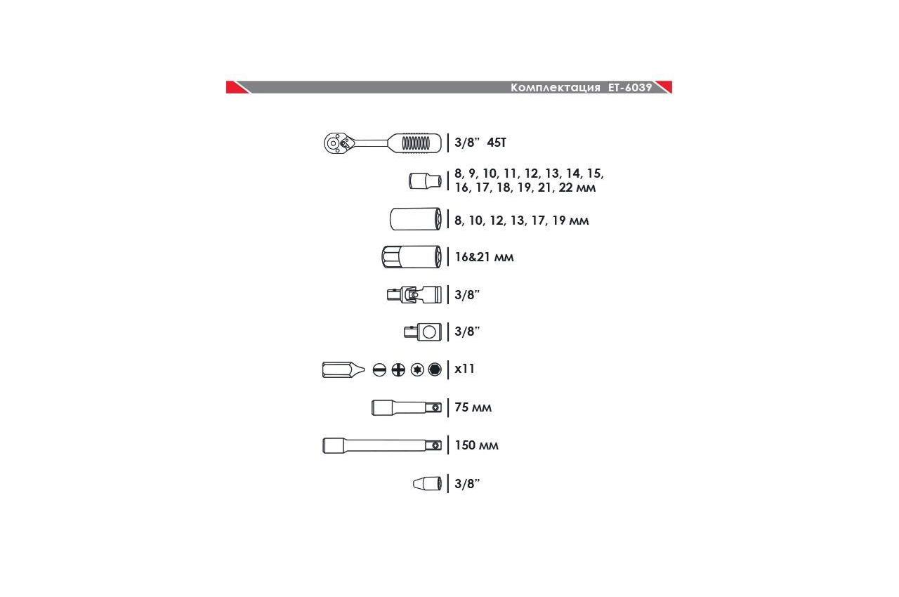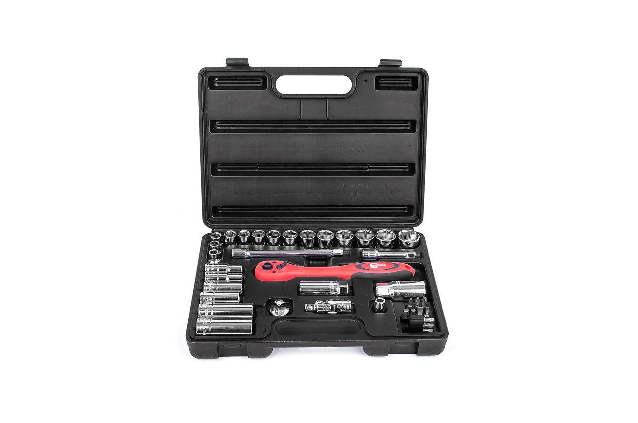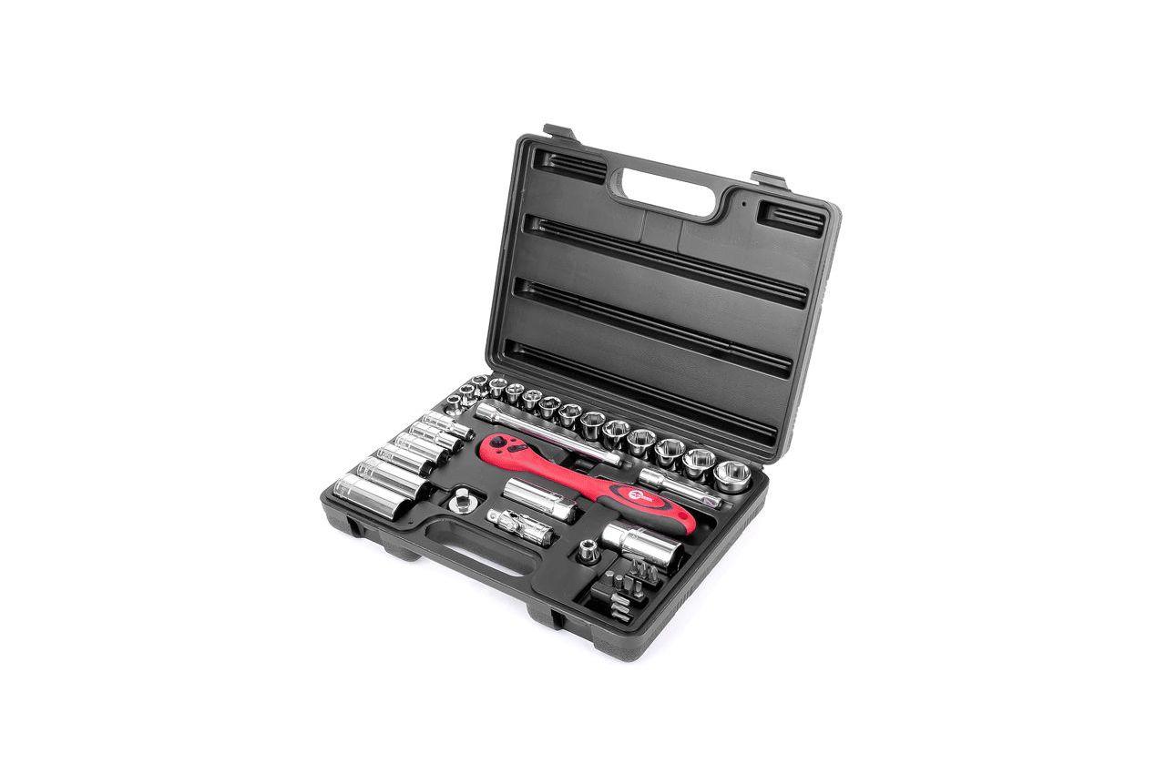 Професійний набір інструментів включає в себе 39 одиниць інструменту, укомплектовані в кейс з ударостійкого пластику. Використаний розмір квадрата - 3/8 ". Всі інструменти виготовлені з хром-ванадієвої сталі підвищеної міцності зі спеціальним покриттям, що захищає від корозії. Цей набір є ідеальним помічником в обслуговуванні автомобіля. На окрему увагу заслуговує рукоятка з храповим механізмом (тріскачка) на 72 зубця з можливістю скидання і фіксації торцевих головок. Вона також виготовлена з хром-ванадієвого стали і при цьому покрита захисним шаром з поліпропілену, повністю запобігає можливість появи корозії. Габаритні розміри: 295х210х70 мм; Квадрат: 3/8 "; Кількість одиниць в наборі: 39 од .; Матеріал валізи: пластик