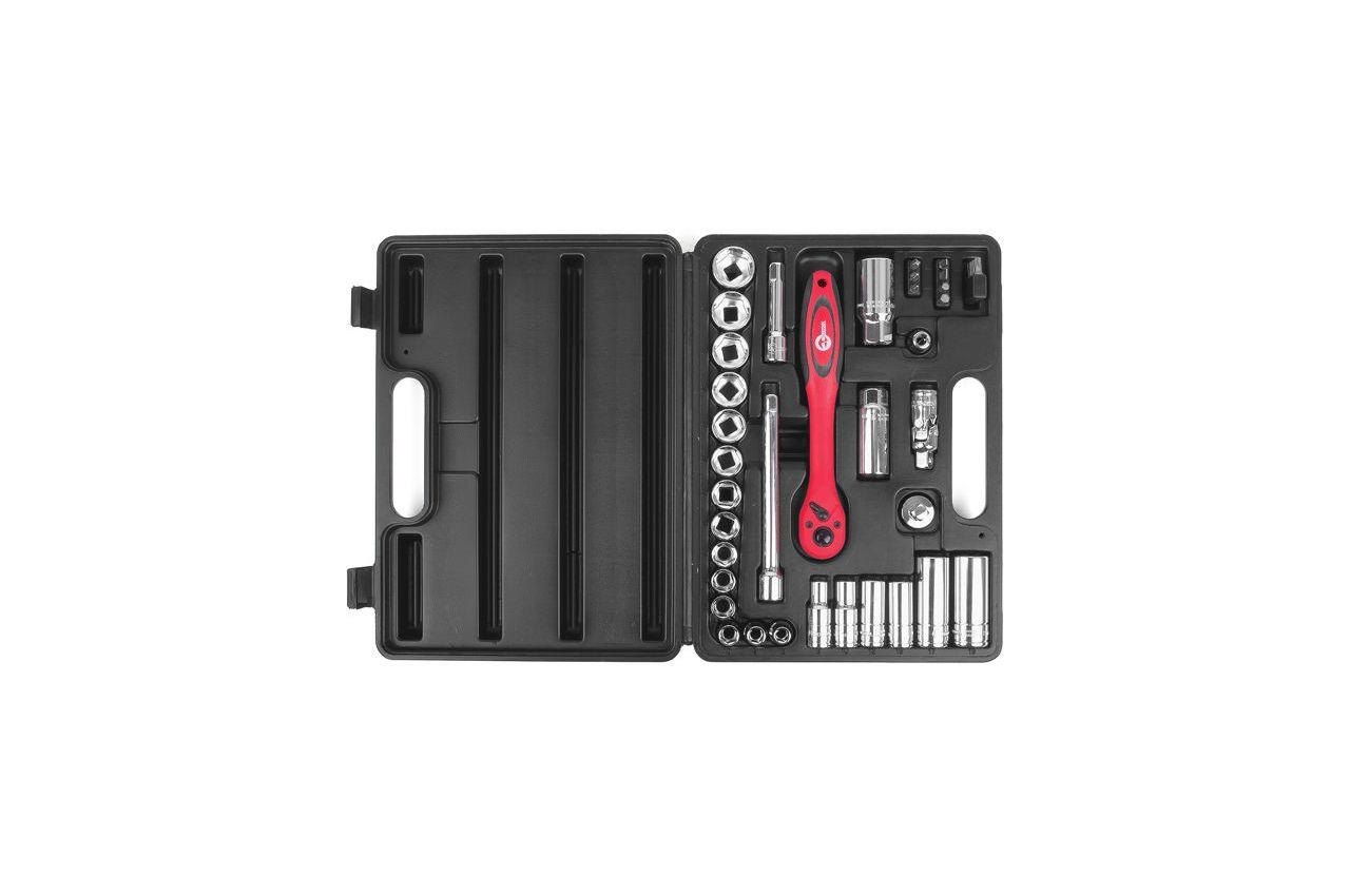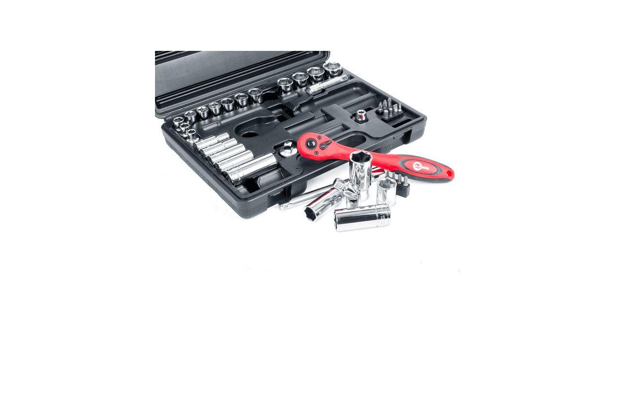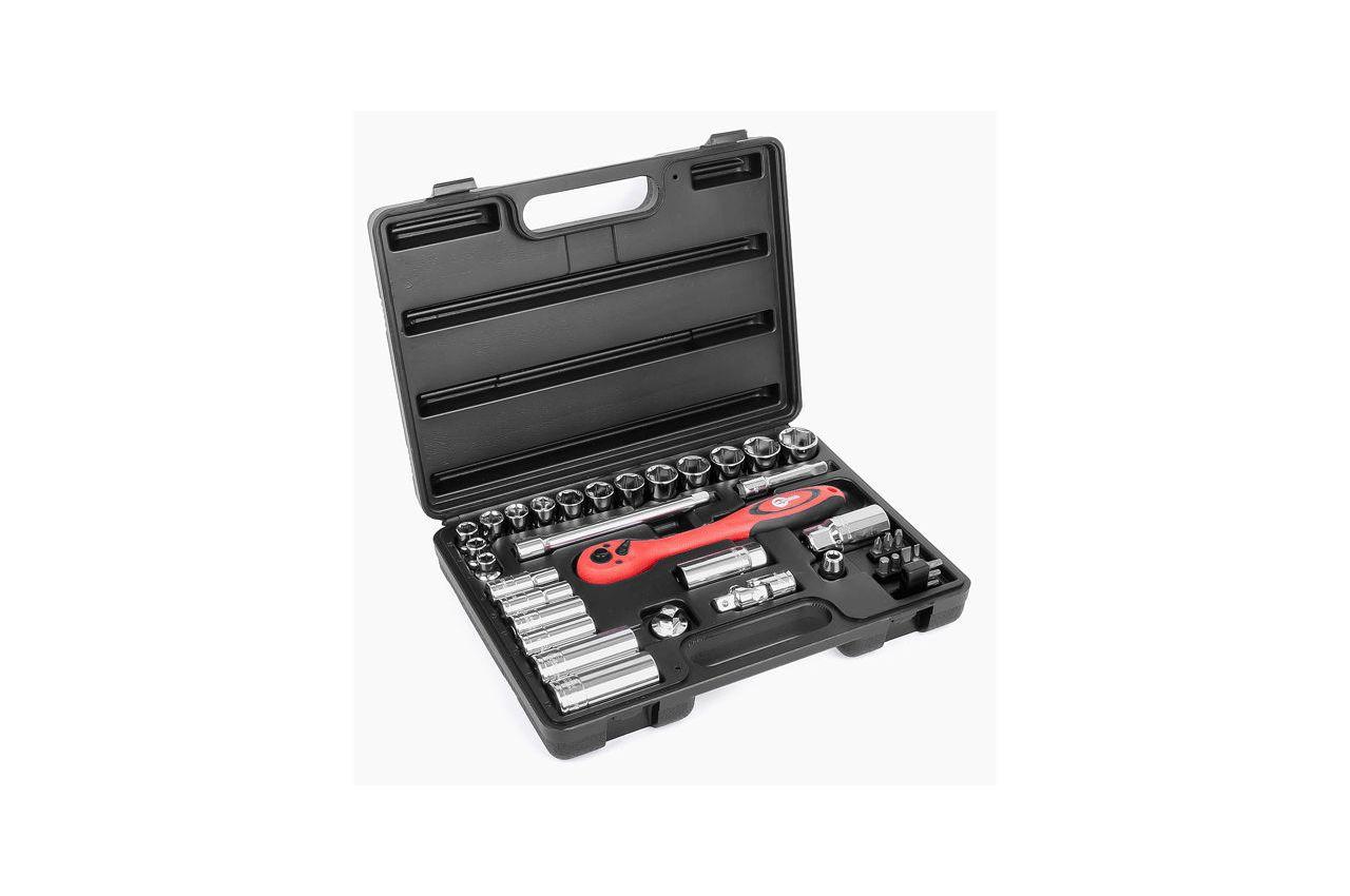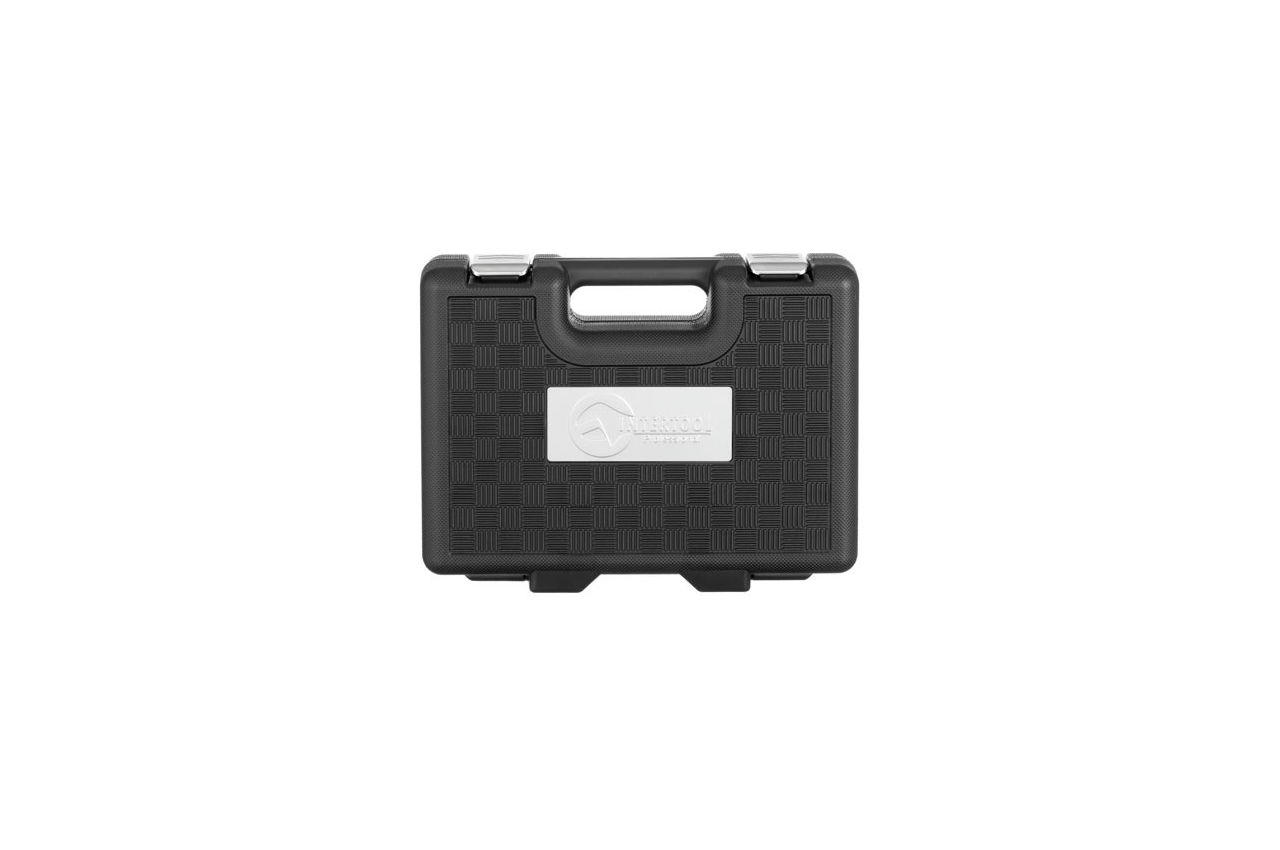Професійний набір інструментів включає в себе 39 одиниць інструменту, укомплектовані в кейс з ударостійкого пластику. Використаний розмір квадрата - 3/8 ". Всі інструменти виготовлені з хром-ванадієвої сталі підвищеної міцності зі спеціальним покриттям, що захищає від корозії. Цей набір є ідеальним помічником в обслуговуванні автомобіля. На окрему увагу заслуговує рукоятка з храповим механізмом (тріскачка) на 72 зубця з можливістю скидання і фіксації торцевих головок. Вона також виготовлена з хром-ванадієвого стали і при цьому покрита захисним шаром з поліпропілену, повністю запобігає можливість появи корозії. Габаритні розміри: 295х210х70 мм; Квадрат: 3/8 "; Кількість одиниць в наборі: 39 од .; Матеріал валізи: пластик