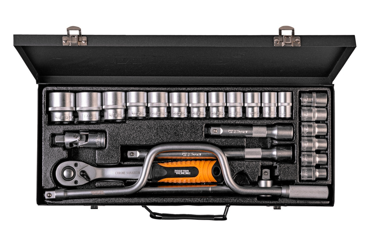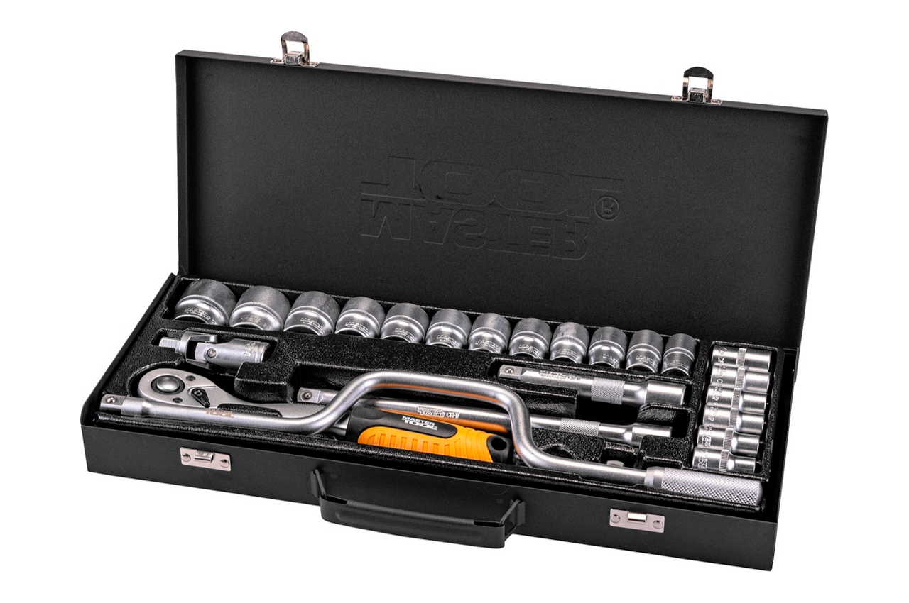 Професійний набір інструментів Mastertool 78-4125 призначений для використання в автосервісах і майстернях. До складу набору входить 24 елемента, виготовлених з високоякісної хром-ванадієвої сталі CRV50BV30, що дозволяє використовувати набір з додатком великого зусилля на робочий профіль. Торцеві головки розміром 10-32 мм виконані під квадрат 1/2" і мають шість граней. Гнутий вал для швидкого відкручування різьбових з'єднань. Шестерня тріскачки має 72 зуба, що забезпечує плавний хід. Так само в набір входить подовжувачі 125 мм і 250 мм, кардан, комірець 250 мм. Всі елементи набору мають антикорозійне покриття і розташовані в окремих осередках металевого кейса. Склад набору: • головки шестигранні 1/2": 10, 11, 12, 13, 14, 15, 16, 17, 18, 19, 20, 21, 22, 23, 24, 27, 30, 32 мм • подовжувачі 1/2": 125 мм, 250 мм • кардан 1/2"