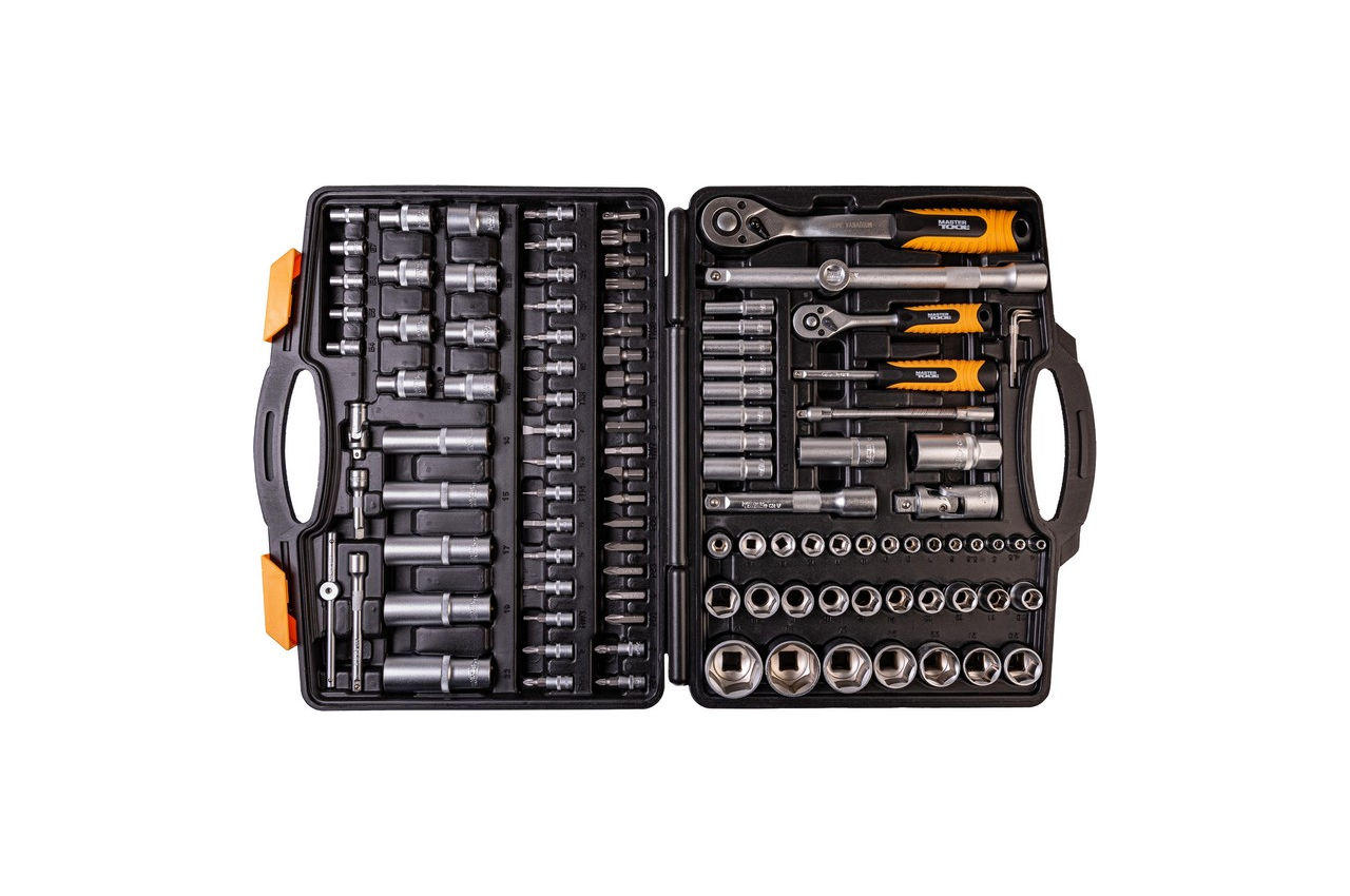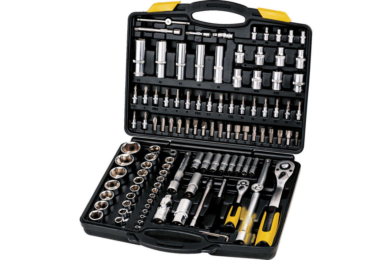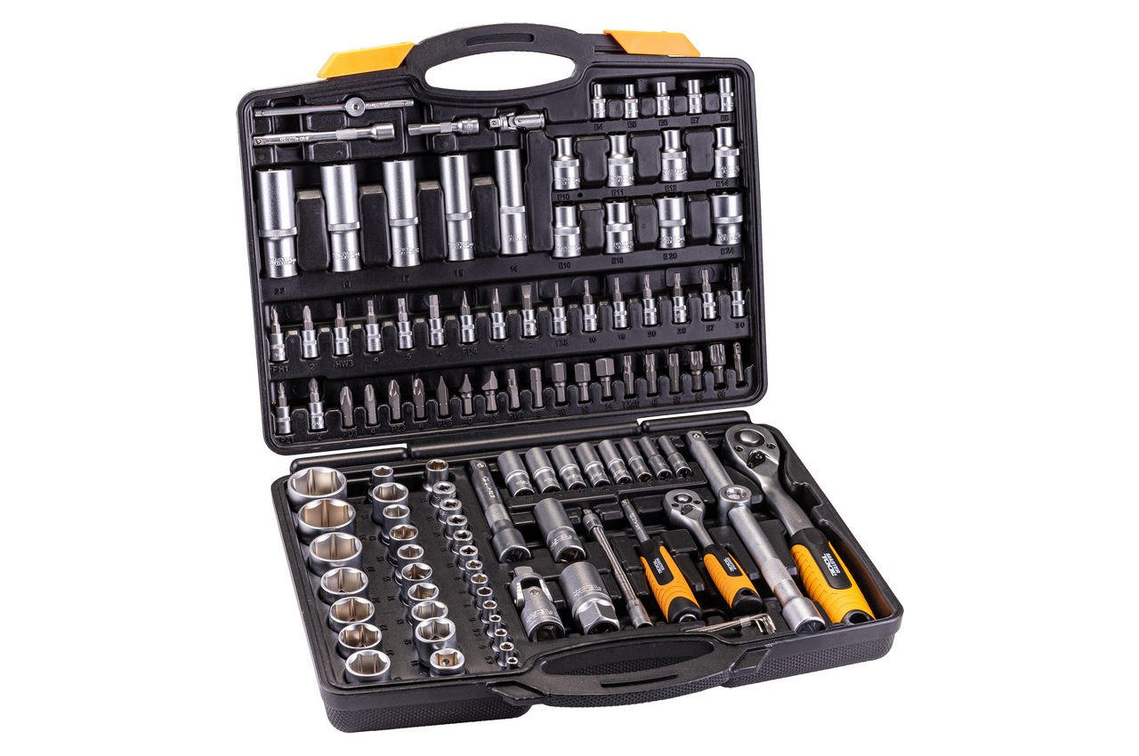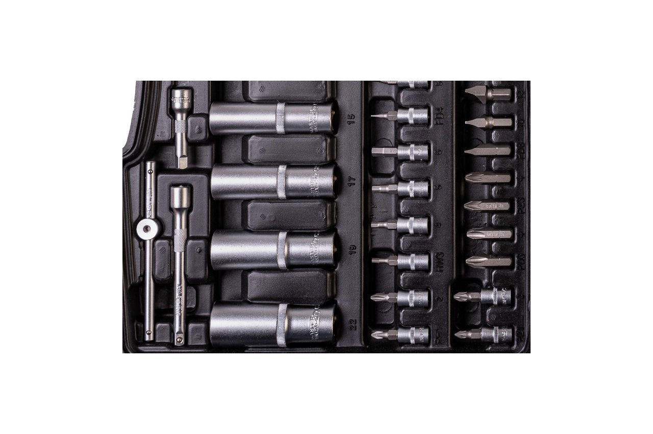 Тріскачка 1/4 "і 1/2" (72 зуба) з швидкою зміною, подовжувач 1/2" 125 мм і 250 мм, універсальний з'єднувач, гнучкий подовжувач 1/4" 150 мм, насадка торцева 1/2" (10, 11, 12, 13, 14, 15, 16, 17, 18, 19, 20, 21, 22, 24, 27, 30, 32 мм), довга торцева насадка 1/2" (14, 15, 17, 19, 22 мм), універсальний з'єднувач 1/4 "і 1/2", держатель отверточних 1/4 "65 мм, насадки свічкові 1/2" (16 мм і 21 мм), подовжувач 1/4 "(50 мм і 100 мм ), насадка торцева 1/4 "(4, 4.5, 5, 5.5, 6, 7, 8, 9, 10, 11, 12, 13, 14 мм), шестигранний ключ (1.5, 2, 2.5 мм), комірець з рухомим карданом 1/4 ", довга торцева насадка 1/4" (6, 7, 8, 9, 10, 11, 12, 13 мм), з'єднувач (1/2" х 5/16"), викруткові насадки 30 мм (L), викруткові насадки-головки, адаптер 1/2" , насадка зіркоподібна 1/4" (E4, E5, E6, E7, E8 мм), насадка зіркоподібна 1/2" (E10, E11, E12, E14, E16 , E18,E20, E24 мм), кейс.