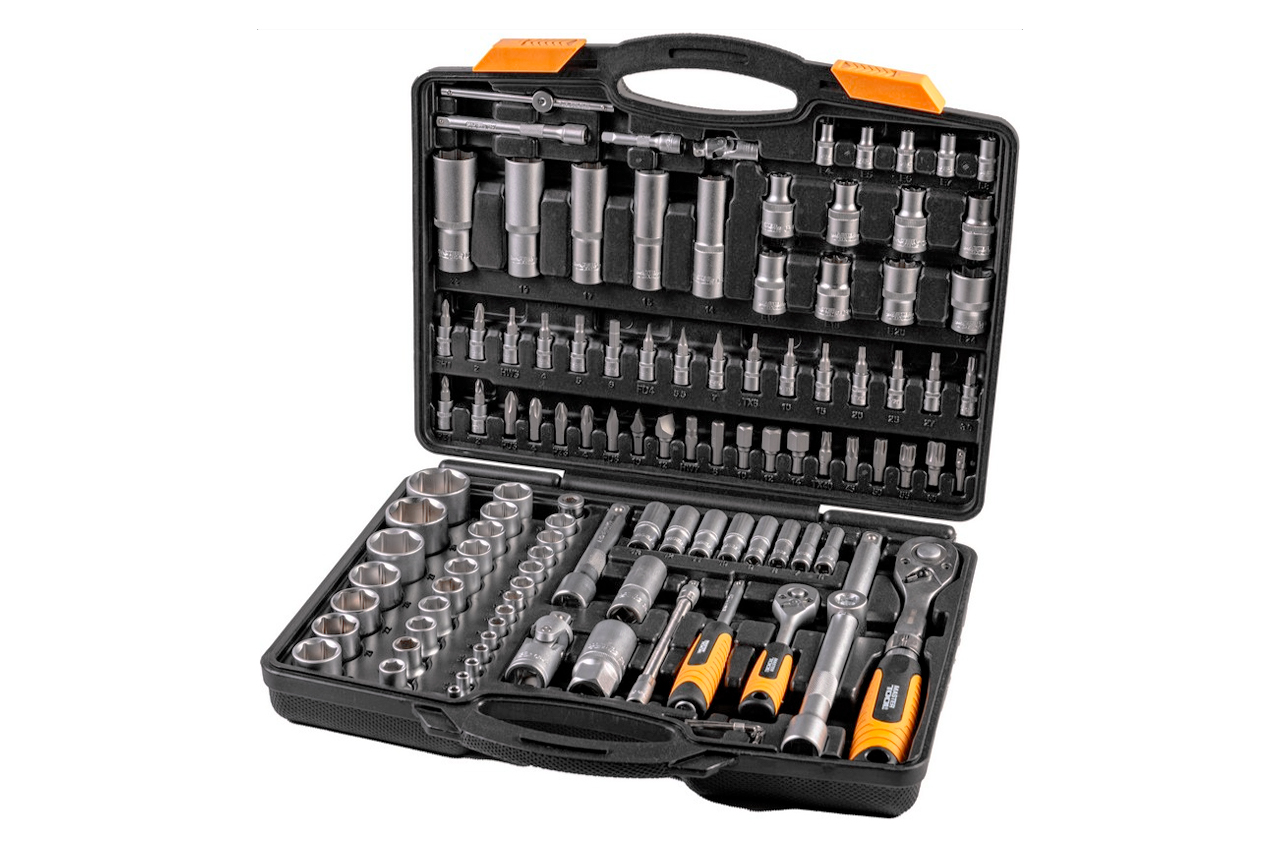Набір насадок торцевих 1/4 "і 1/2" з подовжується тріскачкою 72 зуба, 111 шт. Призначений для використання в автосервісах і майстернях. Комплектується 6-ти гранями насадками. Всі насадки виготовлені з високоміцної хром-ванадієвої сталі. Забезпечує найкращі умови для програми робочого зусилля при роботі з зовнішніми робочими профілями. Комплектуючі елементи дозволяють використовувати набір при виконанні різних видів робіт. Поставляється в пластмасовому протиударному кейсі.