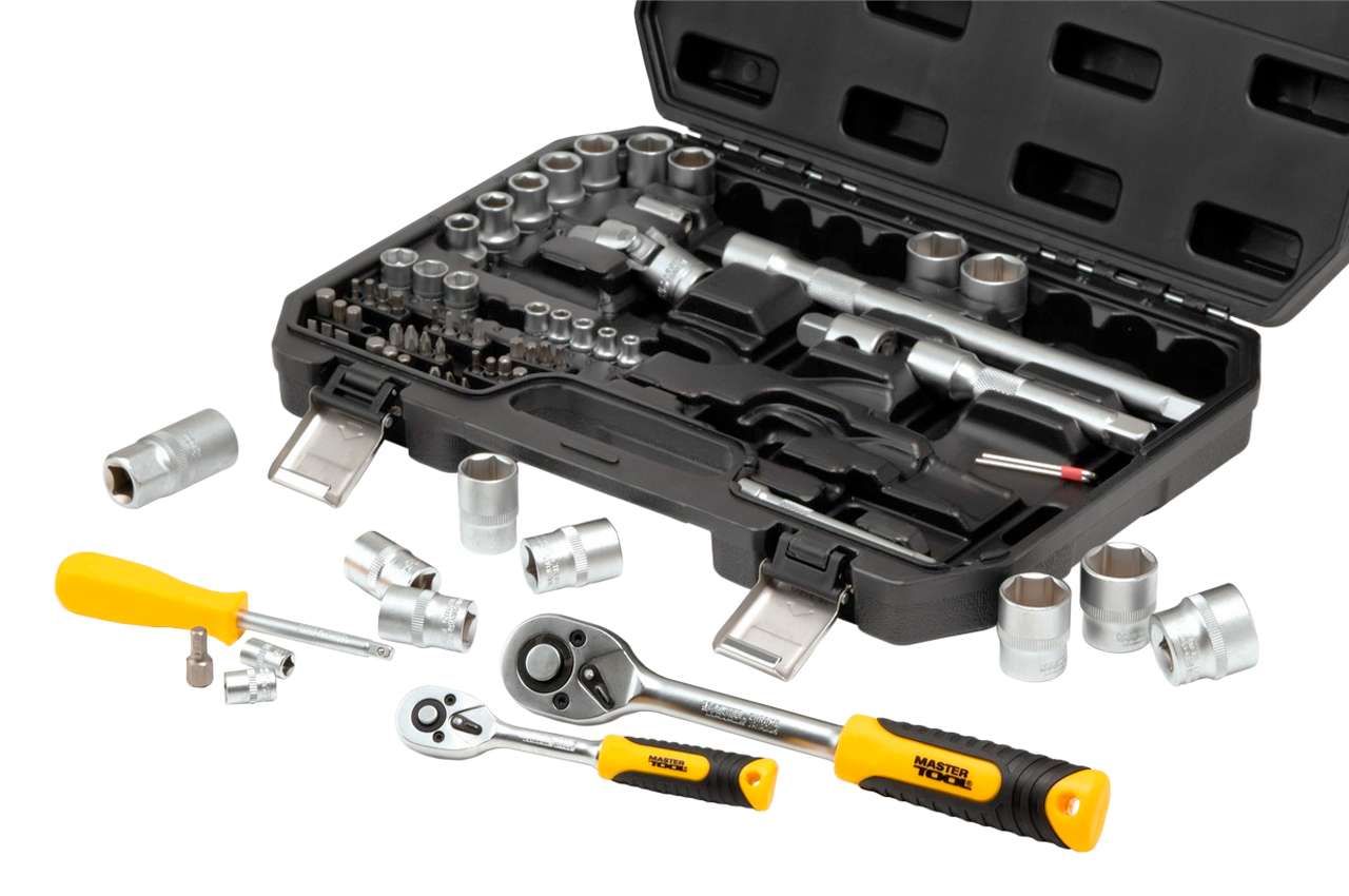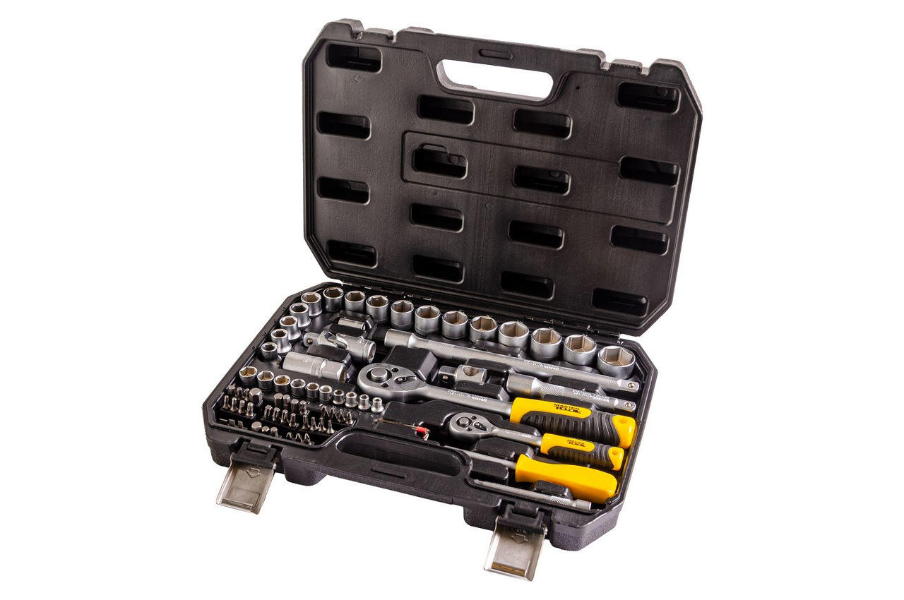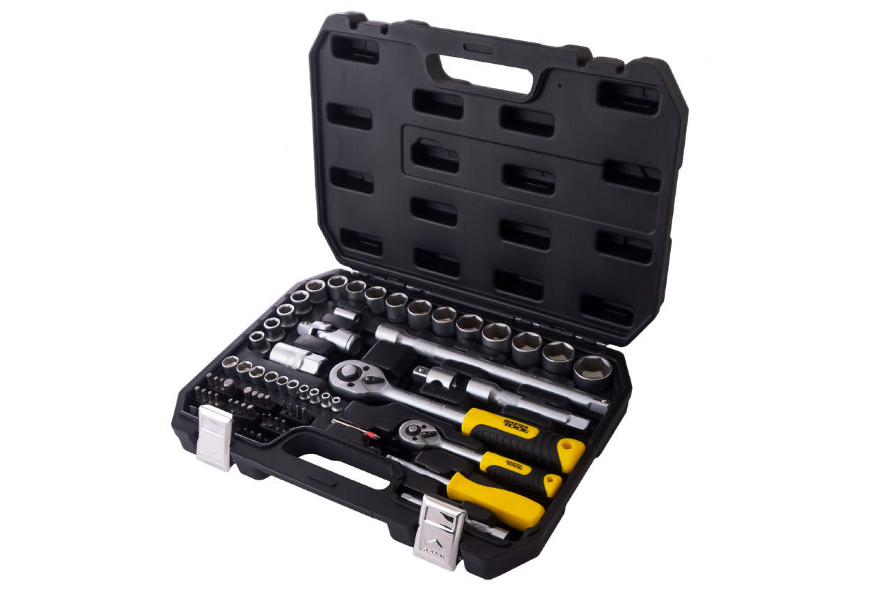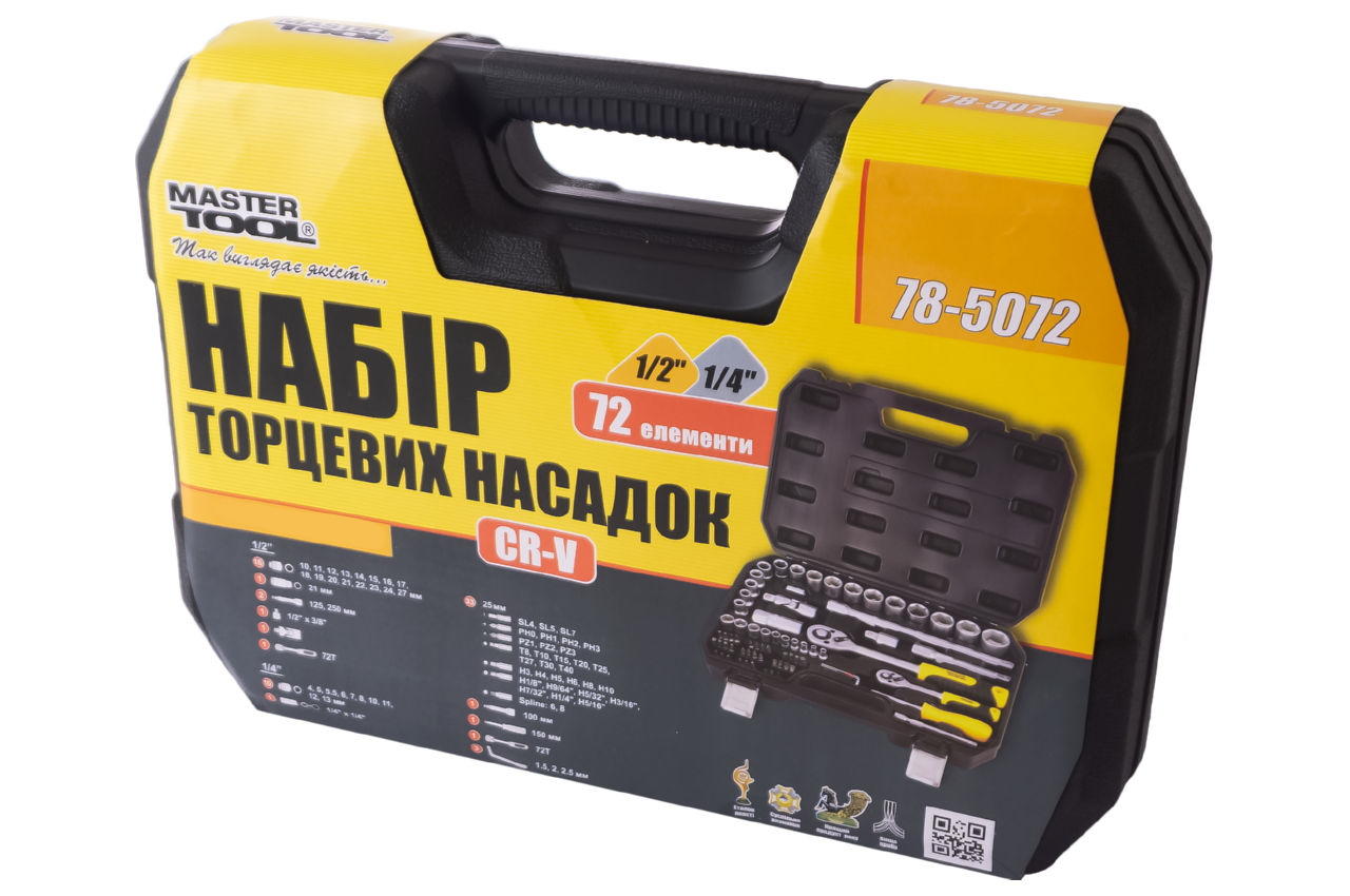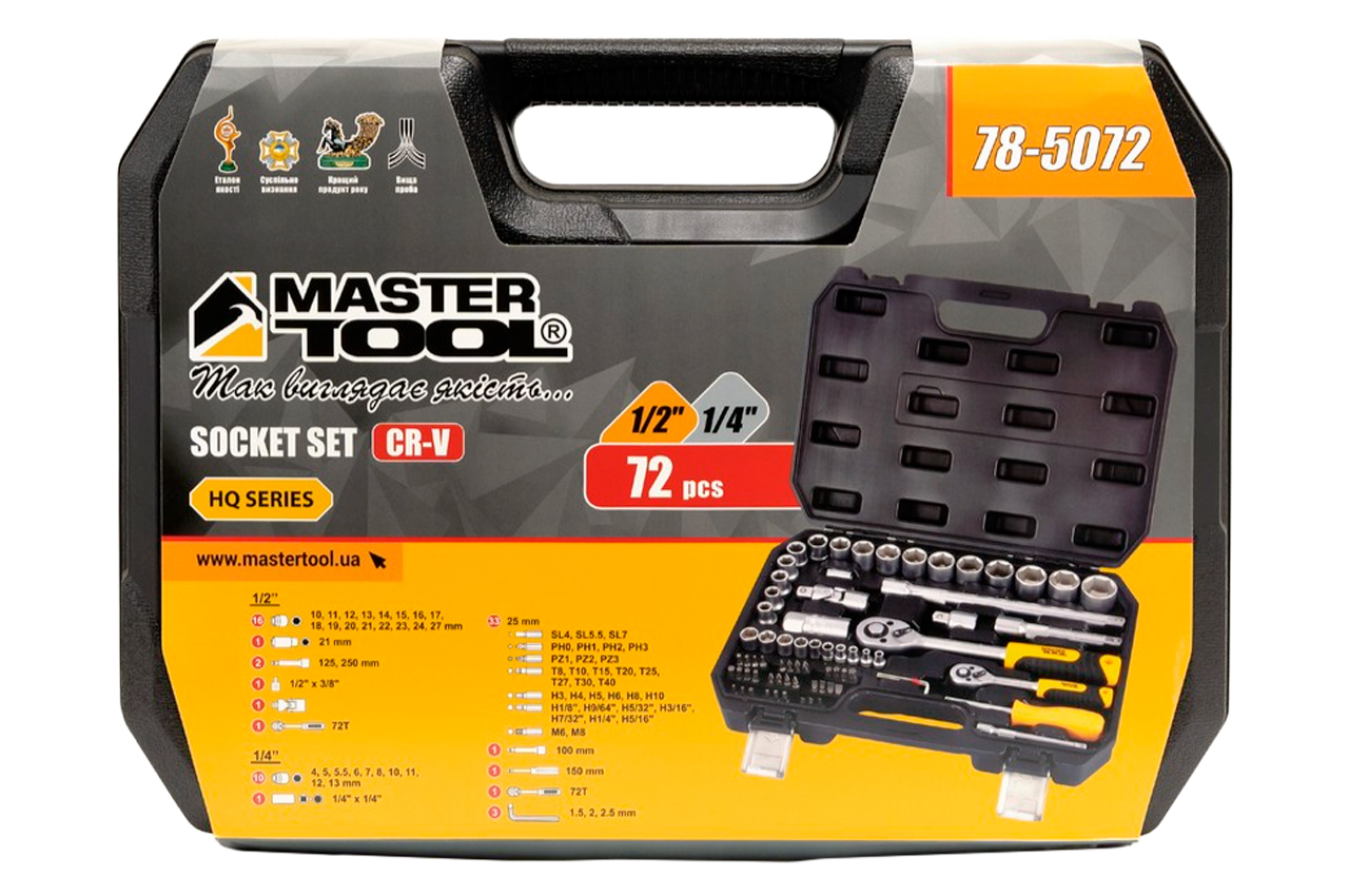 Загартована хром-ванадієва сталь трещотка 72Т пластиковий кейс з металевими петлями і замками. Головки шестигранні 1/2" : 10, 11, 12, 13, 14, 15,16, 17, 18, 19, 20, 21,22, 23, 24, 27 мм головка свічкова 21 мм подовжувачі 1/2": 125 мм, 250 мм перехідник з отвором для воротка 1/2" х 3/8" кардан 1/2" тріскачка 1/2", 72 зуба головки шестигранні 1/4 ": 4, 5, 5.5, 6, 7, 8, 10, 11, 12, 13 мм перехідник квадрат 1/4 "-шестигранник 1/4" біти отверточних 1/4 ", 30 мм: - TORX: T8, T10, T15, T20, T25, T27, T30, T40 - PH0 , PH1, PH2, PH3 - PZ1, PZ2, PZ3 - SL4, SL5.5, SL7 - Spline 6, Spline 8 - HEX: H3, H4, H5, H6, H8, H10 - HEX: H1/8 ", H9/64 ", H5/32", H3/16 ", H7/32", H1/4 ", H5/16" подовжувач 1/4 ", 100 мм тримач для біт 150 мм тріскачка 1/4"
