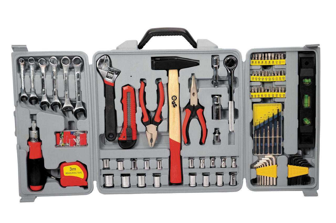 Ключі рожково-накидні (8, 10, 12, 13, 14, 15 мм), тримач отверточних з реверсом і тріскачкою, рулетка 3 м, ключ розвідний 200 мм, ніж для шпалер, пасатижі 160 мм, молоток 300 г, щипці 160 мм, подовжувач, насадка торцева для свічок 1/2" 21 мм, адаптер, рукоятка з тріскачкою, головки торцеві 1/4" (4, 4.5, 5, 6, 7, 8, 9, 10, 11, 12), 3/8 "(9, 10, 11, 12, 13, 14, 15, 17), насадки викруткові 25 мм, викрутки годинні, ключі шестигранні 16 шт (1.5, 2, 2.5, 3, 4, 5, 5.5, 6, 1/16, 5/64, 3/32, 1/8, 5/32, 3/16, 7/32, 1/4), рівень.