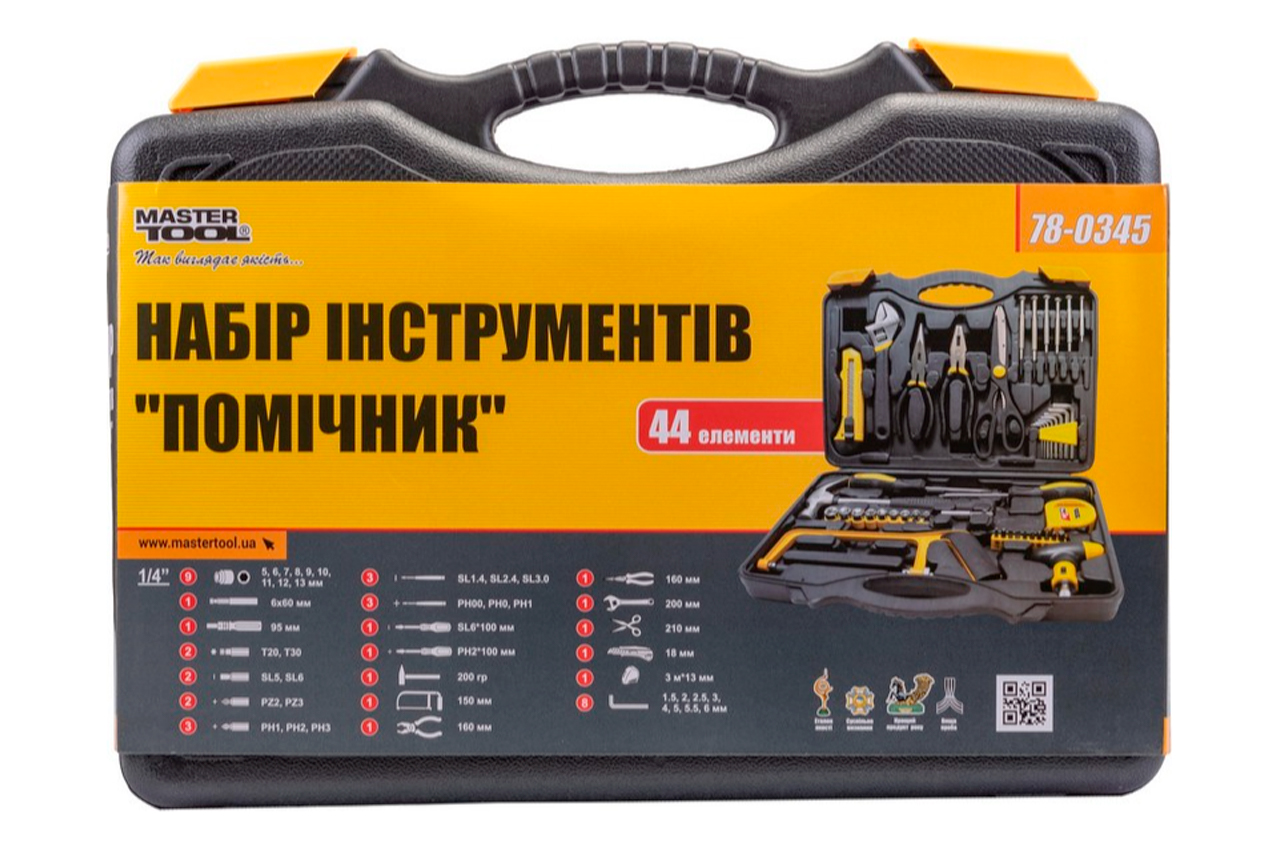 Інструментальна сталь пластиковий кейс. Насадки шестигранні 1/4 ": 5, 6, 7, 8, 9, 10, 11, 12, 13 мм подовжувач для біт 6 х 60 мм викрутка з тріскачкою 95 мм Біти: - Т20, Т30 - SL5, SL6 - PZ2, PZ3 - PH1, PH2, PH3 викрутки прецизійні: - SL1.4, SL2.4, SL3.0 - PH00, PH0, PH1 викрутка SL6 х 100 мм, викрутка PH2 х 100 мм молоток 200 гр ножівка по металу плоскогубці 160 мм щипці 160 мм ключ розвідний 200 мм ножиці 210 мм ніж пластиковий 18 мм вимірювальна рулетка 3м х 13 мм ключі шестигранні: 1.5, 2, 2.5, 3, 4, 5, 5.5, 6 мм