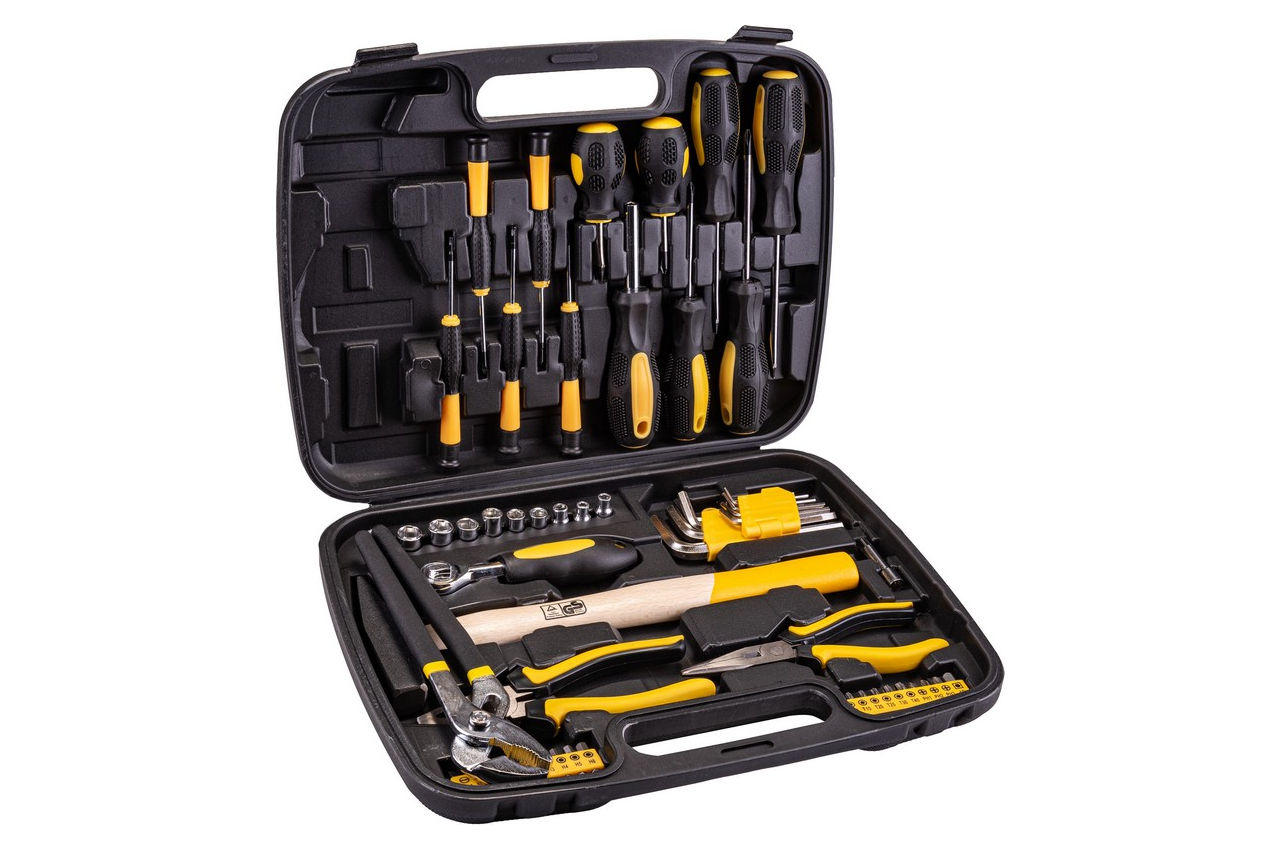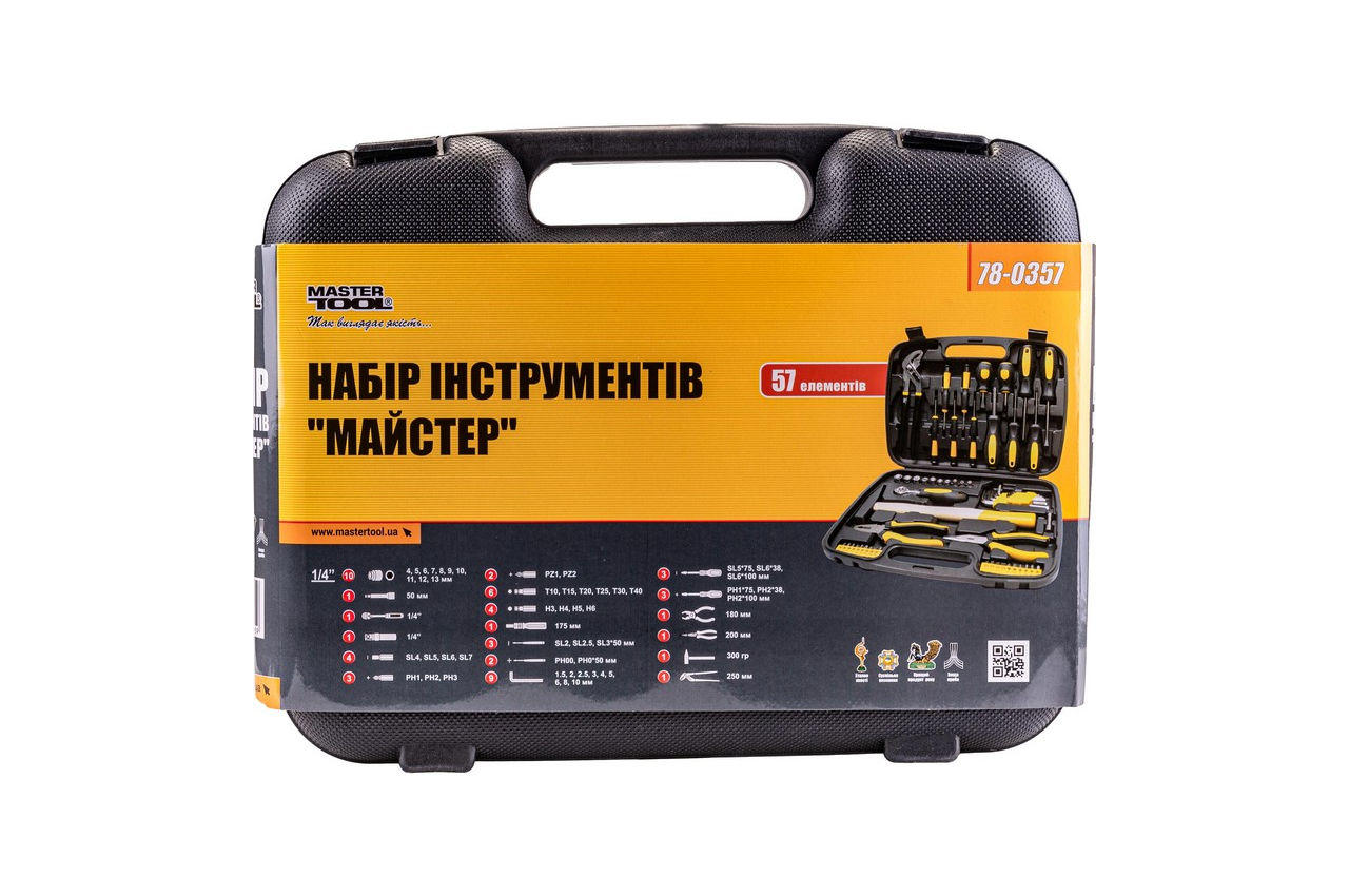 Поставляється в пластмасовому боксі. У наборі: викрутки: SL6 x 38 мм, SL5 x 75 мм, SL6 x 100 мм, PH2 x 38 мм, PH1 x 75 мм, PH2 x 100 мм, тримач для насадок 50 мм, точні викрутки (SL2 x 50, SL2. 5 x 50, SL3 x 50 мм, PH00 x 50, PH0 x 50 мм), щипці для труб 240 мм, шестигранники (1.5, 2, 2.5, 3, 4, 5, 6, 8, 10 мм), торцеві головки ( 4, 5, 6, 7, 8, 9, 10, 11, 12, 13 мм), тріскачка 1/4 ", молоток слюсарний 300 г, щипці прямі 200 мм, пасатижі 180 мм, перехідник для отверточних насадок 1/4" 50 мм, насадки викруткові 25 мм: SL4, SL5, SL6, SL7, PH1, PH2, PH3, PZ1, PZ2, T10, T15, T20, T25, T30, T40 і шестигранні (3, 4, 5, 6 мм)