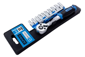 Набір головок з тріскачкою і подовжувачем призначений для монтажу і демонтажу різних різьбових з'єднань. Привід 1/4 "знадобиться для виконання переважної більшості робіт, пов'язаних з ремонтом обладнання, авто-, мото-, велотехніки, а також інших робіт в побуті і в гаражі кожного домашнього майстра і автолюбителя. У наборі найпопулярніші розміри торцевих головок, тріскачка і подовжувач для роботи у важкодоступних місцях. Особливості: Комплект на довгі роки. Всі інструменти виготовлені з високоякісної Cr-V стали. Завдяки міцності і сучасним технологіям виробництва інструменти відрізняються тривалим терміном служби, стійкістю до підвищених навантажень, а також високою точністю виготовлення. Два шару нікелевого покриття вбережуть від появи іржі. Надійна Трещеточний рукоятка. Механізм тріскачки і все його комплектуючі виготовлені в Тайвані - це міцний і надійний інструмент, з м'яким ходом храпового механізму. Зручне зберігання. Інструменти розміщуються в компактному утримувачі-перенесенні, не випадають і не губляться під час транспортування і зберігання. Матеріал виготовлення Всі інструменти виготовлені з міцної і витривалою Cr-V стали. Відрізняються тривалим терміном служби, мають запас міцності і стійкі до навантажень. Двошарове нікелеве покриття забезпечує антикорозійні властивості інструментів. Торцеві головки і тріскачка Механізм тріскачки на 72 зуба виготовлений в Тайвані. Відрізняється плавним ходом храпового механізму, а також міцність і зносостійкість. Швидкий скидання головок і наявність реверсу спростять і в безліч разів прискорять роботу майстра. Тріскачка має вигнуту рукоятку для роботи у важкодоступних місцях. Ручка з гумовою накладкою для максимального хвата, не ковзає і не випадає з ваших рук. Головки туго сидять на посадковому квадраті тріскачки 1/4 ", не спадають і щільно прилягають до поверхні кріплення. На кожній головці нанесені насічки для запобігання ковзання в брудних руках або в рукавицях. Квадрат: 1/4"