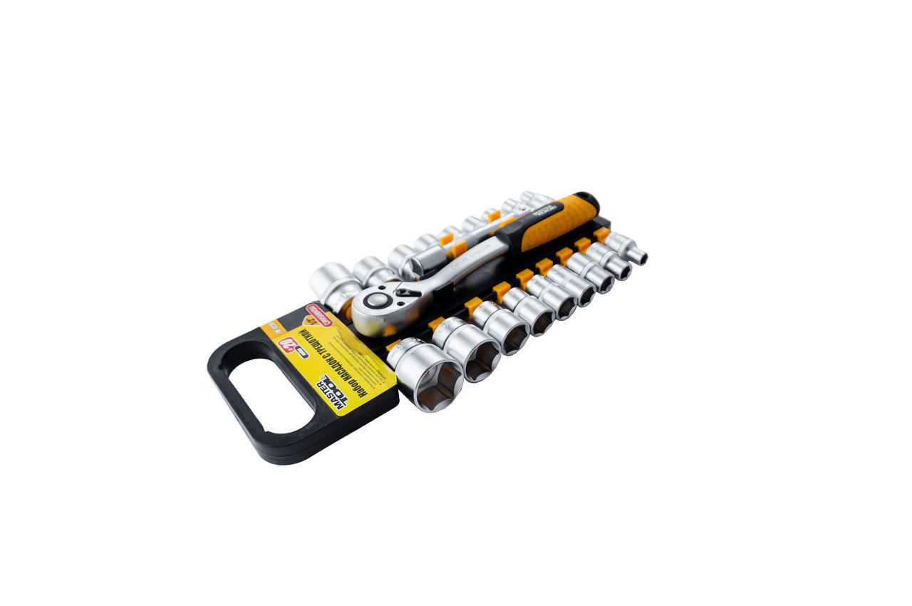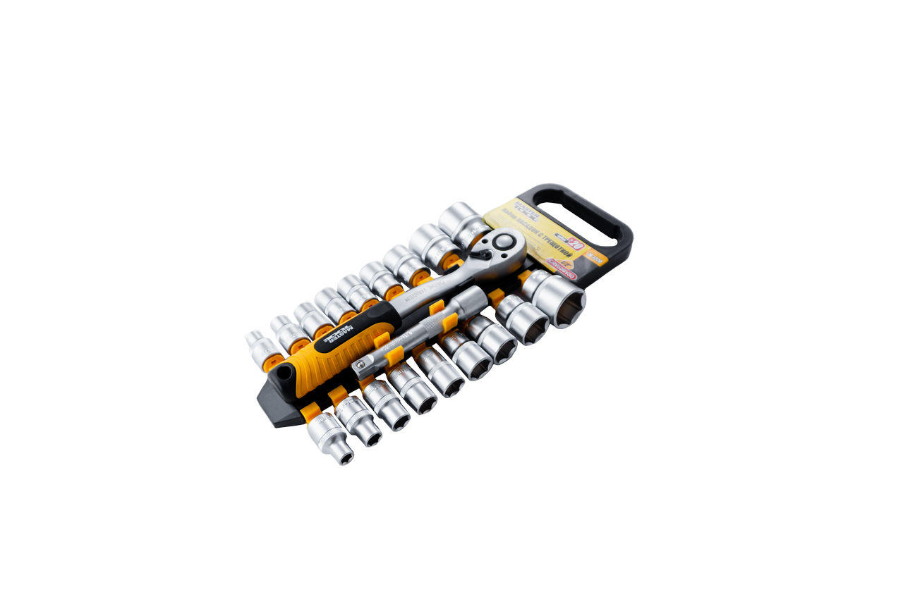У комплекті: тріскачка 1/2" (72 зуба) з швидкою зміною, подовжувач 1/2" 125 мм, насадка торцева 1/2" (8, 9, 10, 11, 12, 13, 14, 15, 17, 18 , 19, 20, 22, 24, 27, 30 і 32 мм)