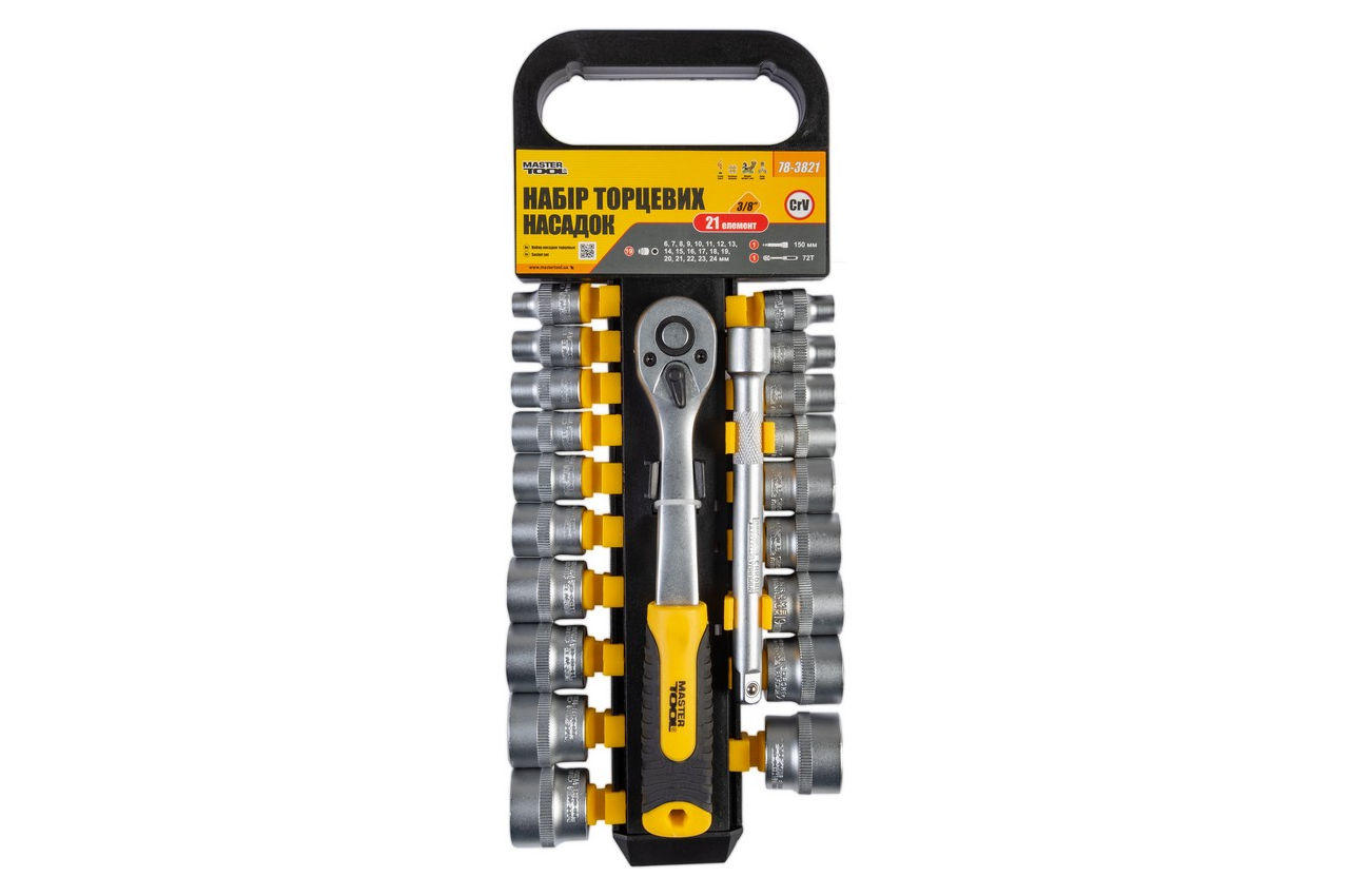 Загартована хром-ванадієва сталь трещотка 72Т. Насадки шестигранний 3/8 ": 6, 7, 8, 9, 10, 11, 12, 13, 14, 15, 16, 17, 18, 19, 20, 21, 22, 23, 24 мм подовжувач 3/8" , 150 мм тріскачка 3/8 ", 72 зуба