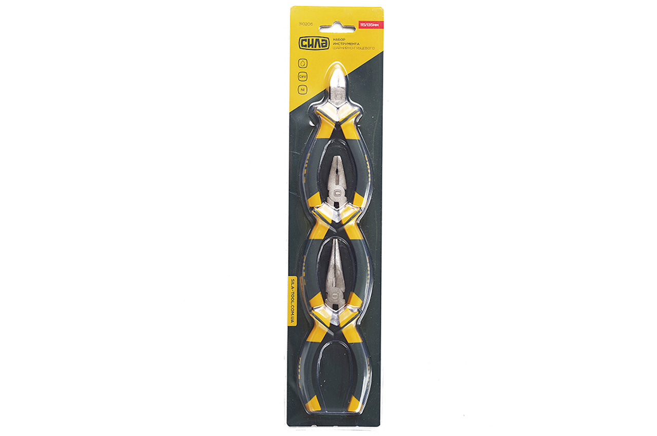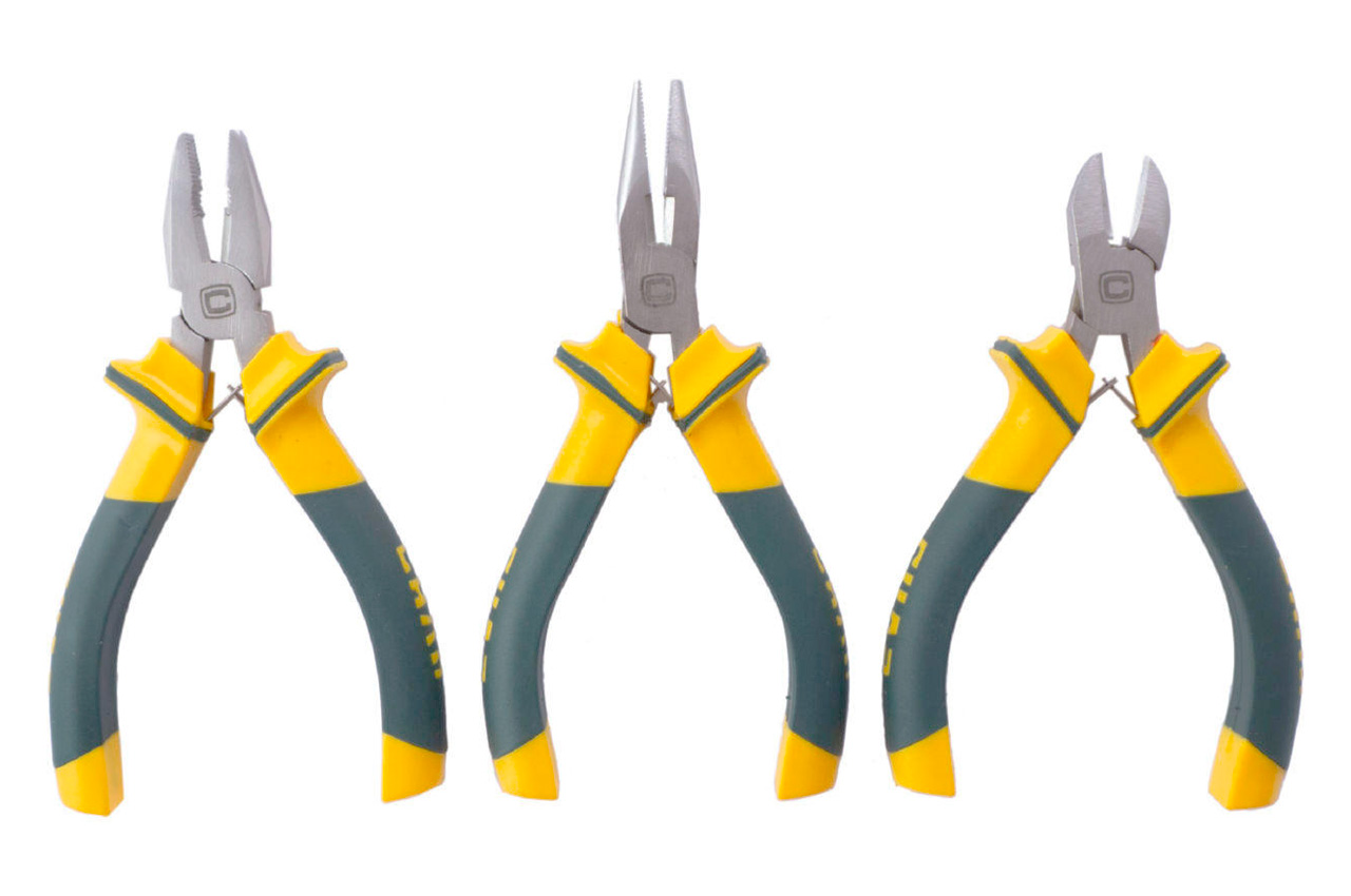 Набір: плоскогубці 115мм; бокорізи 115мм; длінногубци 135мм. Матеріал рукоятки: пластик, термопластичная гума. Матеріал: хром-ванадієва сталь. Матеріал рукоятки: пластик, термопластичная гума; Набір: плоскогубці 115мм; бокорізи 115мм; длінногубци 135мм