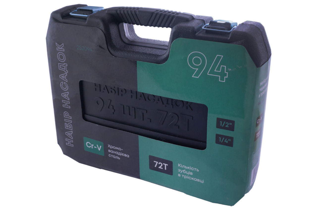 Набір інструменту Сила - 1/4" х 1/2" х 94 од. зелений. Набір ручних інструментів із змінними насадками у комплекті. Набір насадок CrV 1/4, 1/2 (90Т) (94шт) (інструментів) торцевих з тріскачкою APRO Подовжувач1/2": 125, 250мм; 1/4": 50, 100мм, гнучкий 150 мм Шарнір карданний1/2"; 1/4" Матеріалхром-молібденова сталь Зуби в тріскоті90 Насадки свічкові1/2": 16; 21мм Перехідник1/4" 30 мм ВоротокТ-подібний 1/2", 115 мм 1/4" Біти 5/16" ТХ: 40, 45, 50, 55; PD6 3.4; PZ: 3, 4; FD: 8, 10, 12; НІХ: 8, 10, 12, 14 мм Біти 1/4" ТХ: 8, 10, 15, 20, 25, 30; PD: 1, 2; PZ: 1, 2; FD: 4, 4,5, 7 мм; НІХ: 3, 4, 5, 6 мм Бітотримач1/2" х 5/16" Насадки 1/44, 4,5, 5, 5,5, 6, 7, 8, 9, 10, 11, 12, 13, 14 мм Насадки 1/210, 11, 12, 13, 14, 15, 16, 17, 18, 19, 20, 21, 22, 23, 24, 27, 30, 32 мм Ключі шестигранні1.5, 2, 2.5мм