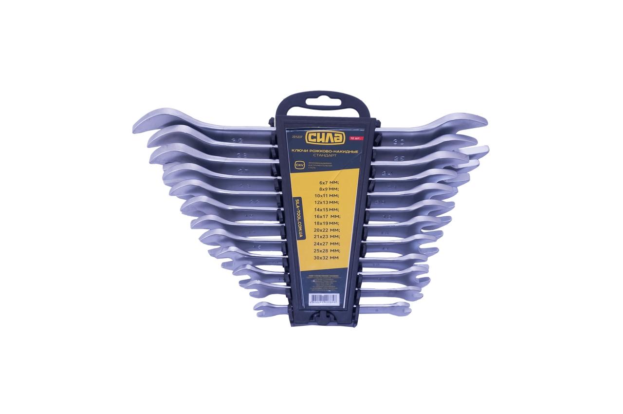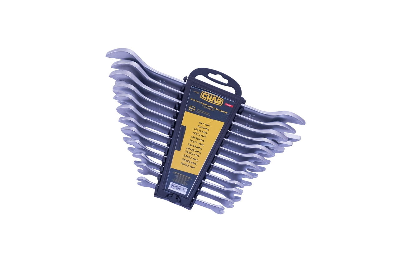 Набір рожково-накидних ключів Сила - відмінний набір з 12 комбінованих ключів, кожен з яких представляє собою поєднання ріжкового і накидного. Комбіновані ключі застосовуються для монтажних, слюсарних робіт. Набір: 6-23, 24х27мм, 25х28мм, 30х32мм