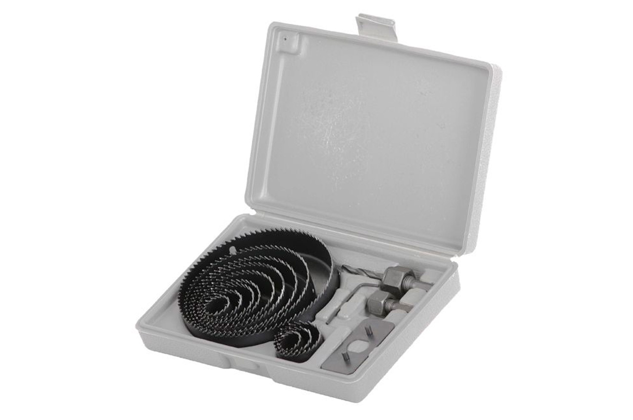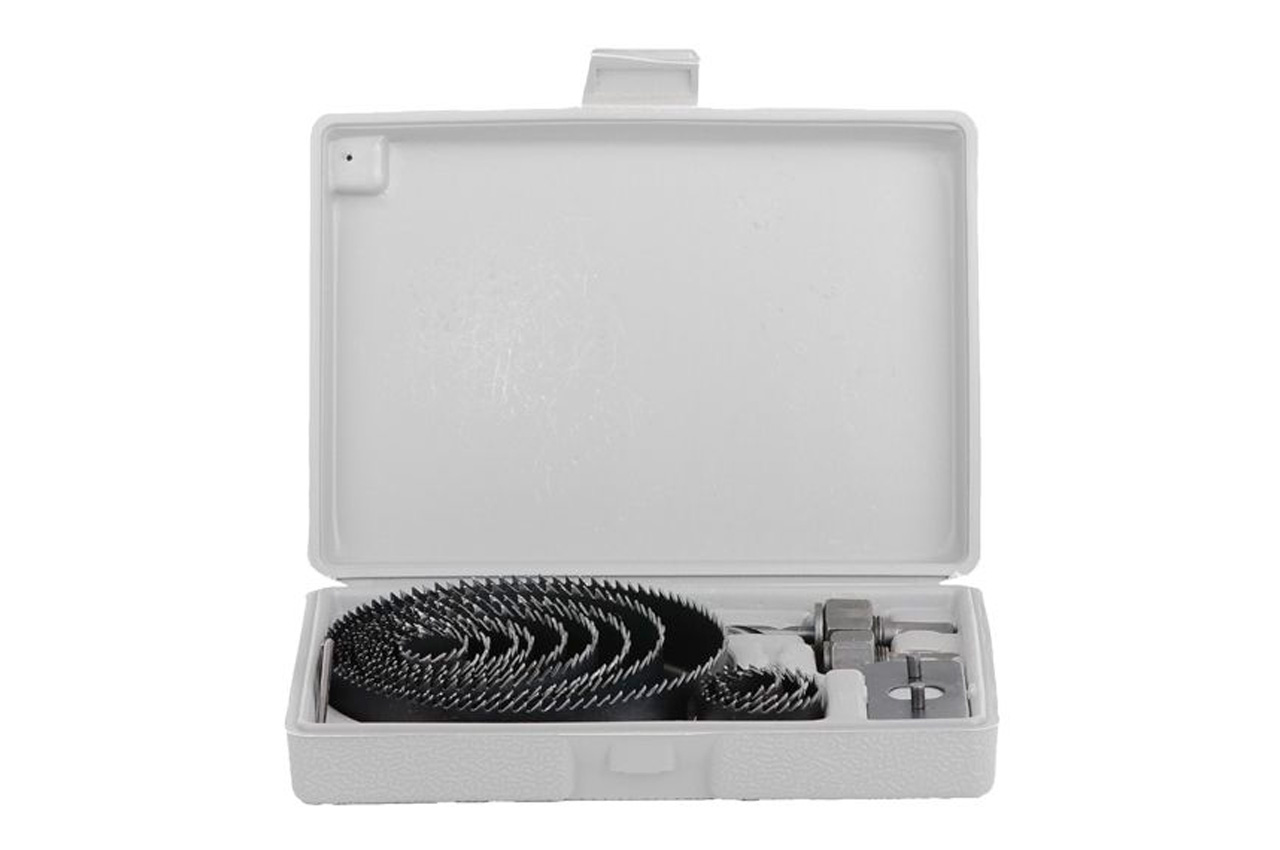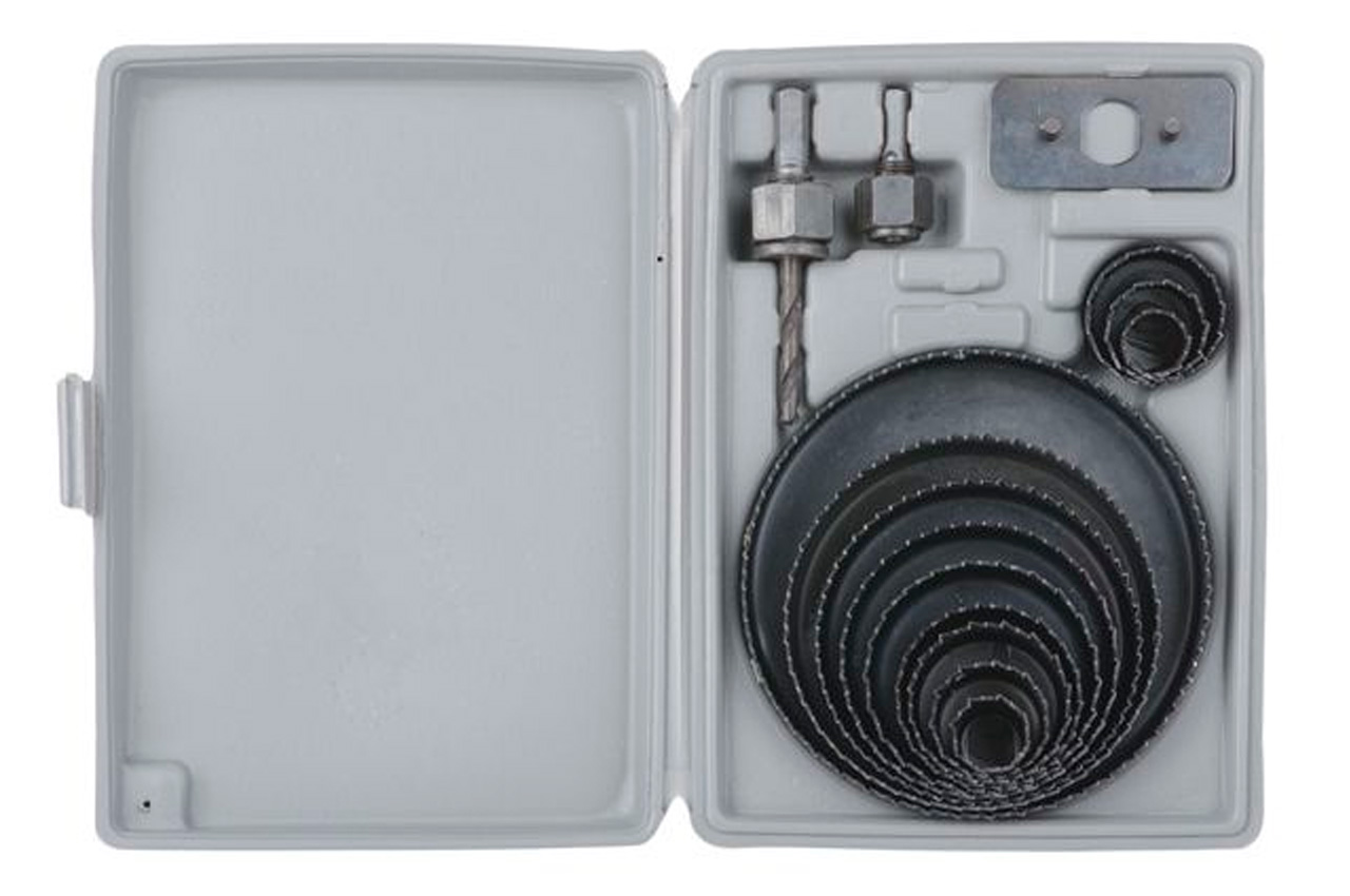 Набір корончастих свердел (фрез), призначений для свердління наскрізних отворів діаметром від 19 до 127 мм, в деревині і її похідних, а також в пластиці і гіпсокартоні. За допомогою цього набору Ви легко просвердлите отвори потрібного Вам діаметру: під розетки, дверні замки або проходи для комунікації. У комплект набору входить два тримачі: Тримач з напрямних свердлом і опорним підставою для коронок діаметром 32-127 мм; Тримач без центрує свердла для коронок 19, 22, 29 мм. У наборі 12 корончастих фрез виготовлених з високоякісної інструментальної сталі. Завдяки цьому ріжучакромка не деформується і довго залишається гострою. Виконайте один пропив, і ви відчуєте наскільки якісний інструмент у вас в руках. Так само якість пропилу збільшується, завдяки кроці і розводці зубів. Що спрямовує свердло не дає коронки йти в сторону і дозволяє робити рівні контрольовані отвори. Все коронки упаковані в пластиковий кейс із засувкою, завжди знаходяться на своїх місцях і не губляться при роботі. Ви легко знайдете місце для зберігання кейса т.к у нього компактний розмір. Робіть ремонт з набором коронок по дереву легко і швидко. Особливості Легко випилює отвори в деревині, пластику і гіпсокартоні, завдяки спеціальним кутах нахилу і розводці зубів. Ви отримуєте рівне отвір завдяки направляючої свердла. Ріжуча кромка витримує великі навантаження без деформації, виготовлена з міцної інструментальної сталі. Коронки завжди під рукою тому зберігаються в надійному кейсі невеликого розміру. Діаметр коронок: 19, 22, 29, 32, 38, 44, 54, 64, 76, 89, 102, 127; Кількість коронок: 12 од .; Застосування: пластик і дерево