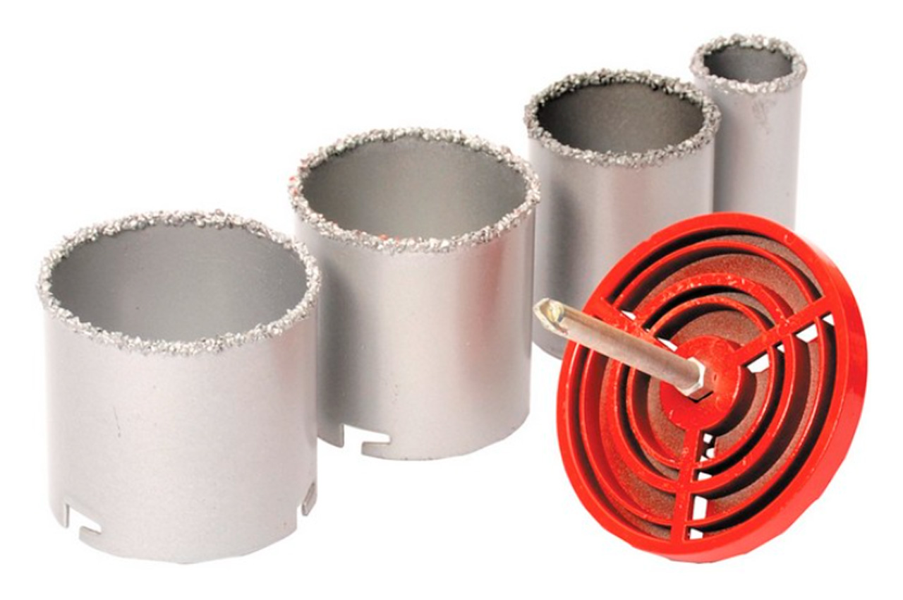Набір корончастих свердел по плитці "Granite" - 4 шт. (33, 53, 67, 73 мм). Використовуються для монтажу розеток, розподільних коробок, світильників на стелю. Свердління отворів великого розміру в склі, склопластику, дзеркалі, кераміці та порцеляні вольфрамовое напилення Центруюче свердло ø 33/53/67/73 мм RPM <1500 об / хв