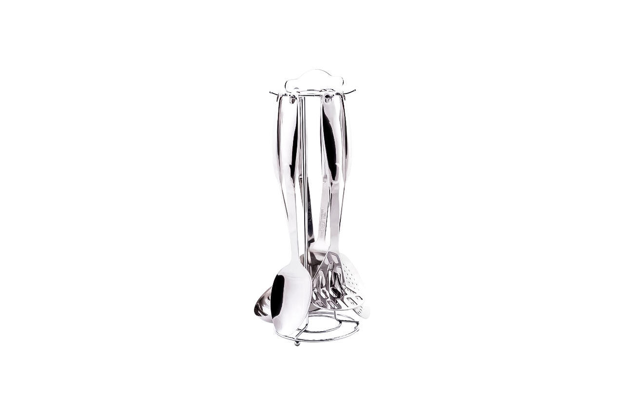 Кухонний набір Maestro - 7 од. MR-1544 Набір складається з: лопатка, Картофелемялка, ополоник, шумовка, підставка, ложка для спагетті, соусник. Всі предмети виготовлені з нержавіючої сталі. Чорні ручки.