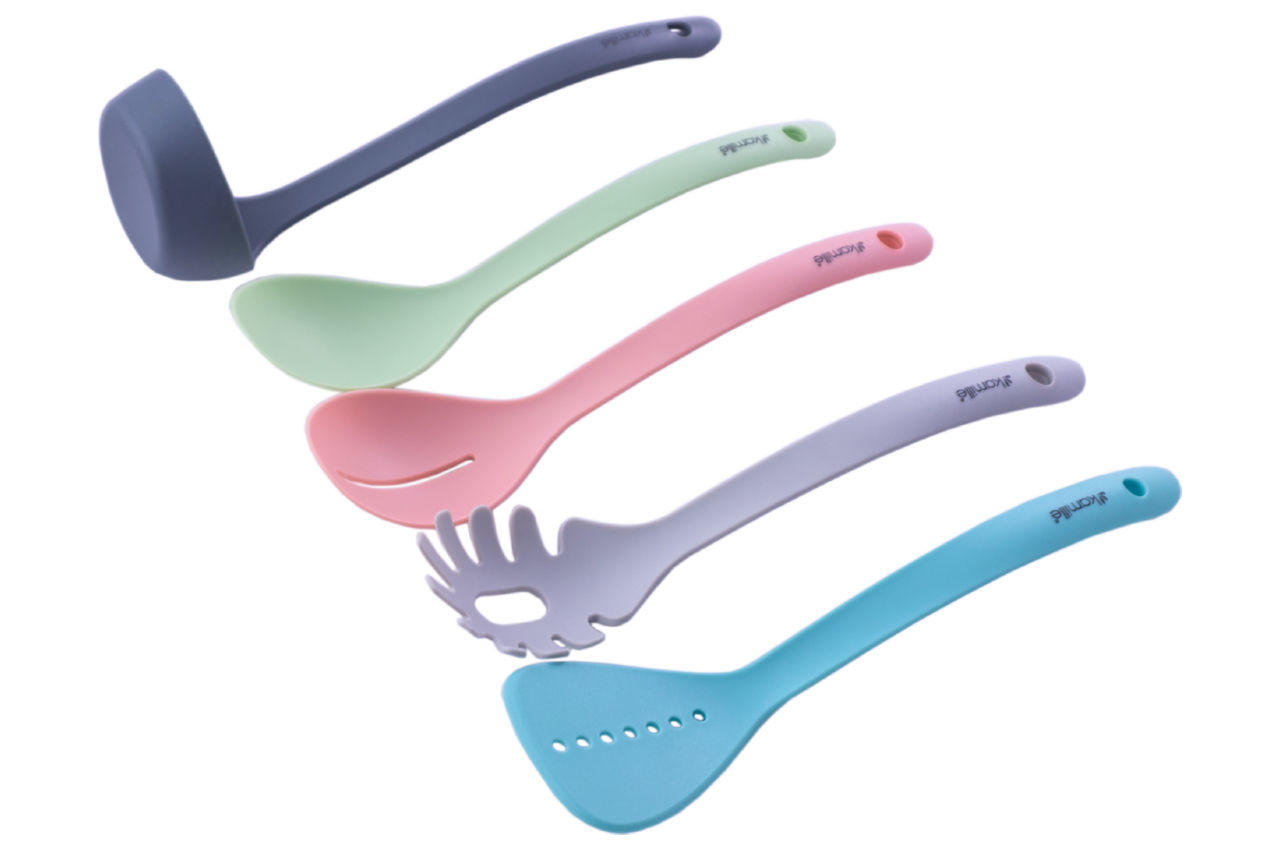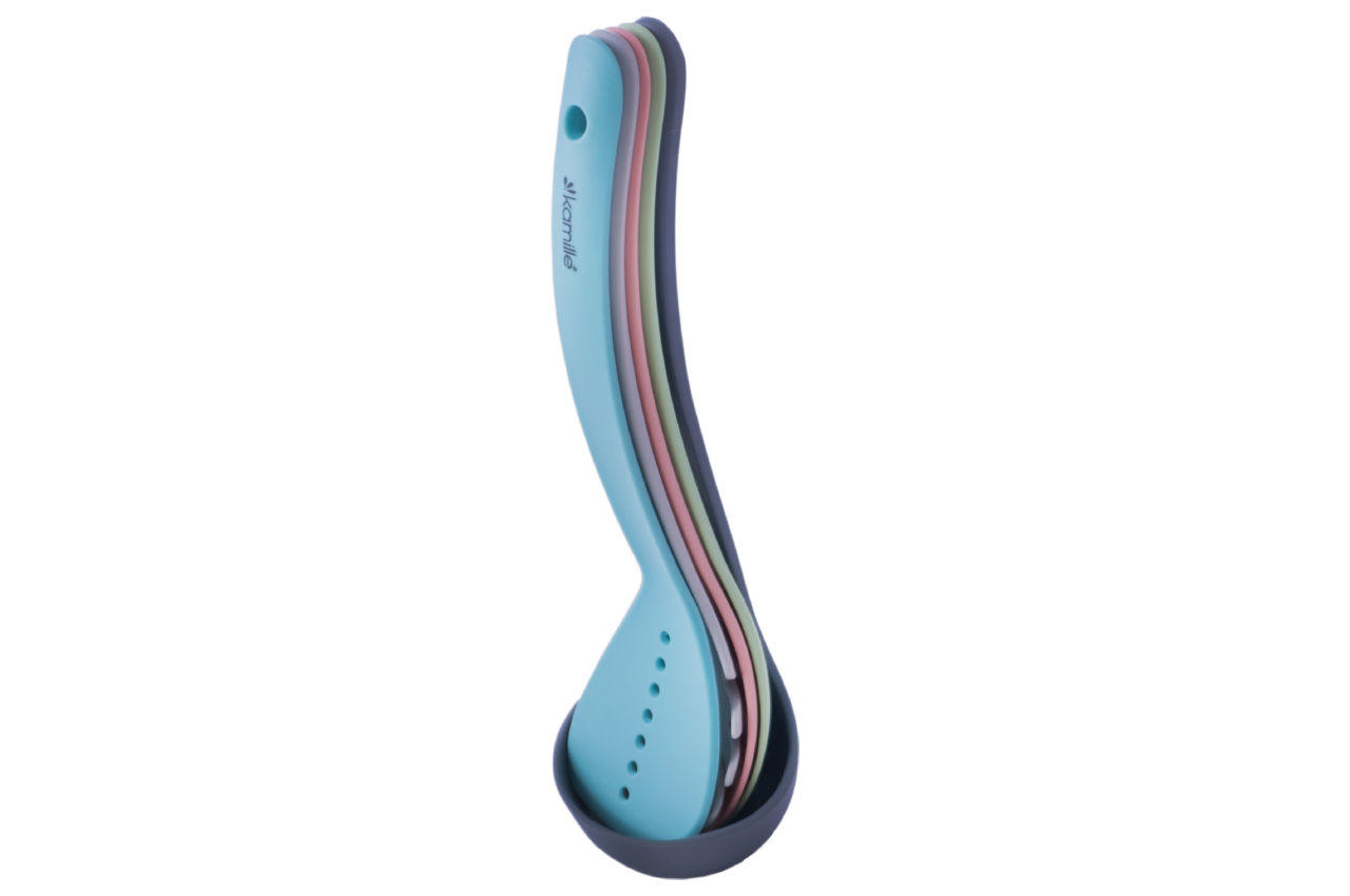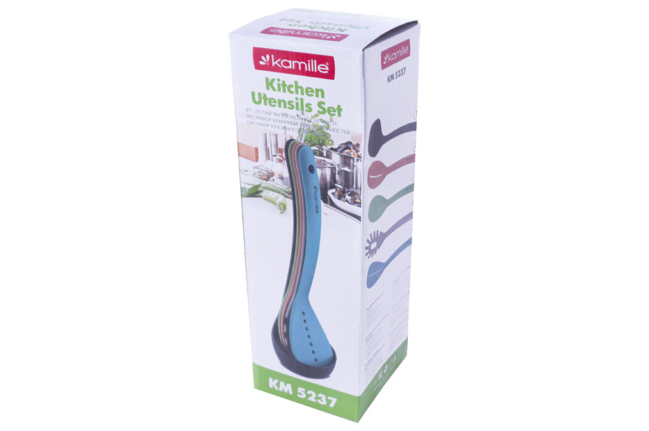 Набір кухонний Kamille - це надійність, практичність та неповторний дизайн. Кухонне приладдя виконане з високоякісним нейлоновим покриттям із застосуванням сучасних технологій виробництва та абсолютно безпечне для здоров'я людини. Набір: кухонне начиння. 1) Половник 32,5 х10 см. Колір: чорний. 2) Ложка з прорізами 32х7, 8 см. Колір: ніжний рожевий. 3) Ложка кухарська 32х7, 8 см. Колір: салатовий. 4) Ложка для спагетті 32х7, 8 см. Колір: сірий. 5) Лопатка з прорізами 31,5 х8 см. Колір: блакитний.