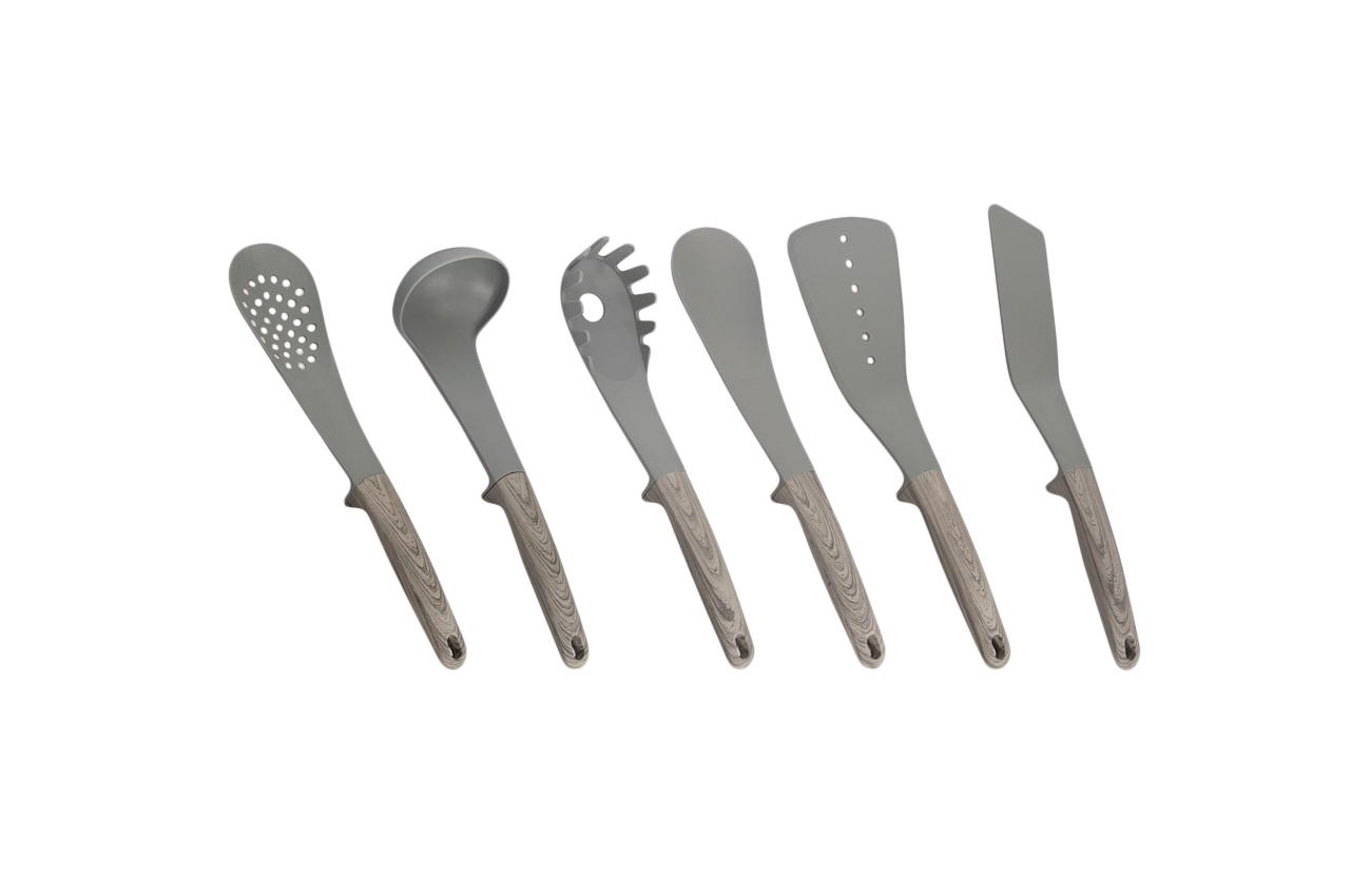 Набір складається з: лопатка,ополоник, шумовка, ложка, підставка, ложка для спагетті. Зручність у використанні. Сучасний елегантний дизайн.