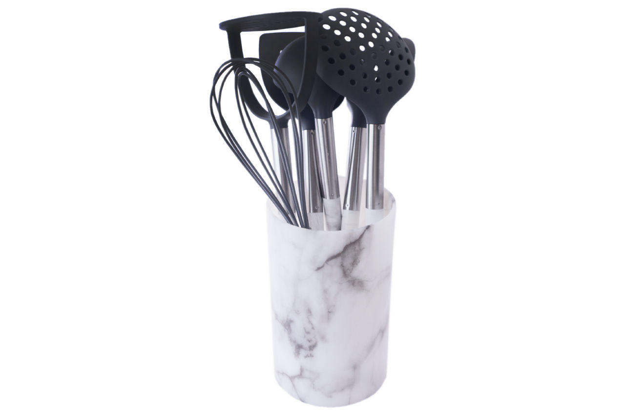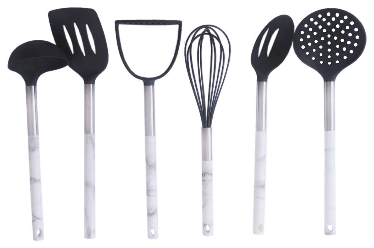 Набір кухонний Maestro - кухонний набір функціональною частиною з нейлону призначений для антипригарного посуду. Набір Maestro складається з 7 кухонного приладдя та склянки-підставки. Функціональна частина і пластикова рукоятка з принтом у вигляді мармуру надійно кріпляться на основі високоякісної нержавіючої сталі