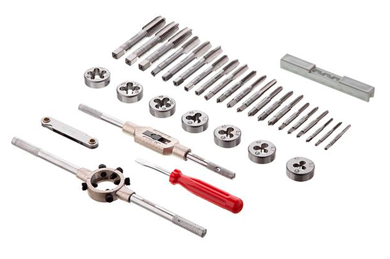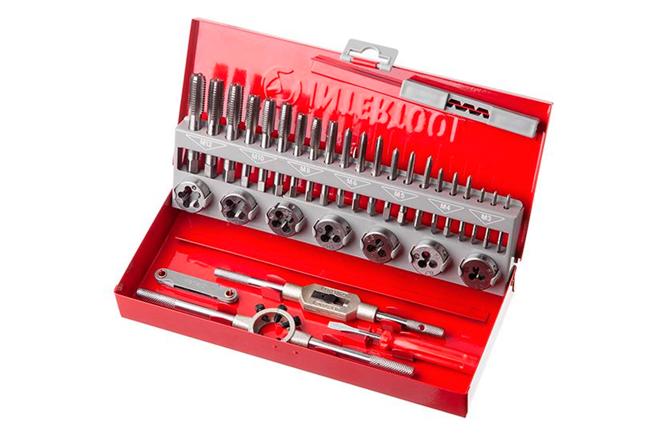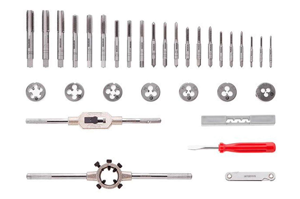 Набір мітчиків і плашок "Intertool" професійний. Плашки (7 шт.): М3, М4, М5, М6, М8, М10 і М12. Мітчики (21 шт.): М3, М4, М5, М6, М8, М10 і М12 (по 3 номери кожного) + плашкодержатель, Метчикоутримувачі, плоска викрутка і вимірювач кроку різьблення. Всього в наборі 32 предмета. Розміри: М3x0.5, М4x0.7, М5x0.8, М6x1.0, М8x1.25, М10x1.5, М12x1.75; Кількість одиниць в наборі: 32 од.