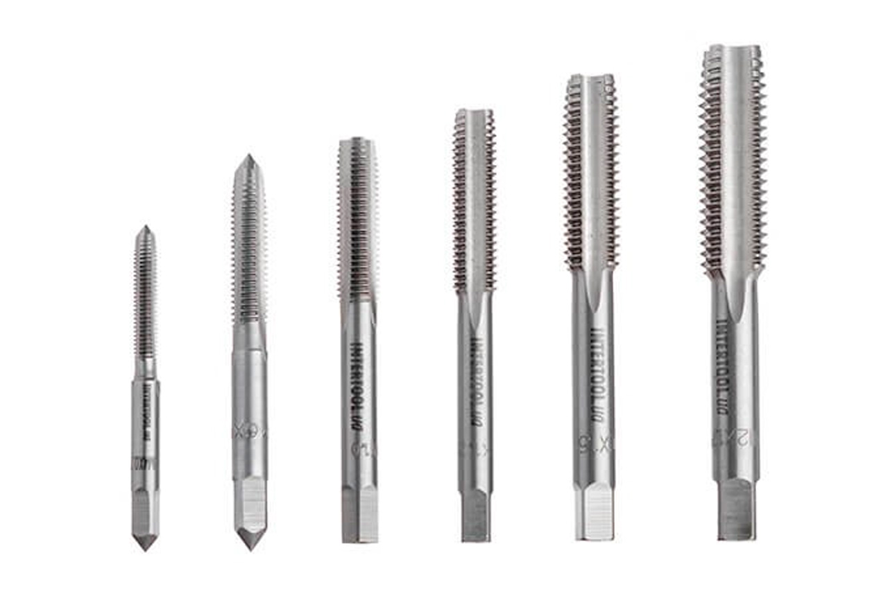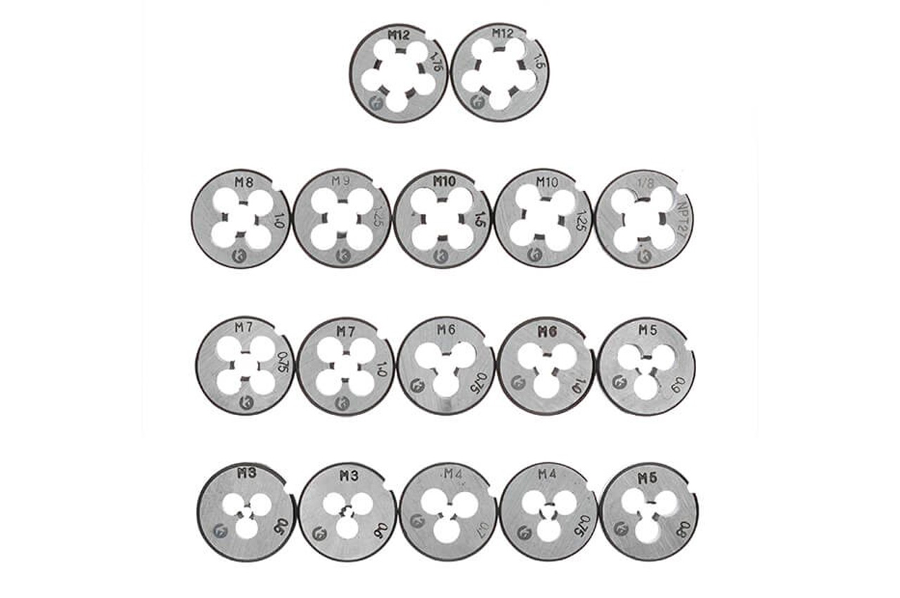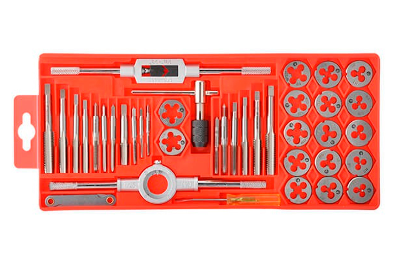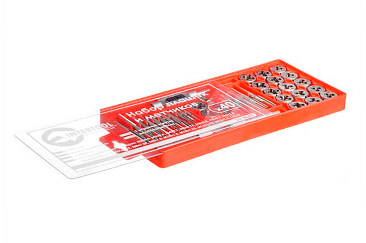 Набір мітчиків і плашок "Intertool" М3, М4, М5, М6, М7, М8, М10 і М12 з двома варіантами кроку різьблення і 1 / 8NTP-27 з одним кроком + плашкодержатель, Метчикоутримувачі, патрон з воротком, плоска викрутка і вимірювач кроку різьблення. Всього в наборі 40 предметів. Кількість: 40 од .; Розмір плашок: M3-M12; Розмір мітчиків: М3-М12