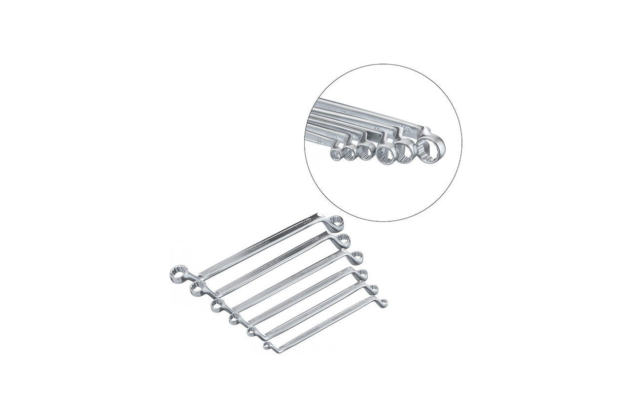 XT-1201 - набір з 6 накидних ключів. Кільцевий будова робочої частини дозволяє рівномірно розподіляти навантаження в момент прикладання зусилля, що істотно знижує ризик «злизати» грань кута. Надійність і довговічність інструменту забезпечує матеріал виготовлення ключів - хром-ванадієва сталь. Це обумовлює дуже високі експлуатаційні характеристики: підвищену стійкість до механічних навантажень, корозійну стійкість і твердість. Крім того, дана легована сталь має сприятливим модулем пружності, а зручна форма ключа і спеціальний вигин забезпечують оптимальні умови для прикладення зусилля навіть в тих місцях, де звичайний ріжкової ключ буде марний. Набір поставляється в чохлі з кишеньками під кожен ключ. Кількість ключів в наборі: 6 од .; Розміри: 6-17 мм