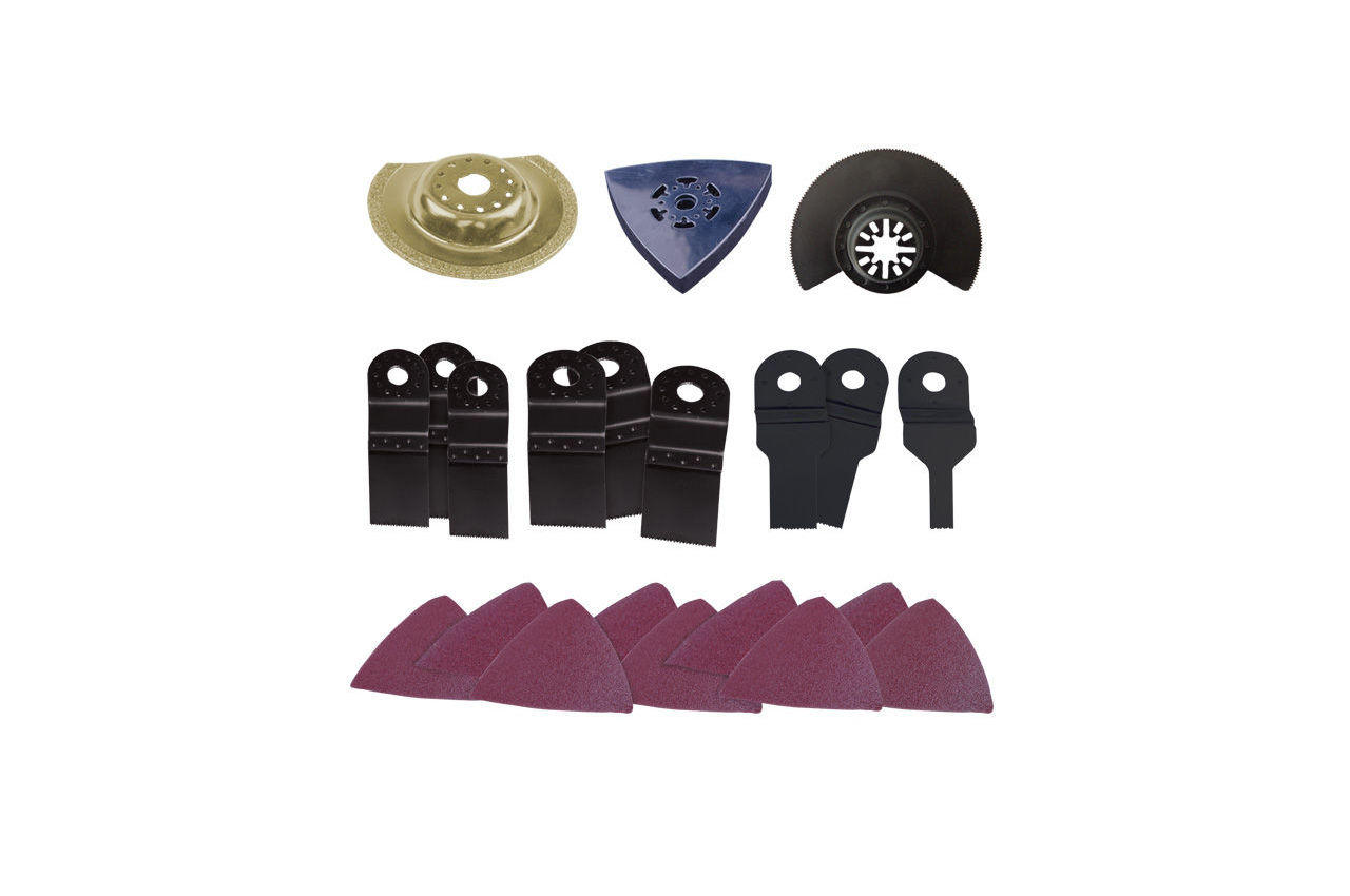 Набір аксесуарів призначений для універсального інструменту, такого як РЕНОВАТОР. Містить в собі широкий вибір насадок для різних видів робіт. Складається з 21 од .: 2 пильних диска по каменю, дереву, пластику, плитці; 3 пильних полотна по дереву та каменю; 3 пильних полотна по дереву і м'яким металам, з глибиною просила до 40 мм; 2 пильних полотна по дереву і м'яким металам, з глибиною просила до 30 мм; 1 пильне полотно по дереву і м'яким металам, з глибиною пропила до 25 мм; Основа для шліфування; 9 шліфувальних пелюсток (3 х К80; 3 х К120; 3 х ДО240). Якщо у Вас вже є в арсеналі РЕНОВАТОР DT-0523, то Ви можете додатково придбати до нього цей набір насадок і виконувати найрізноманітнішу роботу по дому. Поставляється в зручному пластиковому кейсі. Кількість: 21 од.