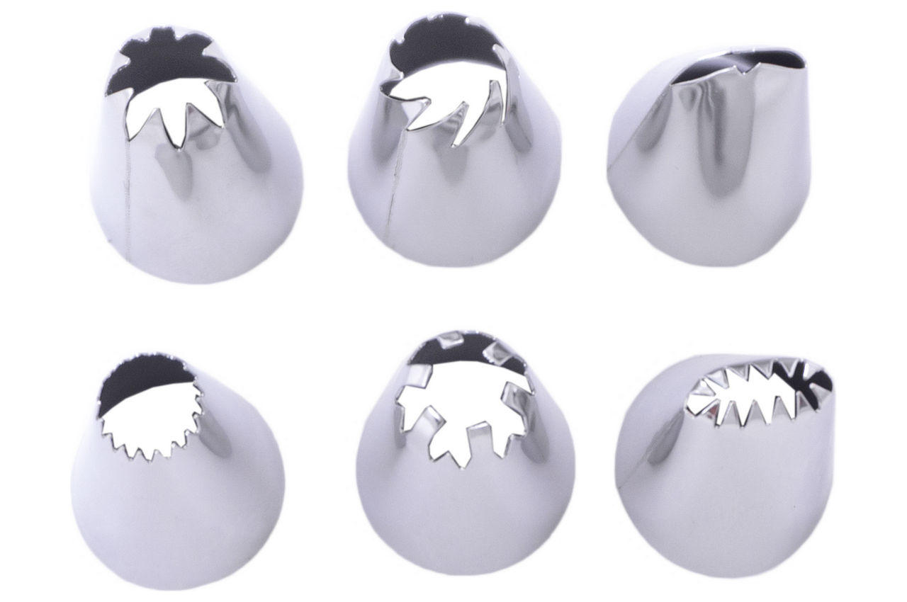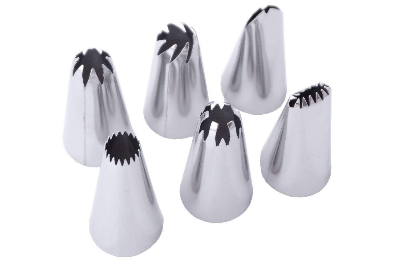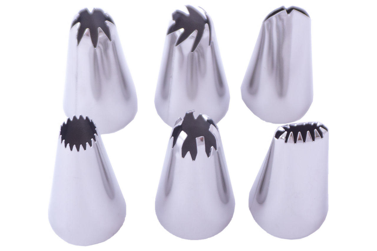 Набір насадок кондитерських Empire в допомогу початківцям кулінарам і професіоналам зі стажем. З їх допомогою майстра створюють оригінальні "бордюри" для мафінів, тістечок і тортів. Всі 8 елементів висотою 33 мм і діаметром 17 мм виконані з високоміцної нержавіючої сталі. Матюкав не схильний до корозії, а виразний рельєф вихідного отвору дає зелене світло найбільш незвичайним композиціям. Не менш важливою перевагою металевих насадок Empire над пластиковими аналогами вважається краща стійкість до ударів і подряпин.