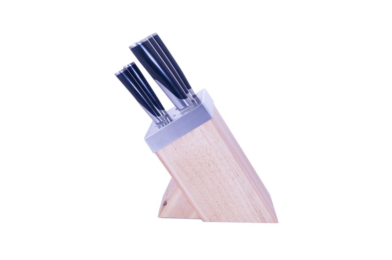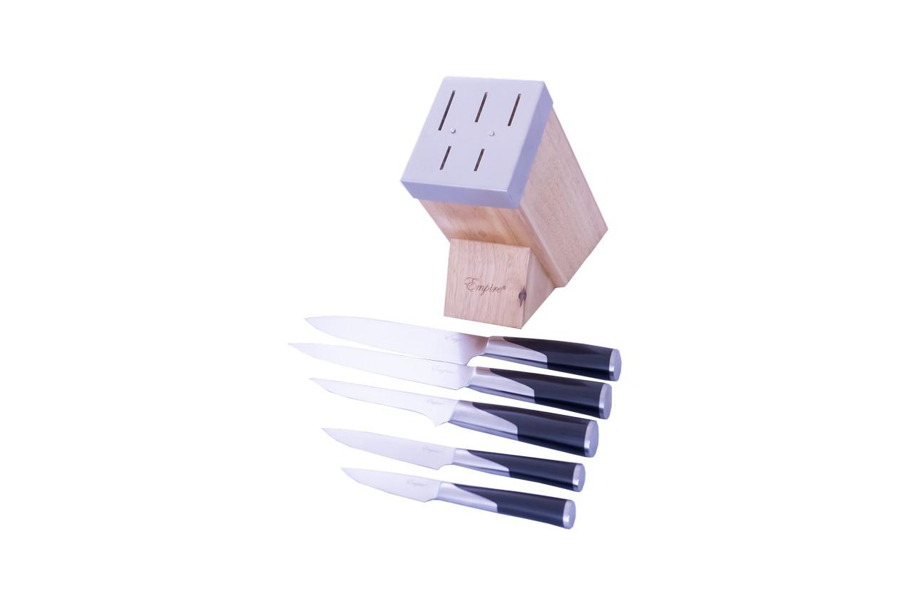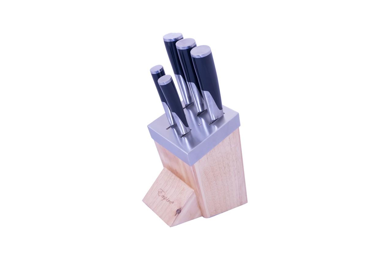 Набір кухонних ножів Empire з дерев'яною підставкою в комплекті - в топі товарів для домашньої кухні. Виконані з харчової нержавійки, все 5 інструментів не іржавіють, виявляють підвищену стійкість до високих температур і деформацій. Ергономічні ручки забезпечують зручність хвата, а надгострий леза істотно спрощують обробку твердих інгредієнтів.