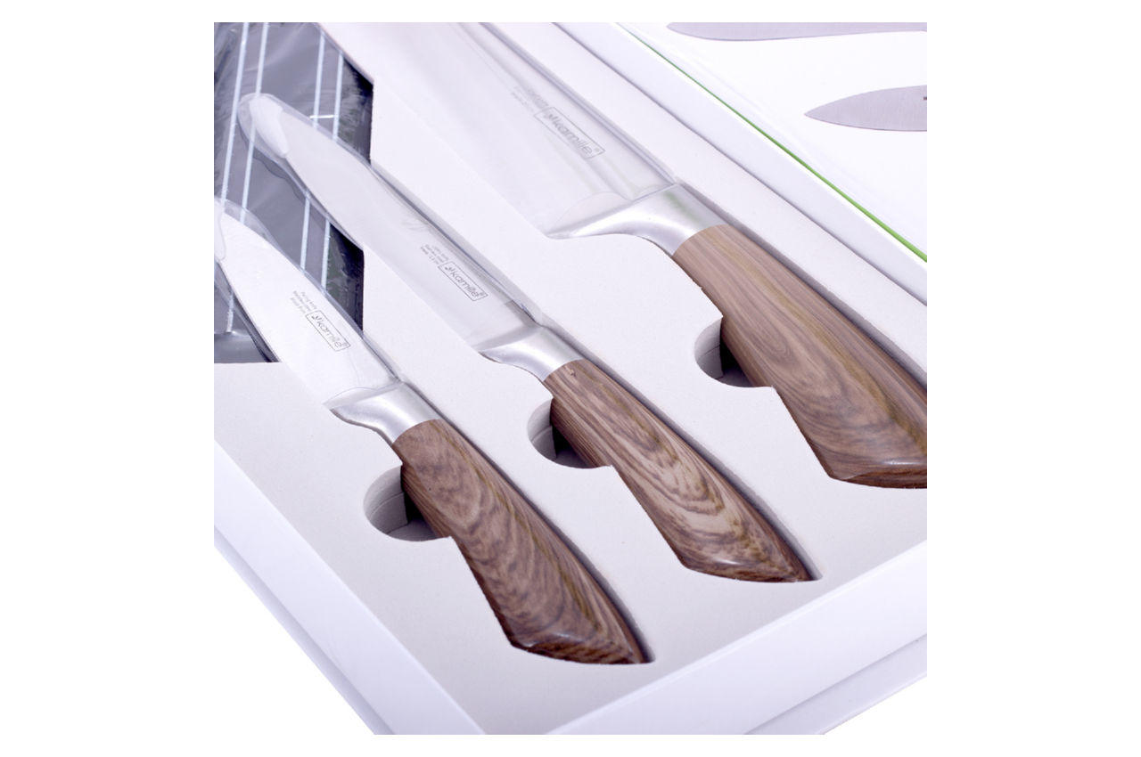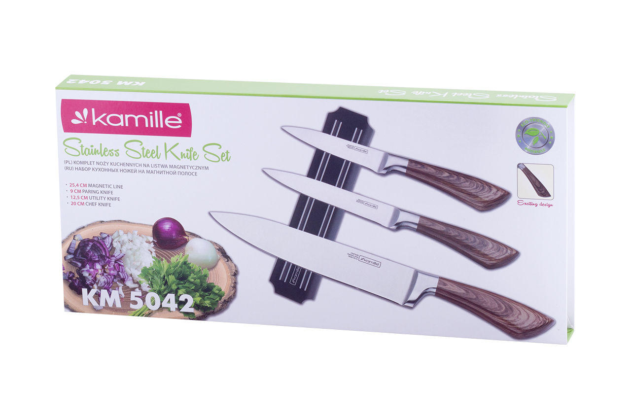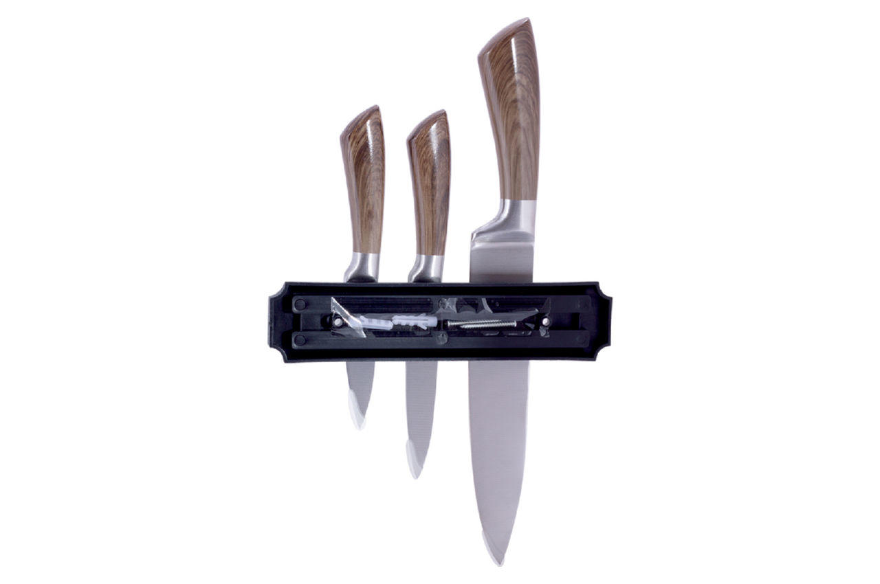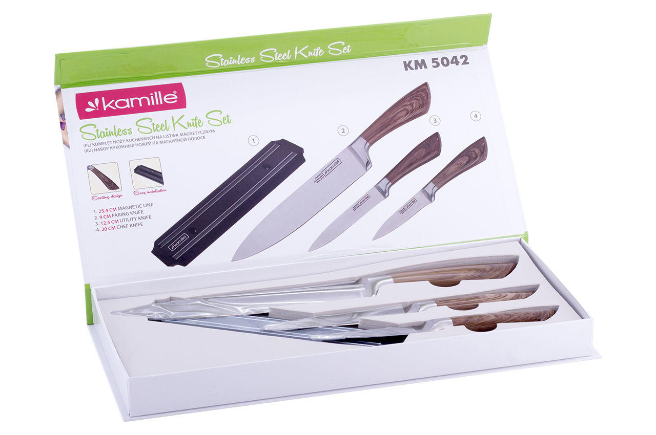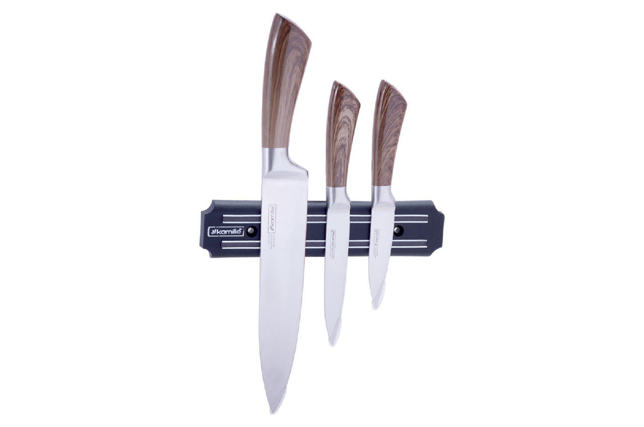 Набір кухонних ножів створений за найбільш сучасним і модним технологій і тенденцій. Він викличе захват навіть у самого вимогливого покупця. Комплект: ніж "Шеф-кухар" (20 см) ніж універсальний (12,5 см) ніж для чищення овочів (9 см) магнітний тримач (25,4 см)