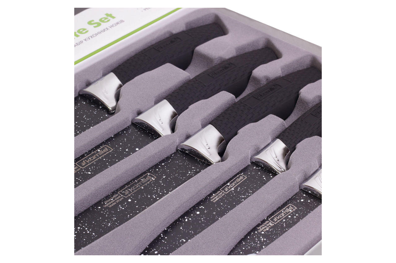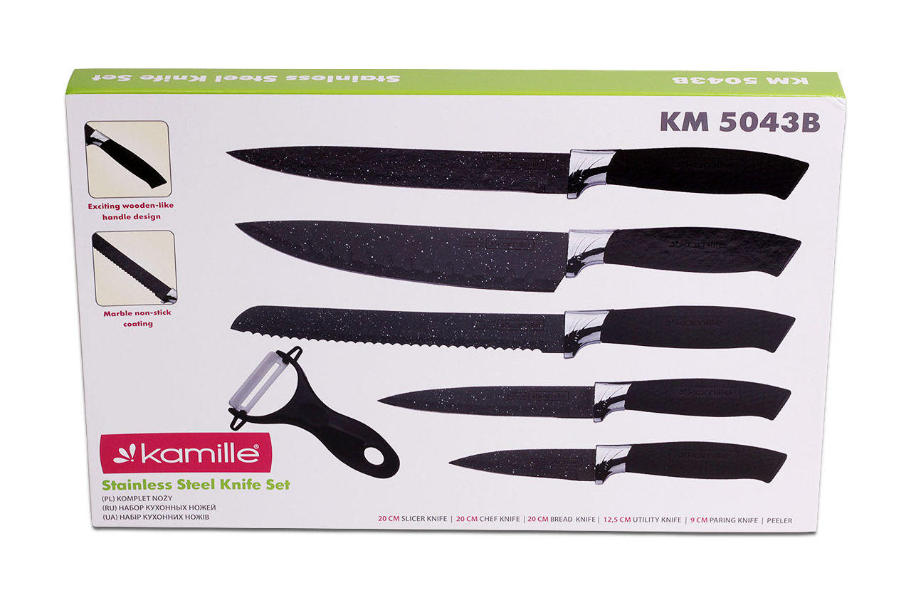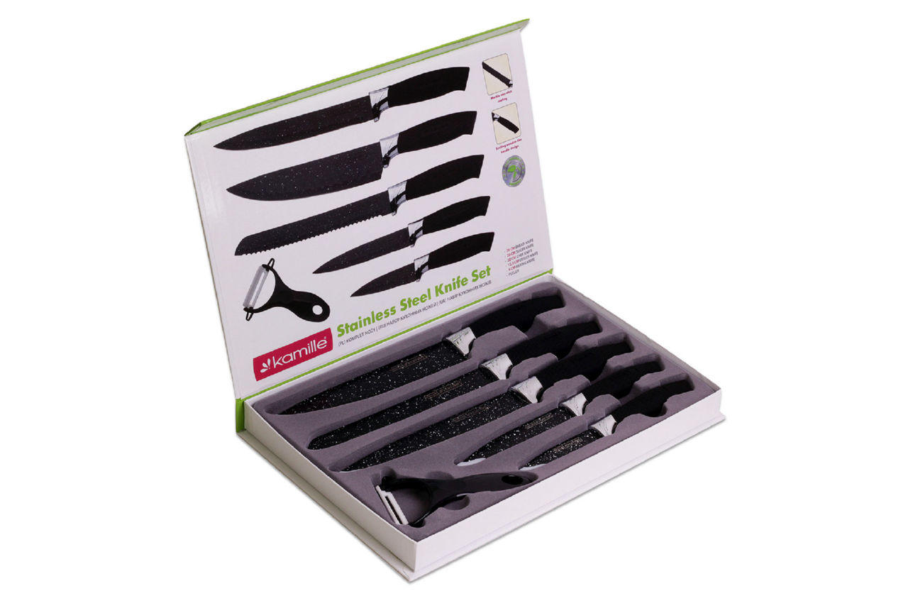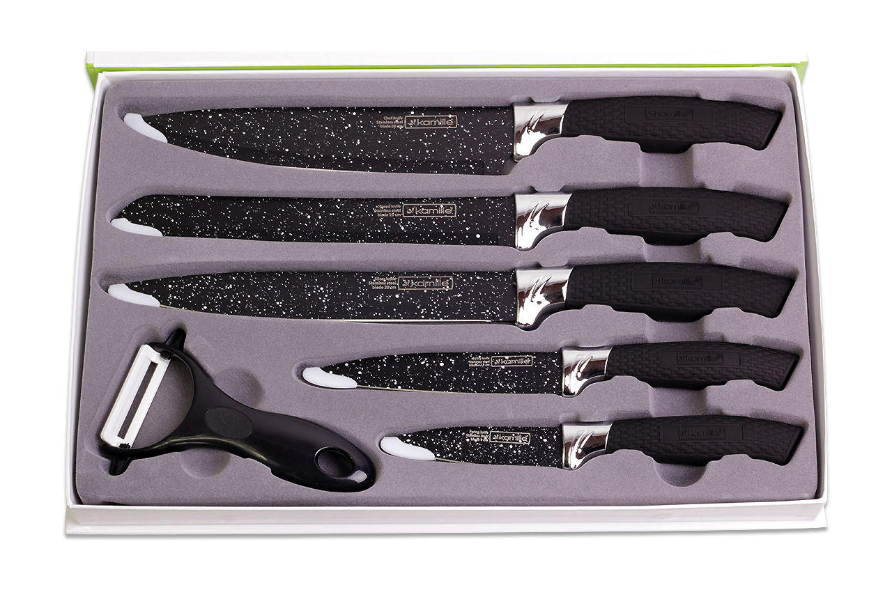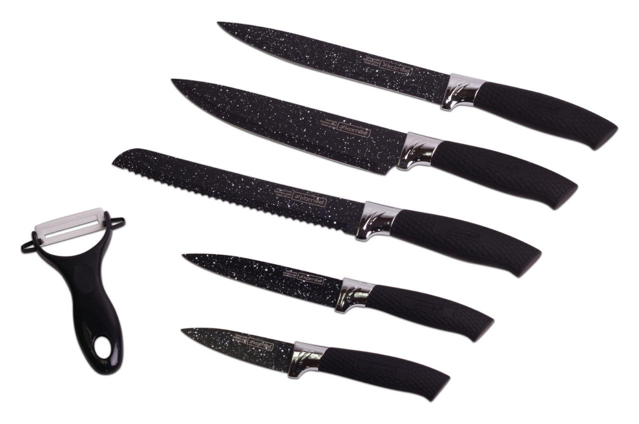 Набір кухонних ножів створений за найбільш сучасним і модним технологій і тенденцій. Він викличе захват навіть у самого вимогливого покупця Комплект: ніж "Шеф-кухар" (20 см) ніж для нарізки (20 см) ніж для кісток (15 см) ніж універсальний (12,5 см) ніж для чищення овочів (9 см) овощечитска (піллер)
