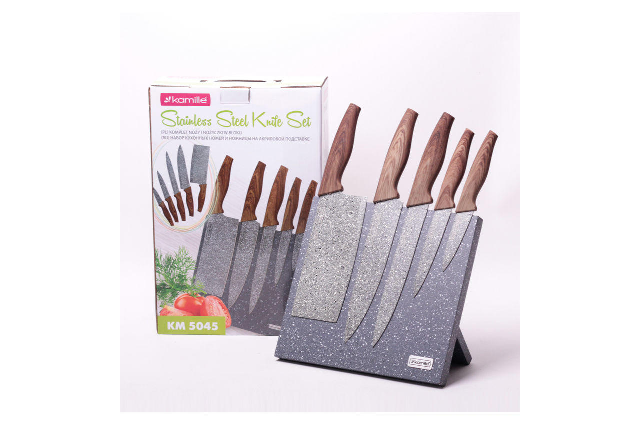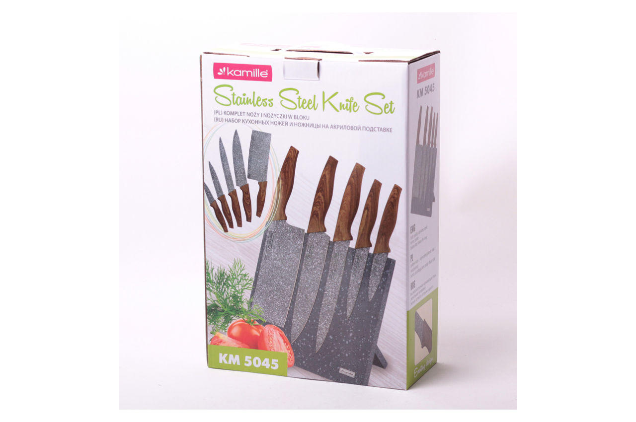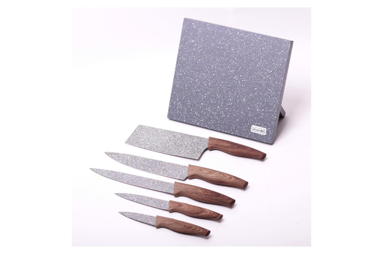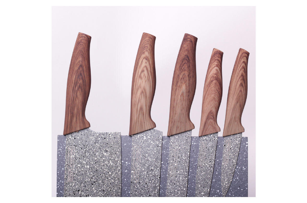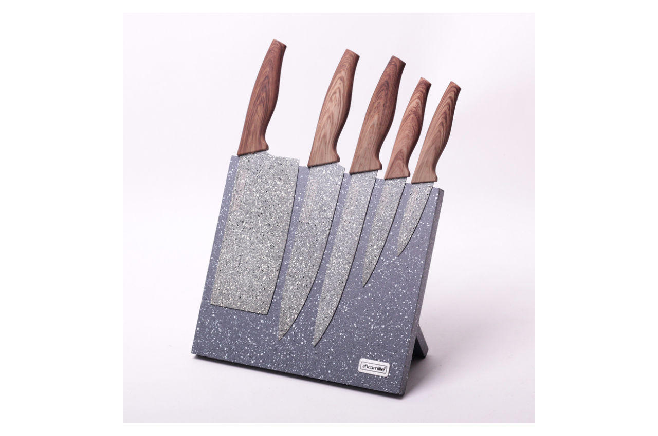 Набір кухонних ножів створений за найбільш сучасним і модним технологій і тенденцій. Він викличе захват навіть у самого вимогливого покупця. Набір кухонних ножів стане прикрасою Вашої кухні і додасть неповторність до Вашого інтер'єру. Комплектація: ніж для чищення овочів (9см) універсальний (12.5 см) Шеф-кухар (20см) ніж для нарізки (20см) чоппер (16см), підставка.