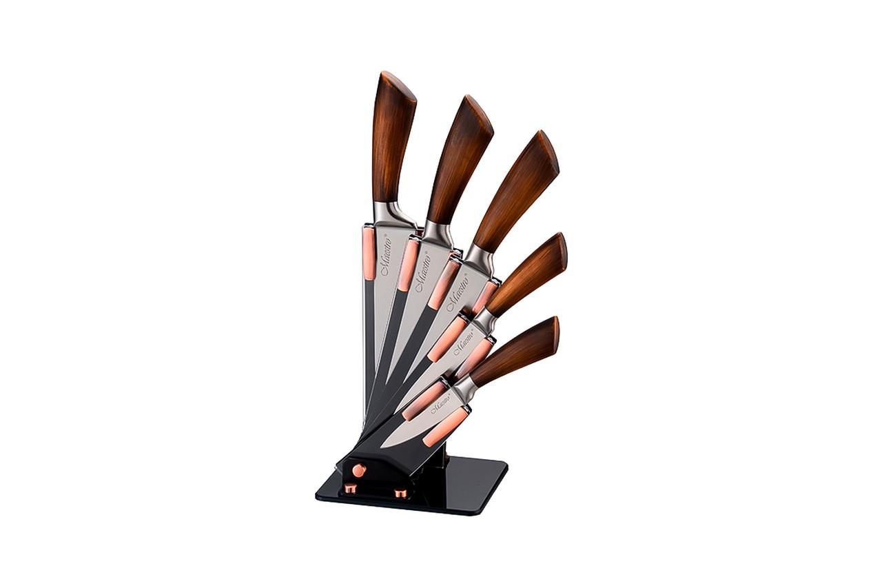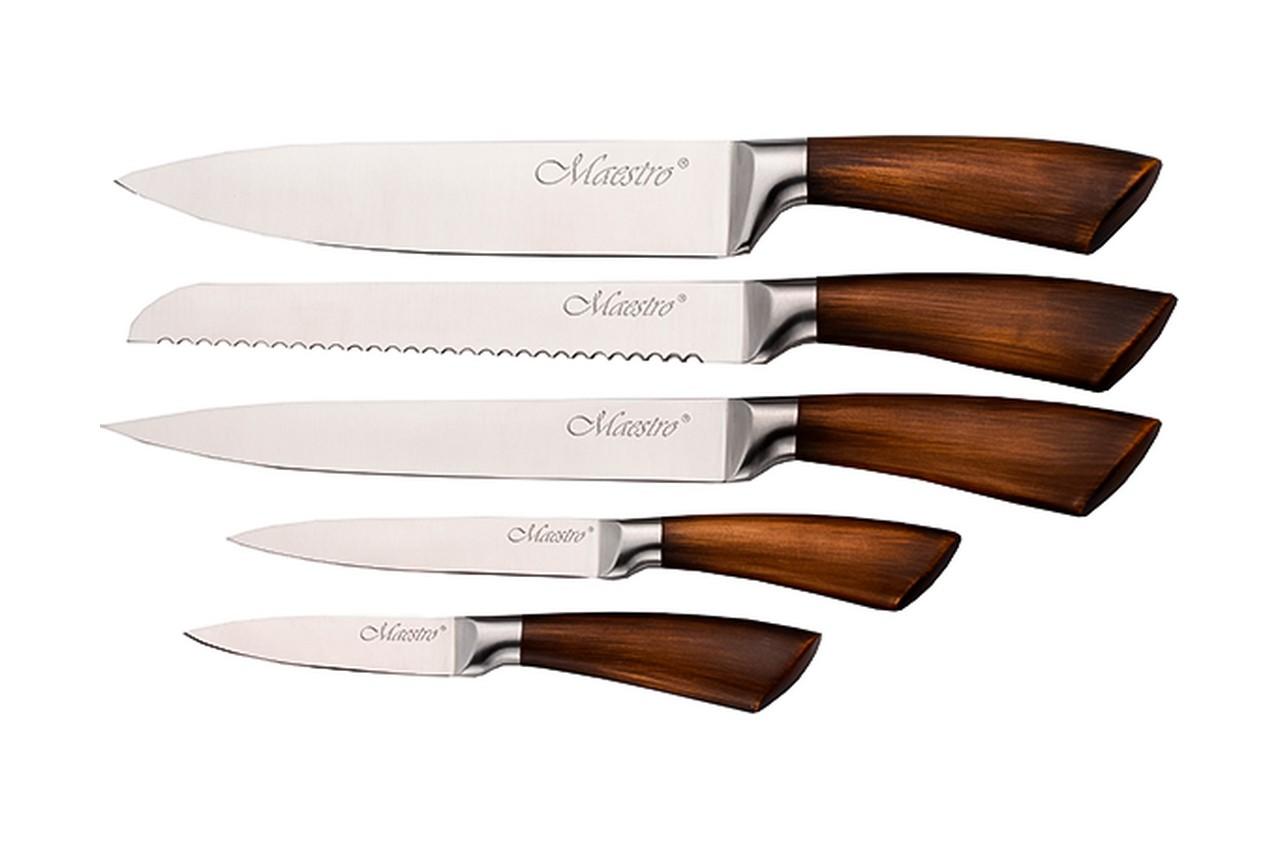 Набір ножів Maestro MR 1414 складається з 6 предметів: акрилової підставки та п'яти кухонних ножів із високоякісної нержавіючої сталі з рукоятками з полімерного матеріалу, що імітує дерево. Леза ножів професійно заточені та довго зберігають гостру ріжучу кромку.