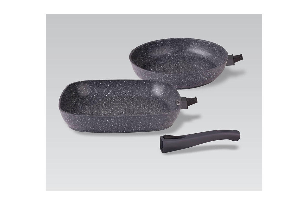 Набір сковорідок Maestro MR 4800 складається з 3 предметів: універсальна сковорода діаметром 24 см, сковорода-гриль 26х26 см, знімна ручка з фіксатором на кнопці. Корпус сковорідок виготовлений з міцного литого алюмінію, що швидко і рівномірно розподіляє тепло, в дно вставлений сталевий антидеформаційний диск, що дозволяє використовувати в якості джерела тепло не тільки класичні газові та електро плити, але і індукцію. Усередині нанесено стійке до механічного впливу гранітне антипригарне покриття (Granite). Зручна знімна ручка з кнопкою, що фіксує, дозволяє користуватися сковорідками як на плиті так і в духовці.