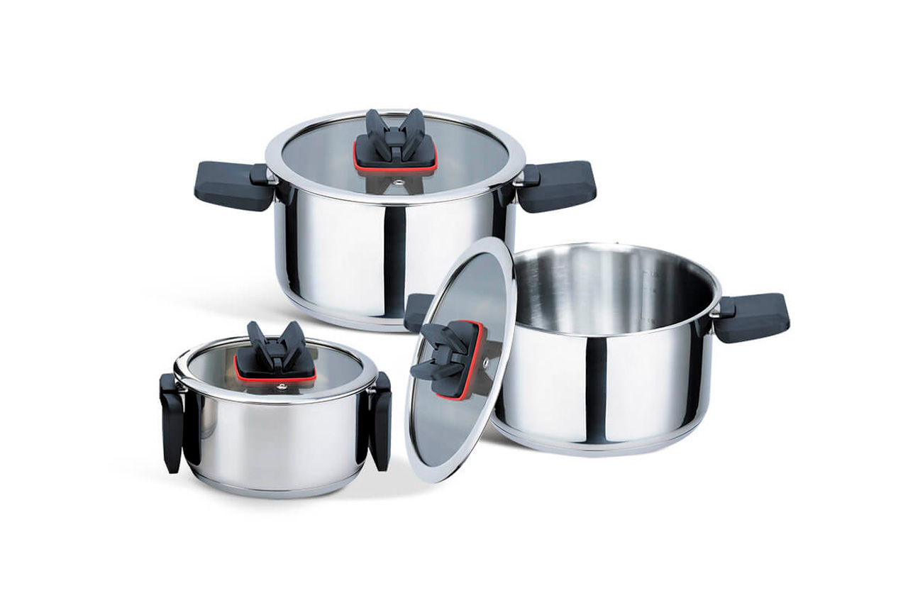 Набір каструль Maestro MR-3531-6: Матеріал каструлі: високоякісна нержавіюча сталь Матеріал ручок: бакеліт, що не нагрівається. Багатошарове термоакумулююче дно Ручки, що складаються з боків каструлі і на кришці Кришка з жароміцного розпеченого скла з отвором для виходу пари Можна мити в посудомийній машині Підходить для всіх типів плит, у тому числі для індукційної. Простота та зручність у використанні та догляді Сучасний ергономічний дизайн Склад набору: Каструля з кришкою (об'єм: 1,5 л; 16 х 8 см) Каструля з кришкою (об'єм: 3,5 л; 20 х 11,5 см) Каструля з кришкою (об'єм: 6,6 л; 24х15 см)