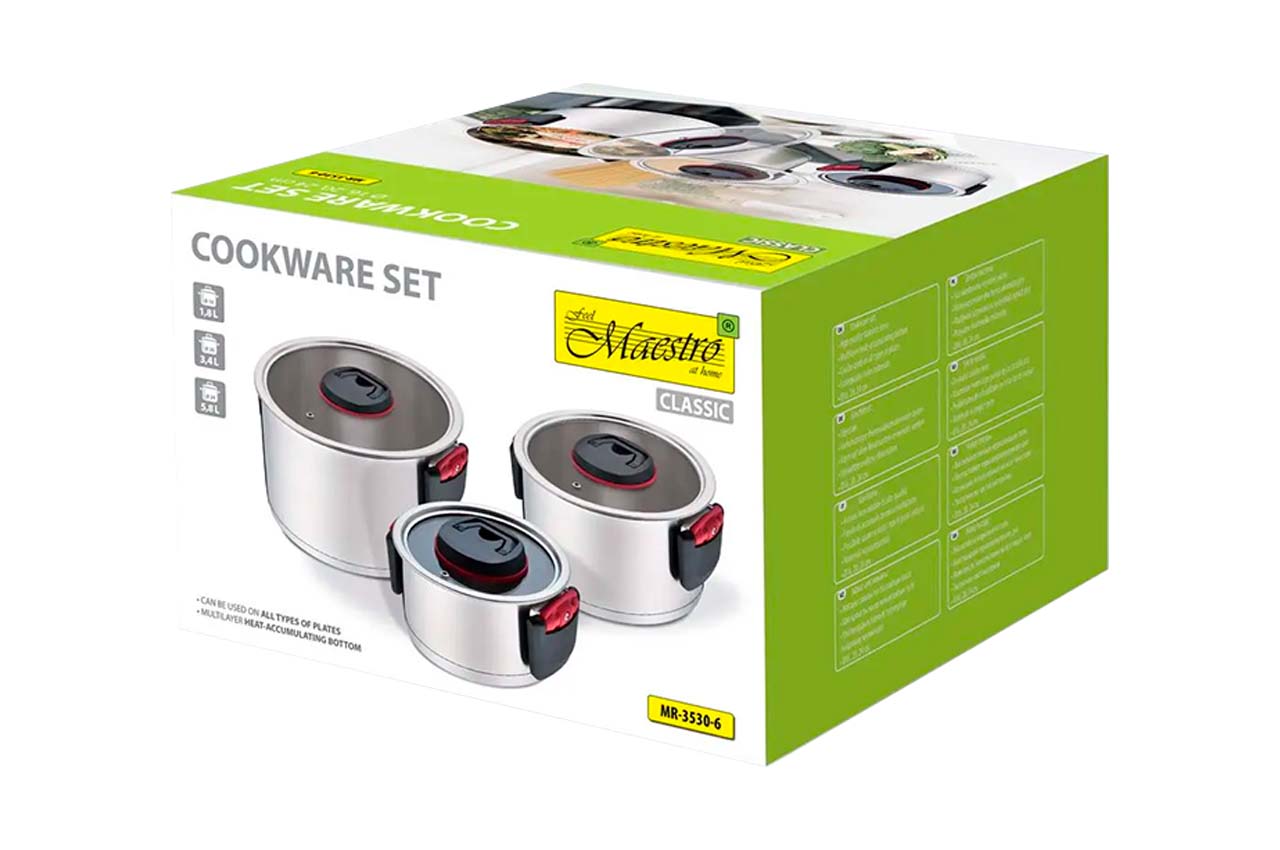 Набір посуду нержавіючий Maestro MR-3530-6. Діаметр: 16см, 20см, 24см. Об'єм: 1,5л, 3,2л, 5,8л. Високоякісна нержавіюча сталь. Багатошарове термоакумулююче дно. Можливе використання на всіх типах плит. Екологічно чисті матеріали.