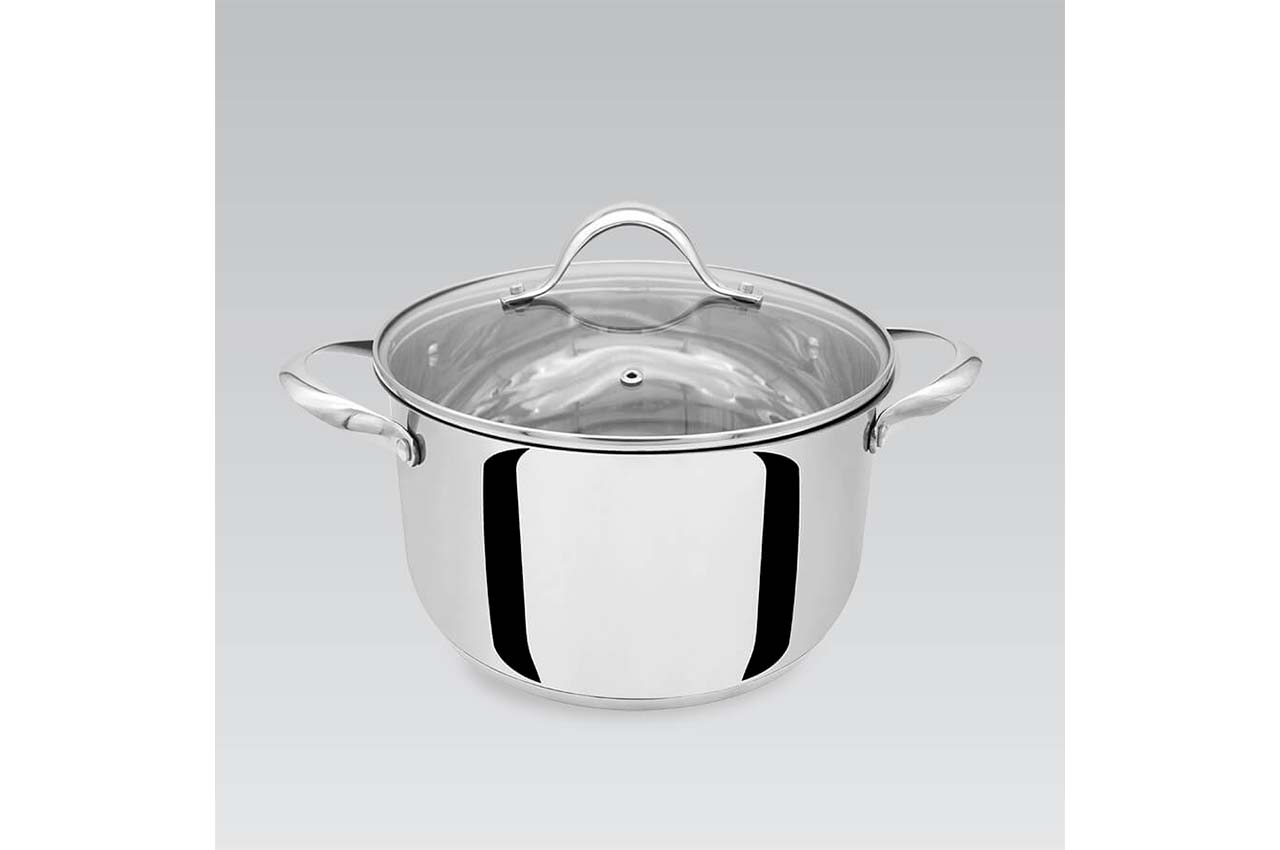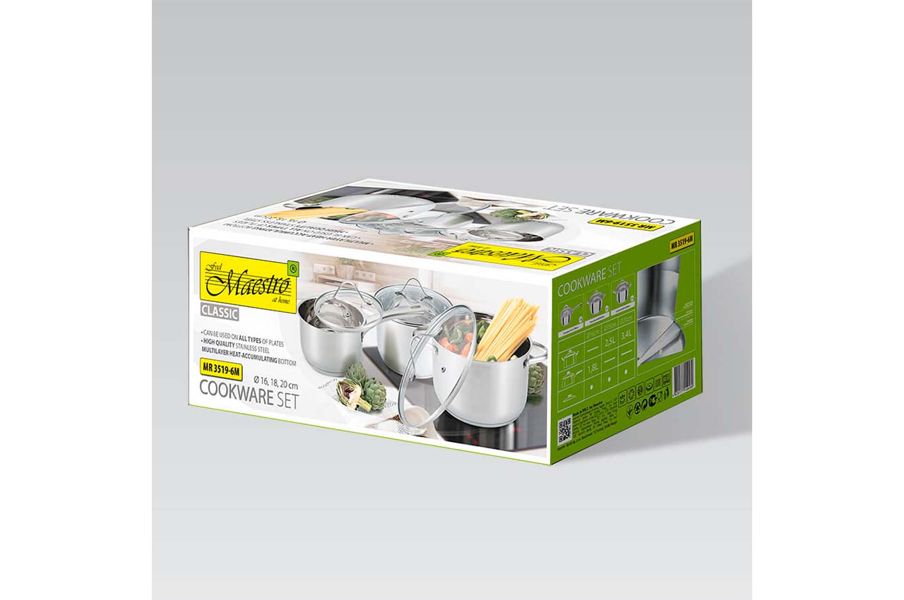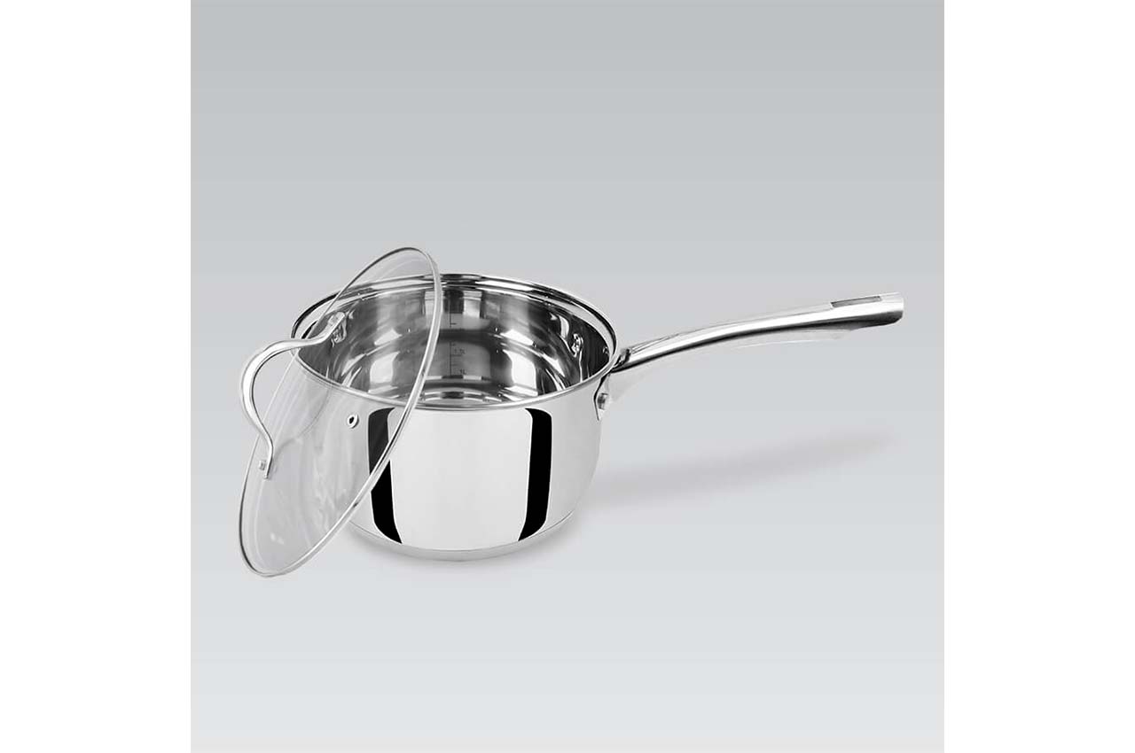 Майже весь модельний ряд Maestro MR 3519 можна придбати в одному наборі - MR 3519-6M. Бракує тільки з великої моделі, її можна купити окремо. Каструлі виконані у сучасному дизайні. Полірування дзеркальне, каструлька звужена до низу, що надає їй витонченості. Є шкала рівня рідини. Ручки на заклепках.