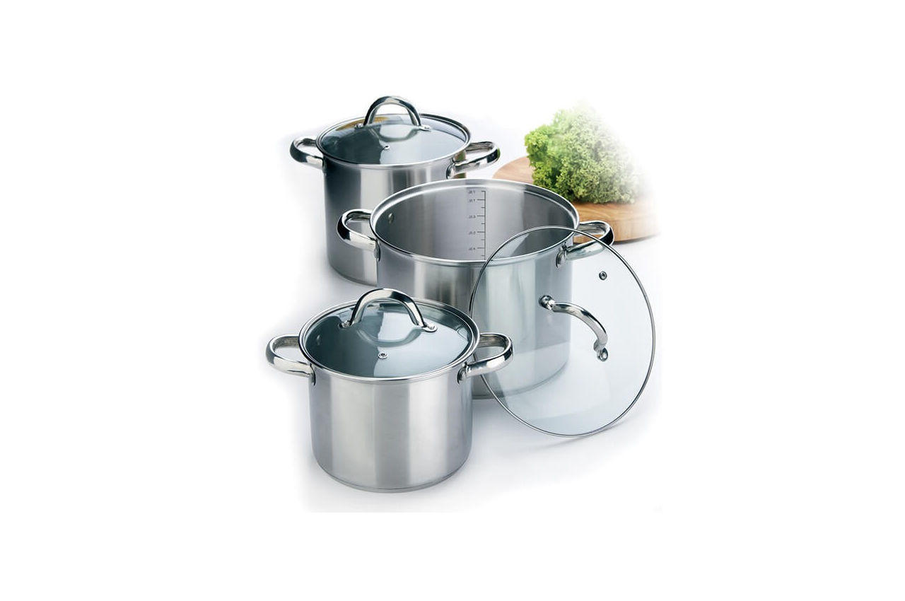 Каструля з кришкою 3.5 л Ø 18 см - 1 шт., Каструля з кришкою 4.5 л Ø 20 см - 1 шт., Каструля з кришкою 8 л Ø 24 см - 1 шт. Шкала об'єму рідини усередині виробу, надійне клепочное кріплення, багатошарове термоаккумулирующее дно, високоякісна нержавіюча сталь.