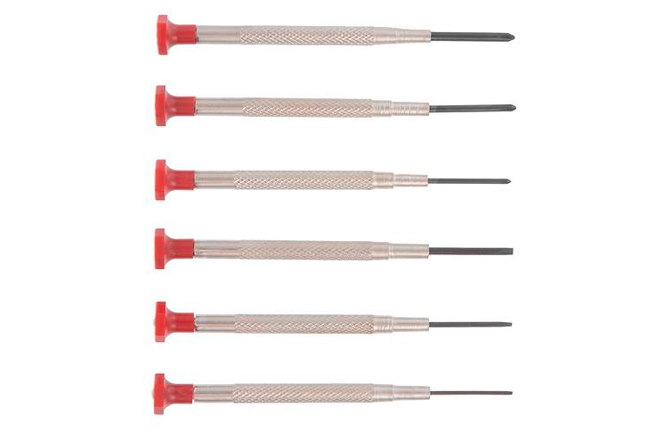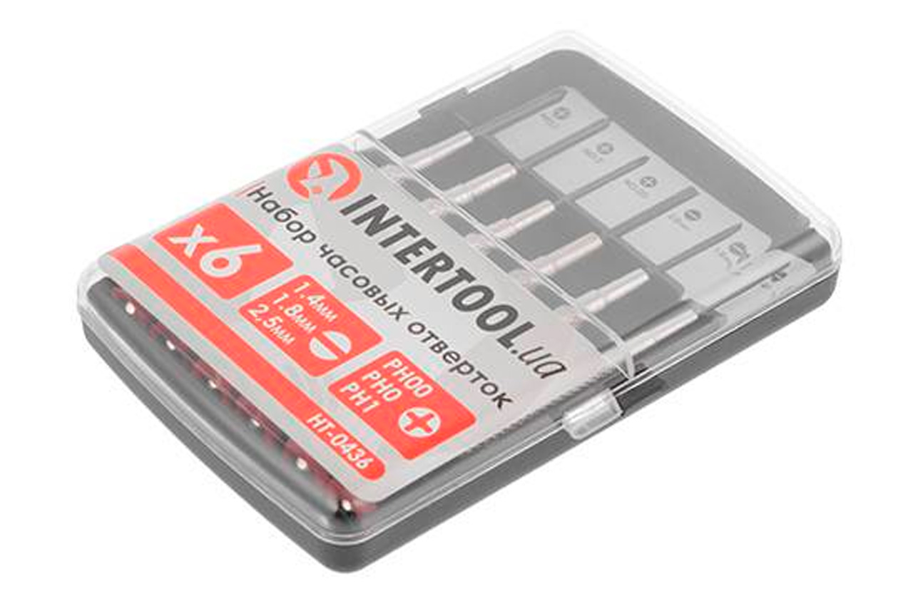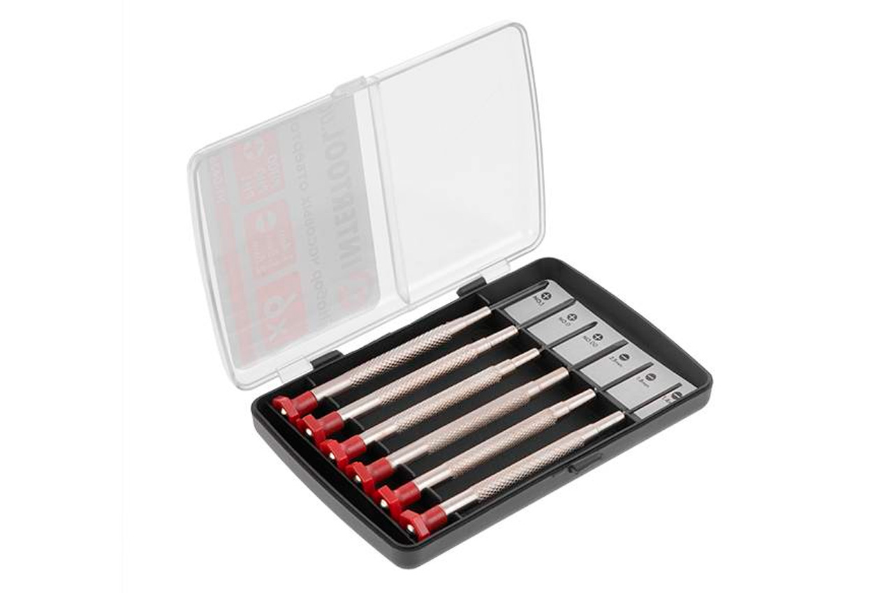 Набір прецизійних часових викруток: SL1.4, SL1.8, SL2.5, PH0, PH00 і PH1. Поставляється в пластиковій коробочці. Кількість в наборі: 6 шт