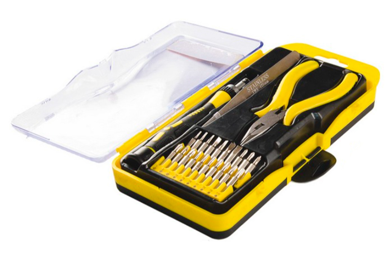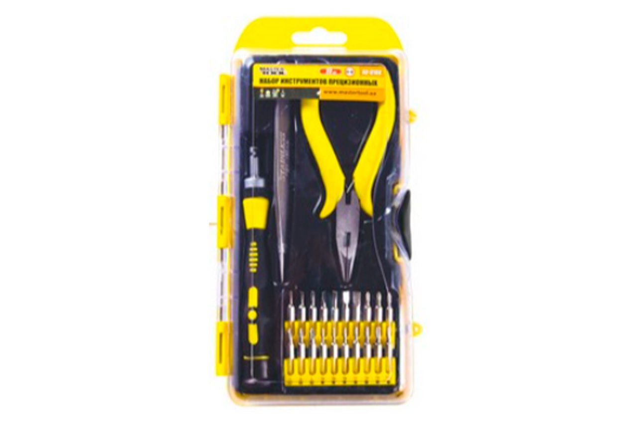 Призначені для точних механічних робіт та операцій з дрібними деталями. Включає запобігає прослизання двухком- понентную (гума + пластик) рукоятку 115мм. 20 отверточних насадок 28мм.Держатель. Щипці прямі. Пінцет.