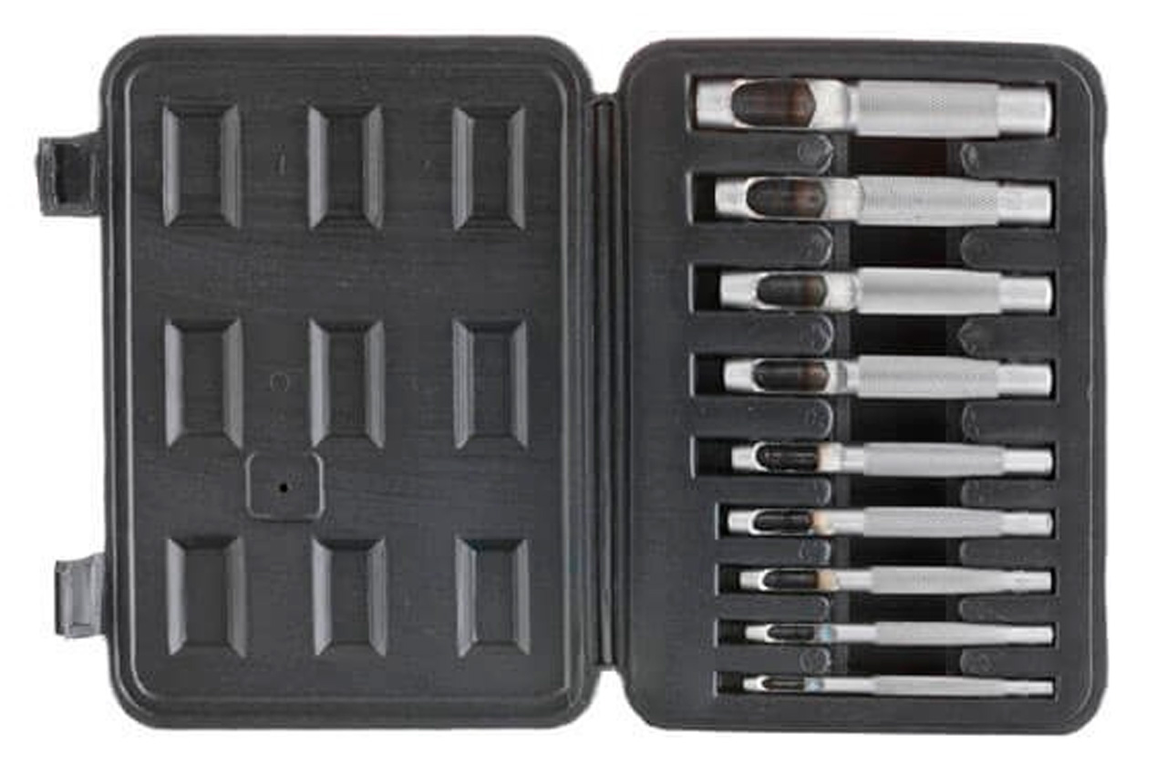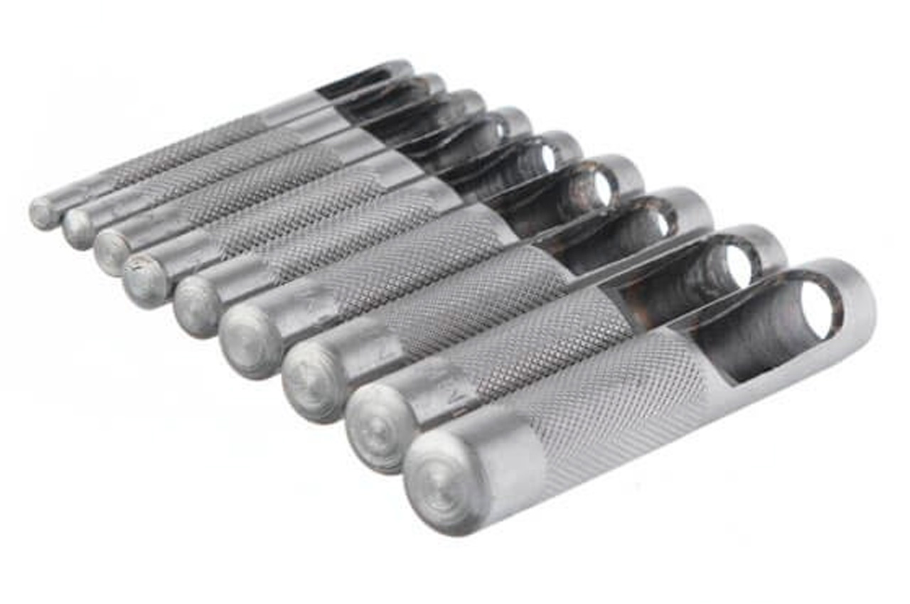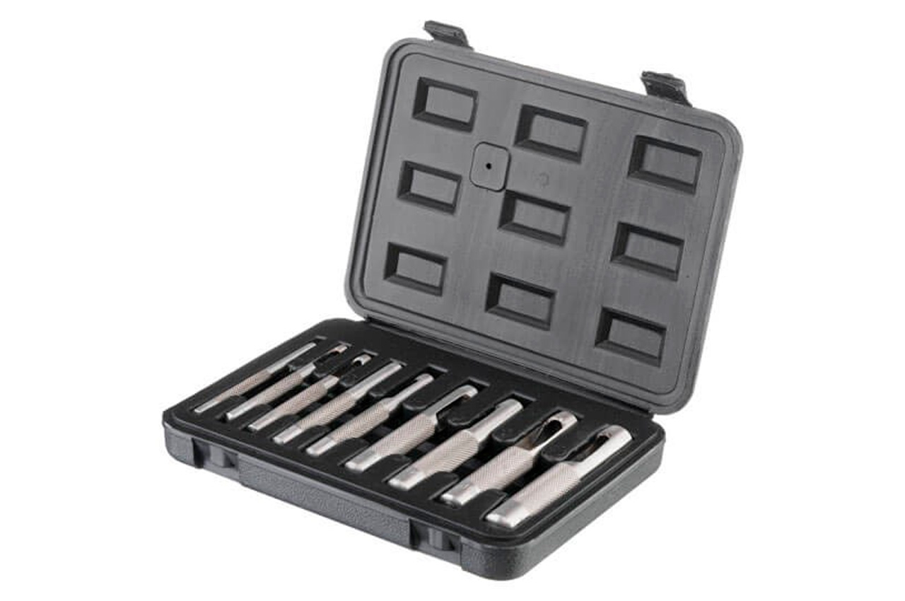 Застосовується для висікання ажурних візерунків на листовому металі, а також для вирубки прокладок з гуми, шкіри, пластмас та інших матеріалів. У наборі 9 шт. (3-12 мм). Поставляються в пластиковому кейсі. Кількість: 9 од .; Розміри: 3, 4, 5, 6, 7, 8, 9, 10, 12 мм