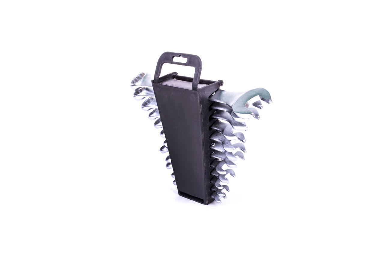 Набір з 12-ти рожково-накидних ключів. Розмірна лінійка: 6, 7, 8, 9, 10, 11, 12, 13, 14, 17, 19 і 22 мм. Ключі поставляються в зручному пластиковому утримувачі з отвором для підвішування. Хром-ванадієва сталь. Кількість ключів в наборі: 12 од .; Розміри: 6-22 мм