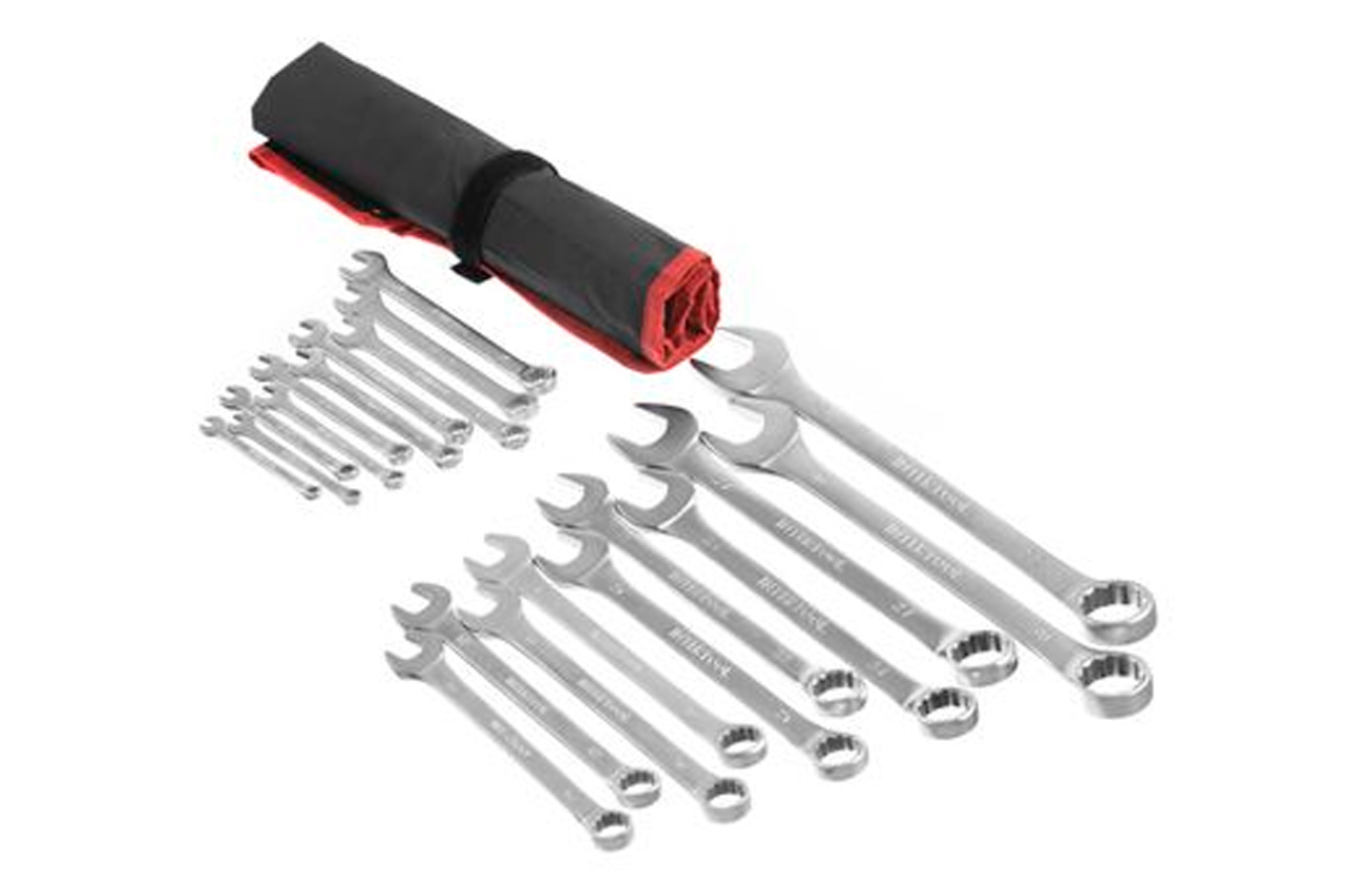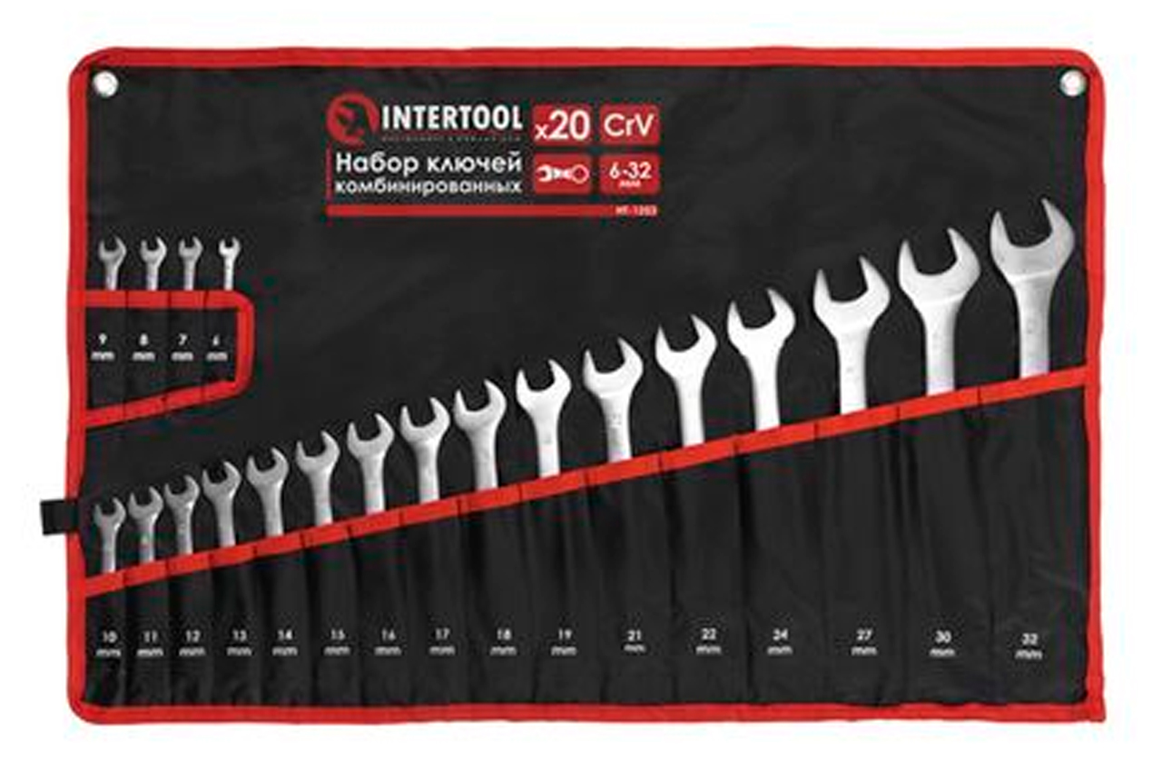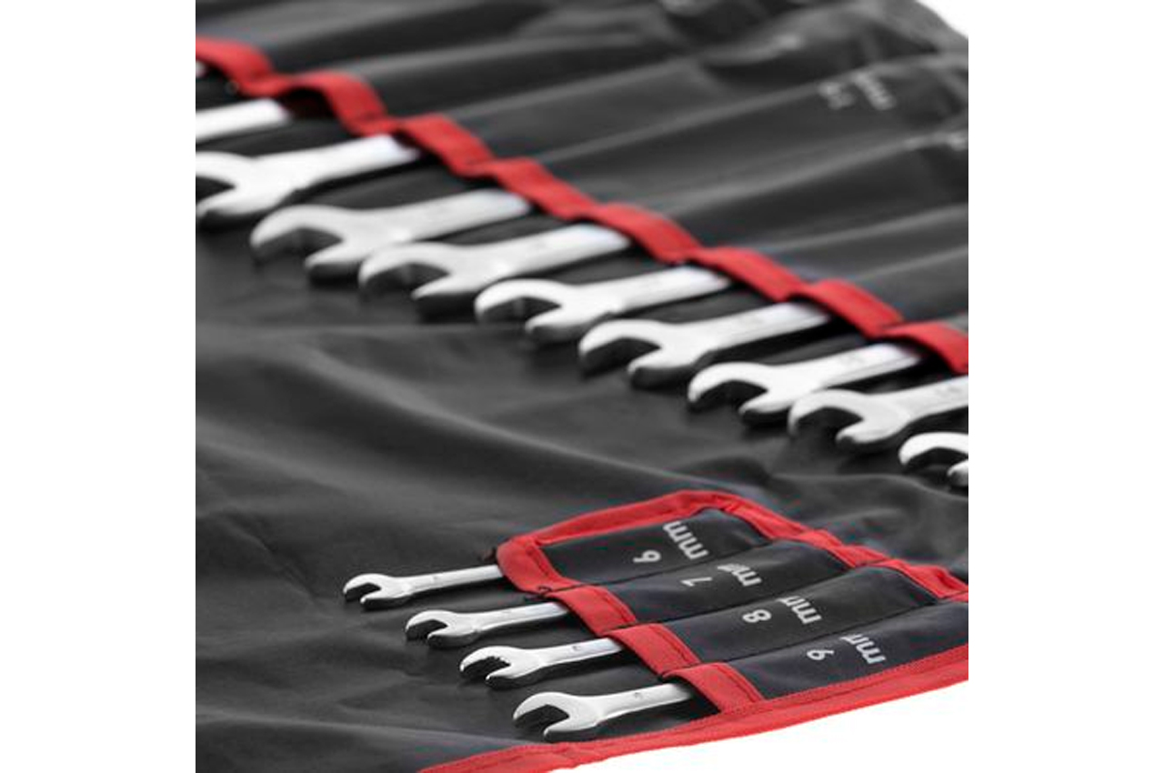 У набір увійшли найпоширеніші розміри гайкових рожково-накидних ключів: 6, 7, 8, 9, 10, 11, 12, 13, 14, 15, 16, 17, 18, 19, 21, 22, 24, 27, 30, 32 мм. Виготовлені з міцної Cr-V стали, мають підвищений запас міцності і витримують значні навантаження. Ви відразу знайдете необхідний розмір ключа, завдяки пронумерованим індивідуальним кишенями під кожен розмір. Набір зручно брати з собою, разом з іншими інструментами - компактно складається в невеличкий пакунок і фіксується в закритому положенні застібкою на липкій стрічці. Займе мінімум місця в гаражі - подвершівается на стіну в розкладеному вигляді, за допомогою металевих люверсів по краях чохла. Цей універсальний набір ключів знадобиться в будь-якій області діяльності, жоден майстер не відмовиться від такого корисного подарунка. Особливості Тверда і зносостійка Cr-V сталь, не схильна до руйнування Широкий і часто використовуваний розмірний ряд Зручно зберігати: чохол з люверсами і застібкою Кожен ключ в персональній осередку з відповідним номером для зручності в роботі Кількість ключів в наборі: 20 од .; Розміри ключів: 6-32 мм; Габаритні розміри: 660 х 420 мм