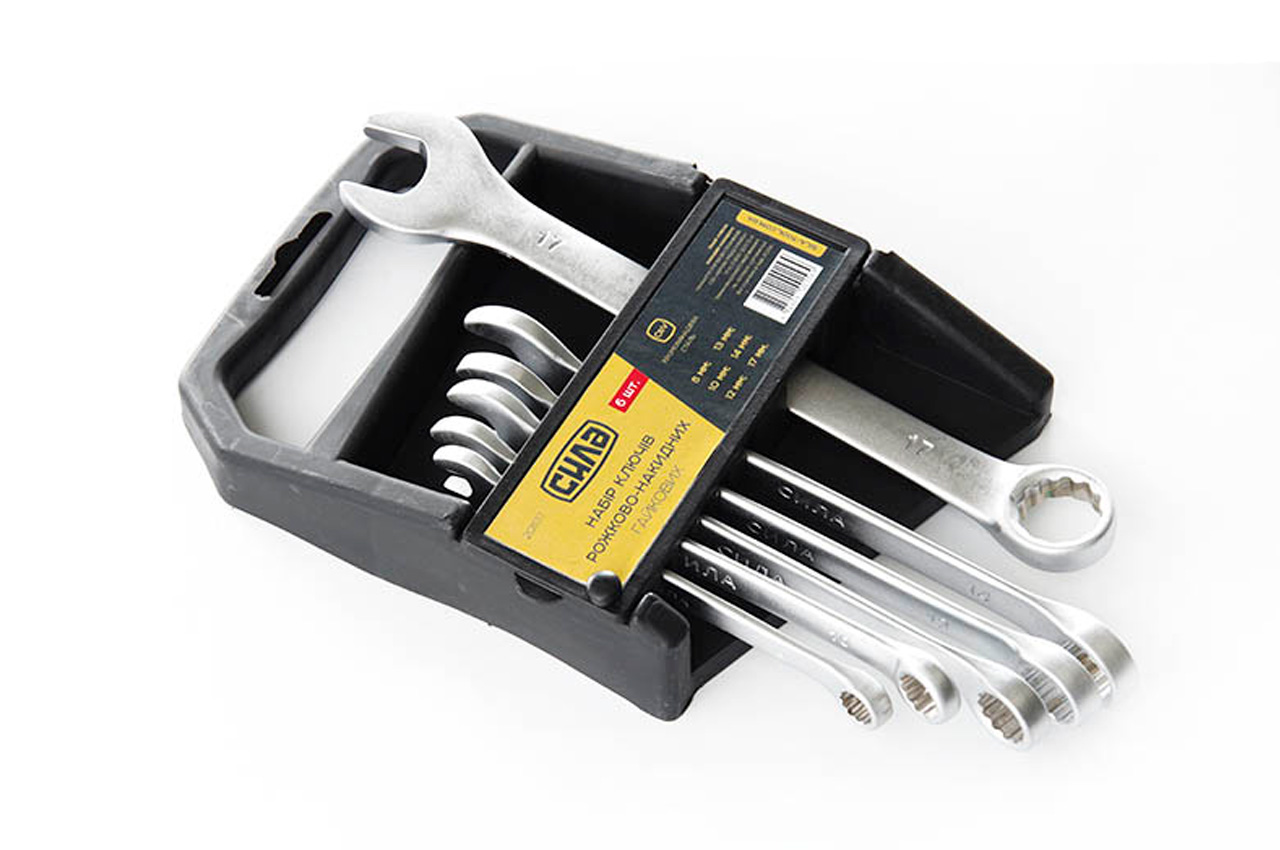 Набір ключів рожково - накидних 6 одиниць, хром-ванадієві, високої якості. Зручна пластмасова упаковка з відділеннями для кожного ключа полегшує їх зберігання. Набір: 8 мм, 10 мм, 12 мм, 13 мм, 14 мм, 17мм