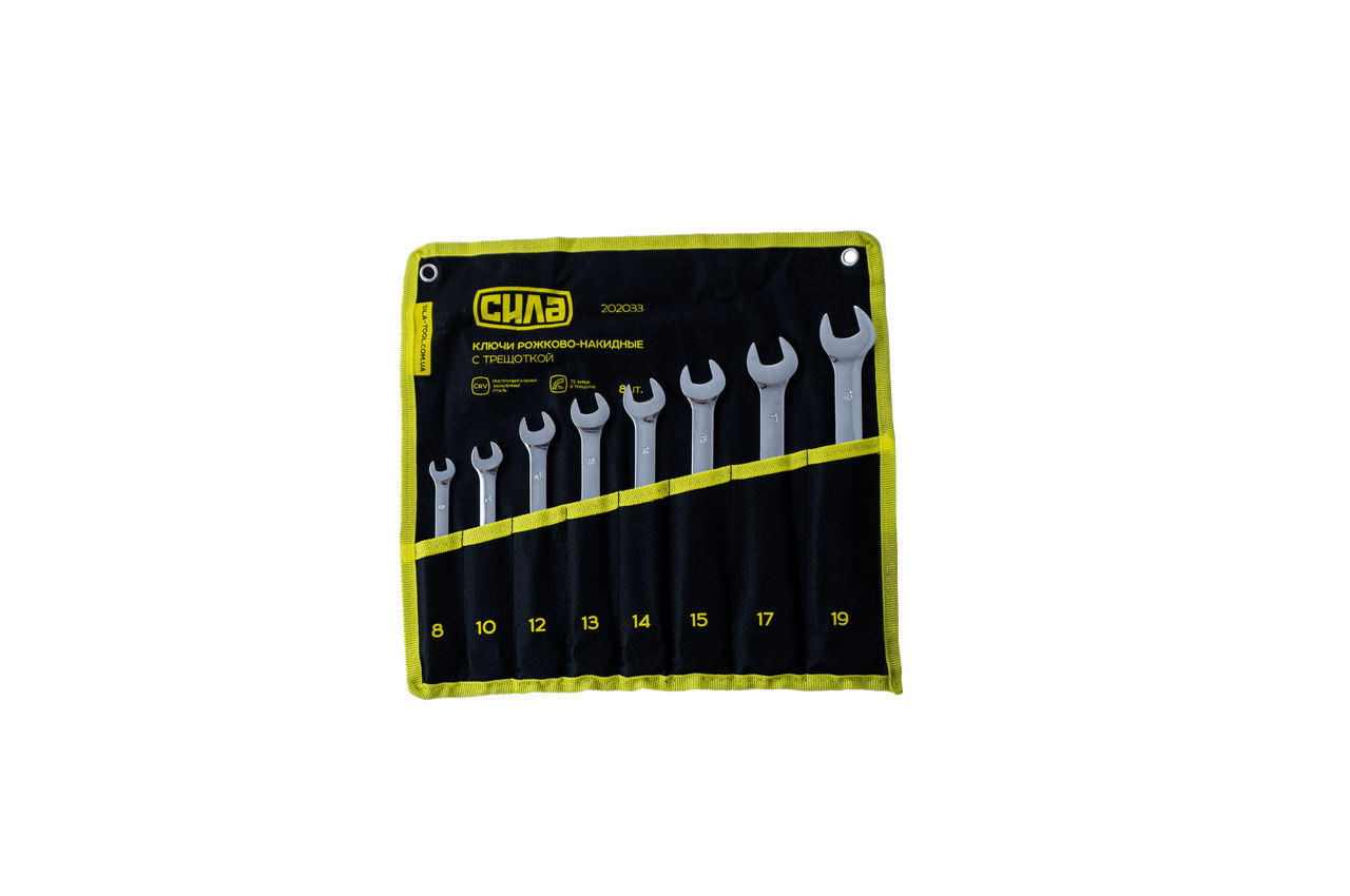 Набір рожково-накидних ключів Сила - 8 шт. (8-19 мм) з трищіткою в чохлі