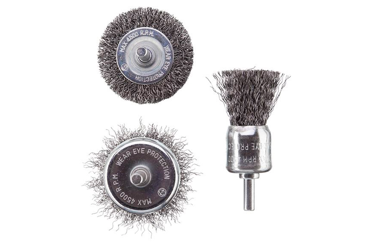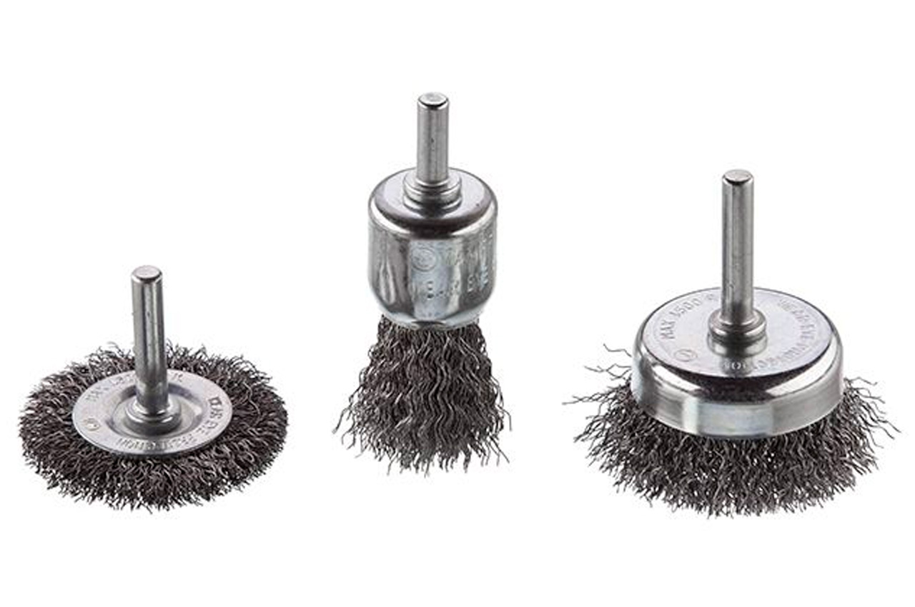 Застосовується длязачісткі поверхонь від лакофарбових покриттів, іржі, окалини і різних забруднень. У наборі 3 щітки: 30 мм - кистевая; 50 мм - торцева; 50 мм - дискова. Хвостовик - 6 мм. Форма щітки: щітка кольцеваящетка чашечнаящетка торцева; Діаметр щітки: 505030 мм; Тип дроту: рифлена дріт; Швидкість обертання: 4500 об / хв; Діаметр дроту: 0.3 мм; Діаметр стрижня: 6 мм; Кількість в упаковці: 3 од .; Застосування: для бетону, дерева і металу