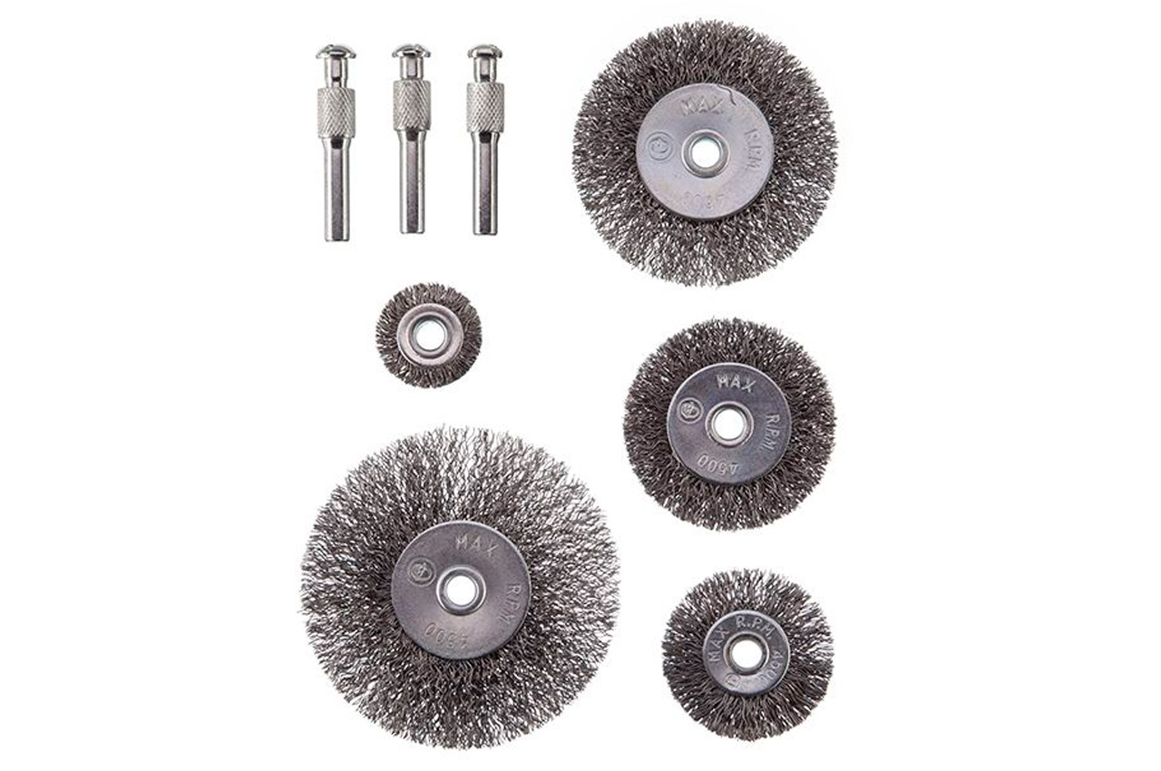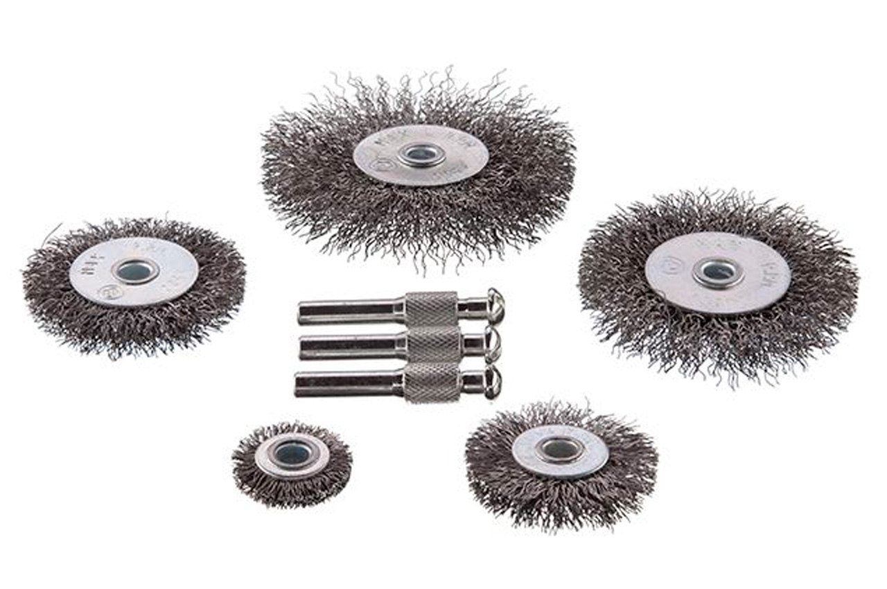 Застосовується длязачісткі поверхонь від лакофарбових покриттів, іржі, окалини і різних забруднень. У наборі 5 дискових щіток: 25, 40, 50, 60 і 75 мм. Діаметр стрижня (3 шт.) - 6 мм. Форма щітки: щітка кільцева; Діаметр щітки: 2540506075 мм; Тип дроту: рифлена дріт; Швидкість обертання: 4500 об / хв; Діаметр дроту: 0.3 мм; Діаметр стрижня: 6 мм; Кількість в упаковці: 5 од .; Застосування: для бетону, дерева і металу