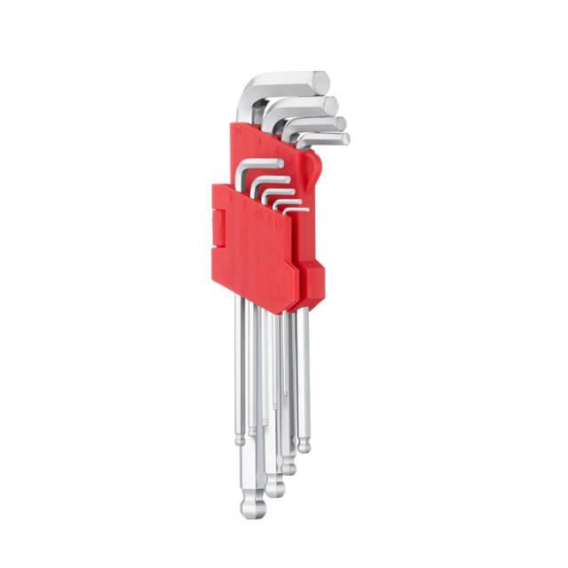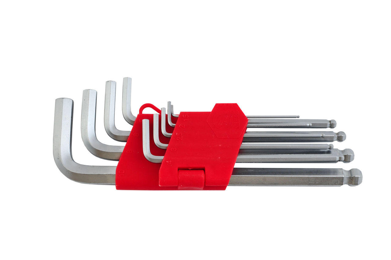 Шестигранники Г-образні шестигранні з кулястим наконечником (9 шт.) На 1.5, 2, 2.5, 3, 3.5, 4, 5, 6 і 8 мм. Виготовлені з хром-ванадієвої сталі. Подовжені. З зручним пластиковим утримувачем. Типи ключів: Г-образні шестигранні з кулястим наконечником; Кількість ключів: 9 од .; Розміри ключів: 1,5-10 мм; Твердість за шкалою Роквелла: 52-55 HRC