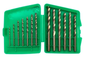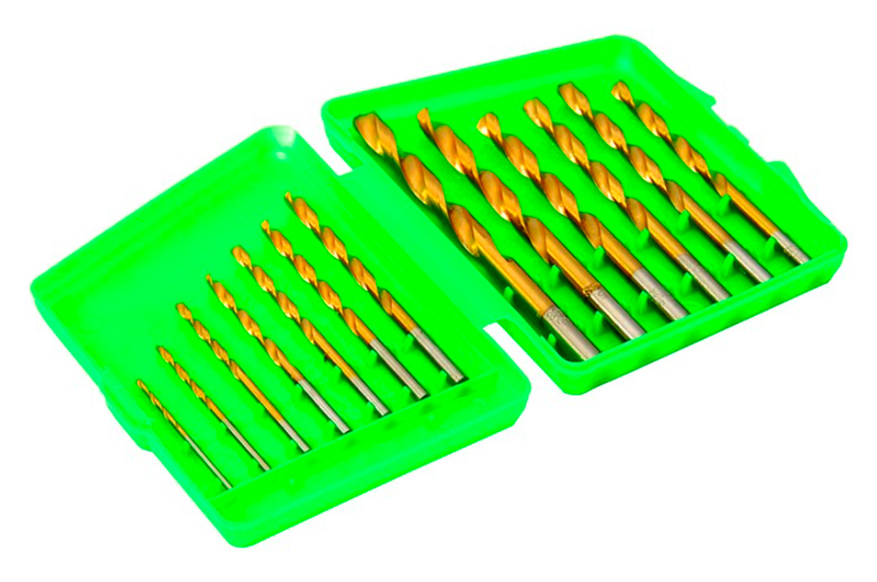 Призначені для просвердлювання отворів різних діаметрів в листовому металі. Що входять до складу наборів спеціальні свердла виготовляються з швидкорізальної сталі. Твердість HRC 60-62. Покриття нітридом титану (TIN) підвищує швидкість свердління до 40%. Кут заточування 118 ˚.