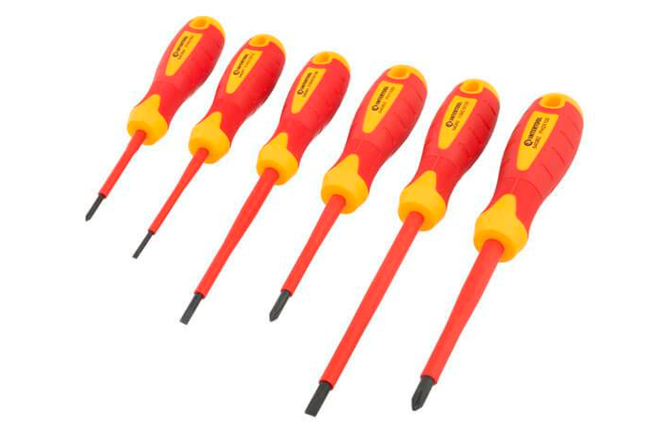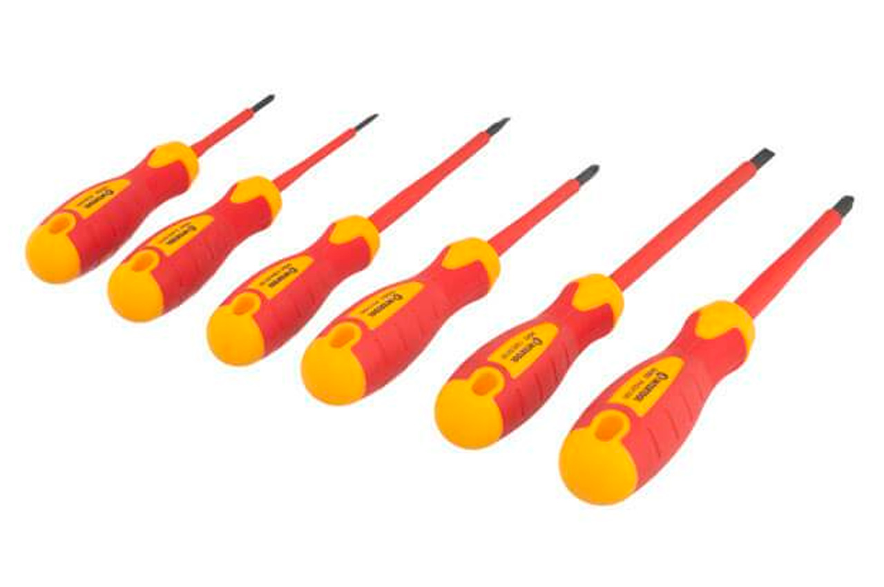 Діелектричне покриття стрижнів викруток забезпечує повний захист від ураження струмом, ізольовані рукоятки зі зручним хватом для надійності проведення робіт. Призначені для робіт з кріпленнями, що знаходяться під напругою до 1000В. Пройшли заводський контроль якості на сертифікованому європейському обладнанні. Виготовлені з Cr-V стали. Комплектація: Викрутки: SL0.4 * 2.5 * 75мм, SL0.8 * 4.0 * 100мм, SL1 * 5.5 * 125мм, PH0 * 60мм, PH1 * 80мм, PH2 * 100мм Кількість в наборі: 6 од .; Робоча довжина: 60, 75, 80, 100, 125 мм; Напруга: 1000 В