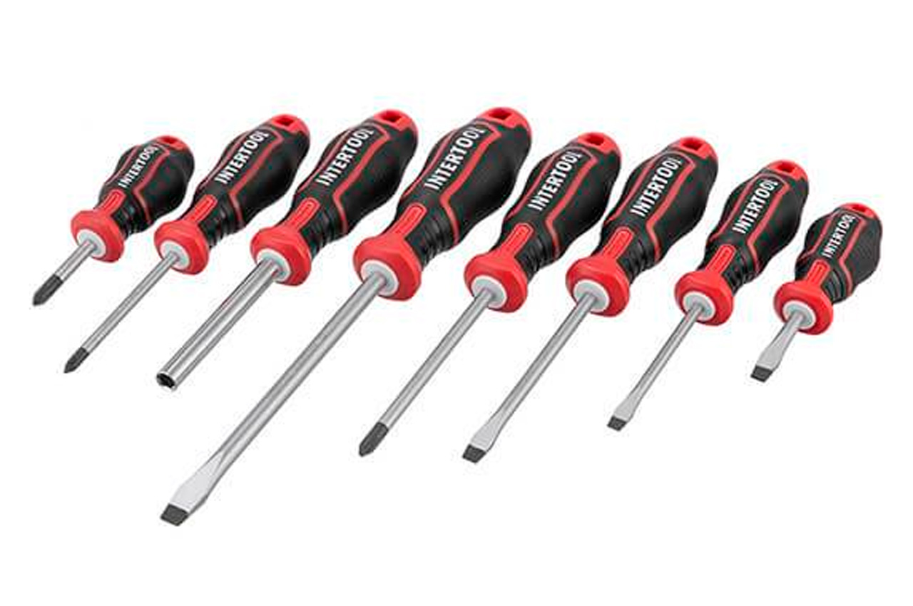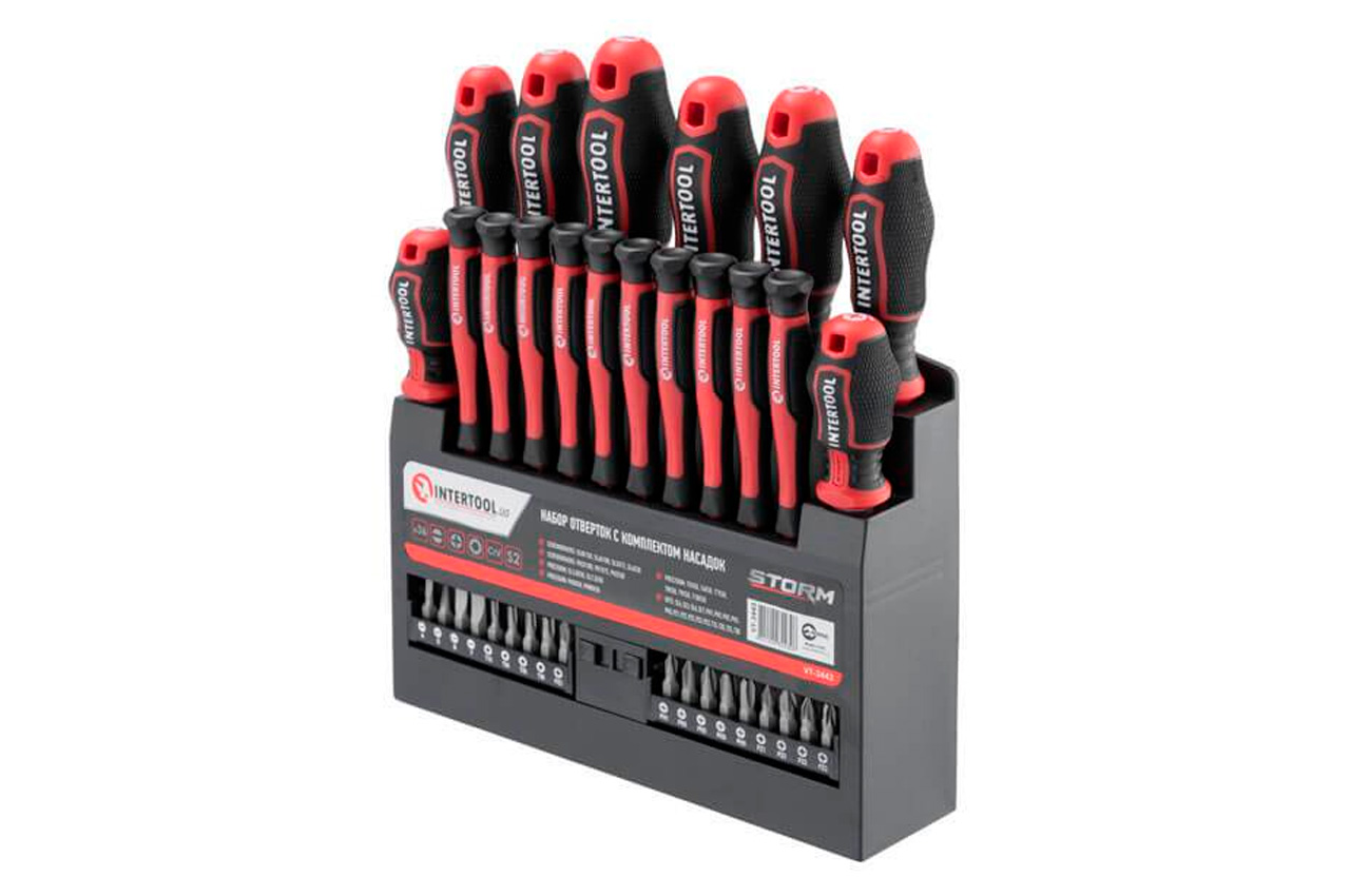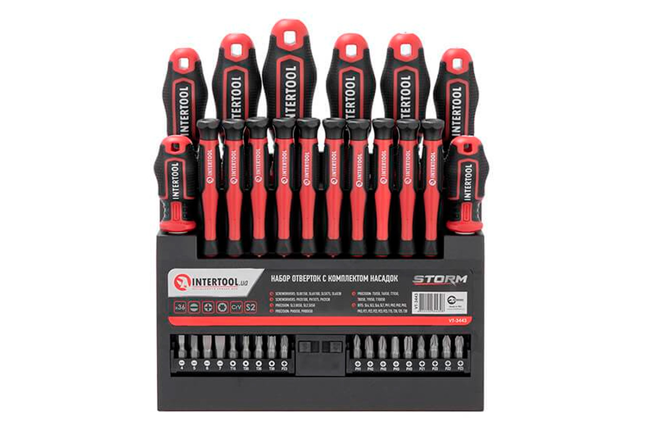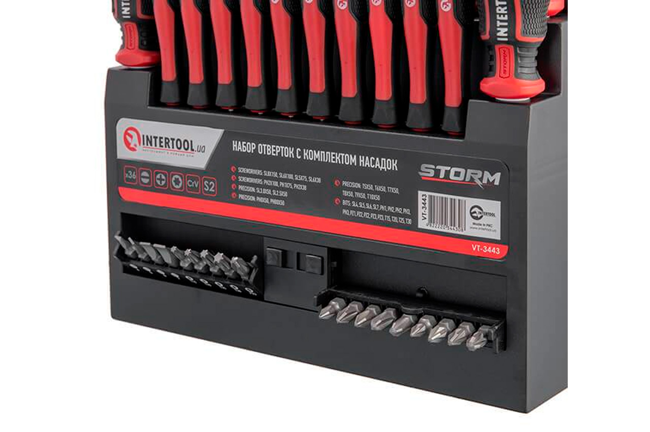 Професійний набір викруток INTERTOOL STORM виготовлений за останніми технологіями і відповідає високим запитам майстрів. Викрутки призначені для інтенсивної роботи на СТО, в майстернях, в точках сервісного обслуговування і в інших галузях, де необхідно проводити постійні роботи з використанням високих навантажень. Також цей набір стане відмінним помічником в домашньому арсеналі інструмента і прослужить Вам довгі роки! Стрижень викрутки виготовлені з надміцної сталі S2, яка вважається найкращою у своєму сегменті. Форма ручок забезпечує максимальну ефективність від докладеного зусилля. Трикомпонентна рукоятка виготовлена з термопластичної гуми (TPR) і гарантує комфорт при роботі навіть вологими чи слизькими руками. Всі викрутки набору розташовані на спеціальній планці-тримачі, яка може кріпитися на стіну завдяки наявності двох викруток на задній кришці. Під кожну біту призначено окремий паз у тримачі з персональним маркуванням, яке дозволить швидко знайти потрібну насадку. Комплектація Викрутки: SL8*150 мм, SL6*100 мм, SL5*75 мм, SL6*38 мм, SL3, SL2, PH2*100 мм, PH1*75 мм, PH2*38 мм Прецизійні викрутки: SL3*50 мм, SL2.5*50 мм, PH0*50 мм, PH00*50 мм, T5*50 мм, T6*50 мм, T7*50 мм, T8*50 мм, T9*50 мм, T10*50 мм Біти: SL4, SL5, SL6, SL7, PH1, PH2х2, PH3х2, PZ1, PZ2х2, PZ3х2, T15, T20, T25, T30