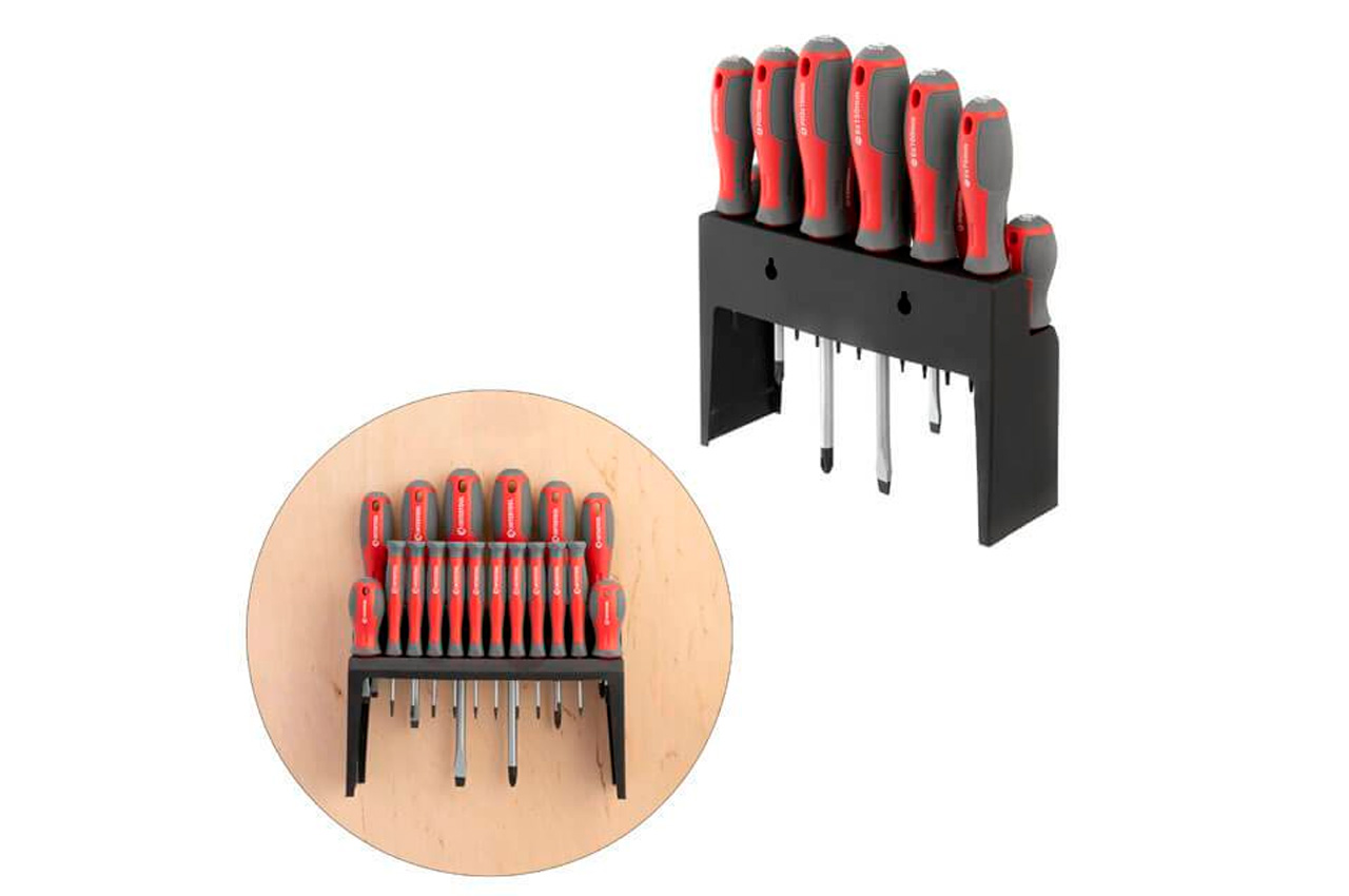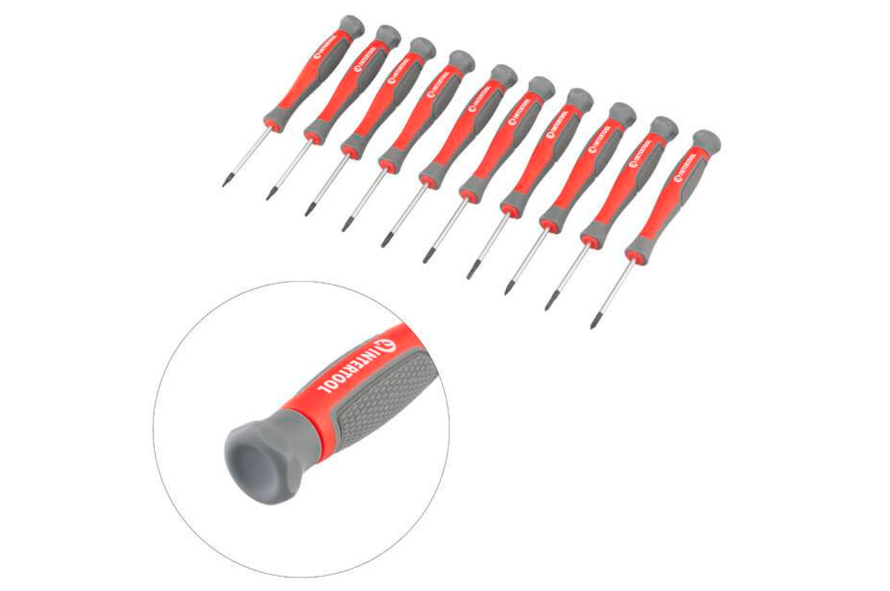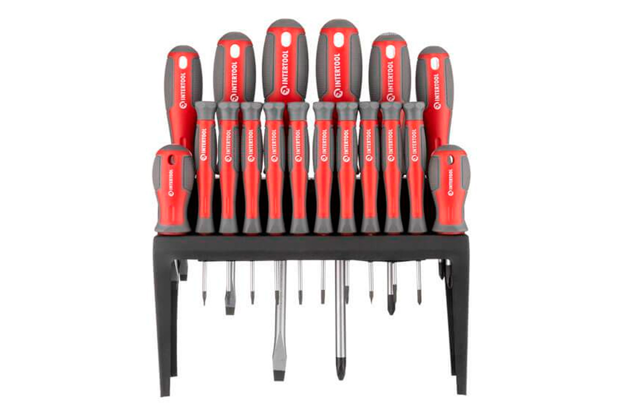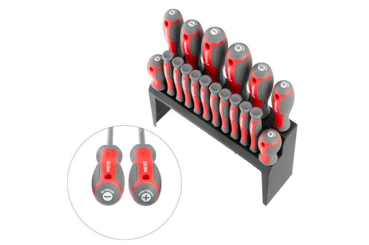 Набір викруток виготовлений за останніми технологіями і відповідає високим запитам майстрів. Призначений для монтажу і демонтажу різьбових з'єднань з типом шліца: SL2,5, SL3, SL5, SL6, SL8, PH0, PH1, PH2, PH3, T5, T6, T7, T8, T9, T10. Комплект стане відмінним помічником в домашньому арсеналі інструменту, а також у власній майстерні, на виробництві. Висока якість стали Стрижень викруток виготовлений з міцної Cr-V стали, яка відома всім майстрам своєю надійністю і витривалістю. У складі цієї стали присутні хром і ванадій, які надають виробу високу стійкість до зношування. Також сталь відрізняється довговічністю і не схильна до крихкого руйнування. Конструкція викруток продумана до дрібниць Стрижень глибоко посаджений в рукоятку і кріпитися в двох місцях, що виключає можливість зриву. Намагнічений наконечник Викрутки мають посилений магнітний наконечник, який утримує кріплення і полегшує роботу в важкодоступних місцях. Зручна рукоятка Форма ручок забезпечує максимальну ефективність від прикладеного зусилля. Прорезиненная двокомпонентна рукоятка зручно лежить в руці і не вислизає з долоні. Яскрава маркування на кінці рукоятки дозволяє швидко знайти необхідний тип і розмір викрутки. Викрутки укомплектовані в спеціальний утримувач для зберігання. Ви можете поставити набір на будь-який стіл або полицю, а також підвісити на стіну (передбачені отвори для кріплення). Комплектація Викрутки: SL2.5 * 50мм, SL3 * 50мм, SL5 * 75мм, SL6 * 38мм, SL6 * 100мм, SL8 * 150мм, PH0 * 50мм, PH00 * 50мм, PH1 * 75мм, PH2 * 38мм, PH2 * 100мм, PH3 * 150мм, T5 * 50мм, T6 * 50мм, T7 * 50мм, T8 * 50мм, T9 * 50мм, T10 * 50мм Матеріал рукояток: TPR гума; Довжина викрутки: 38, 50, 75, 100, 150 мм; Кількість в наборі: 18 од .; Матеріал стержня викрутки: Cr-V сталь